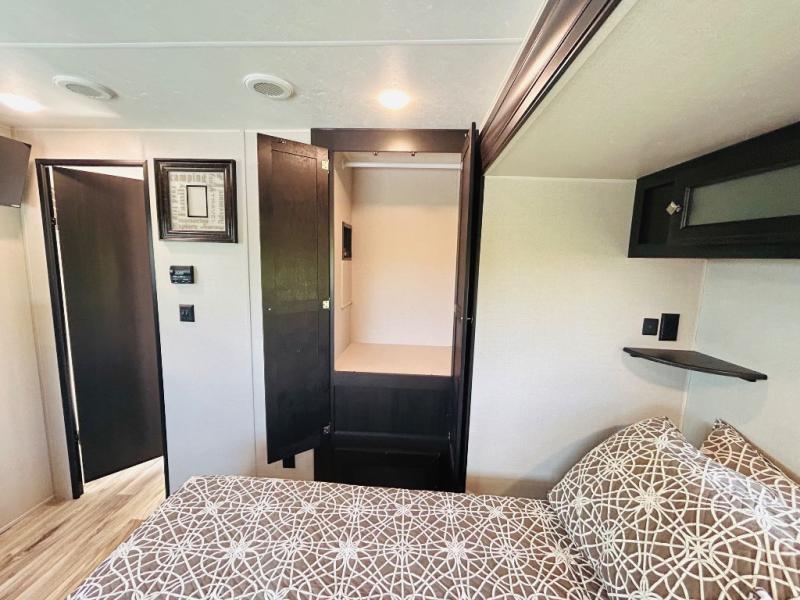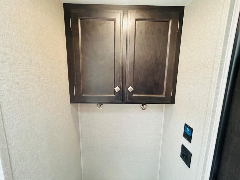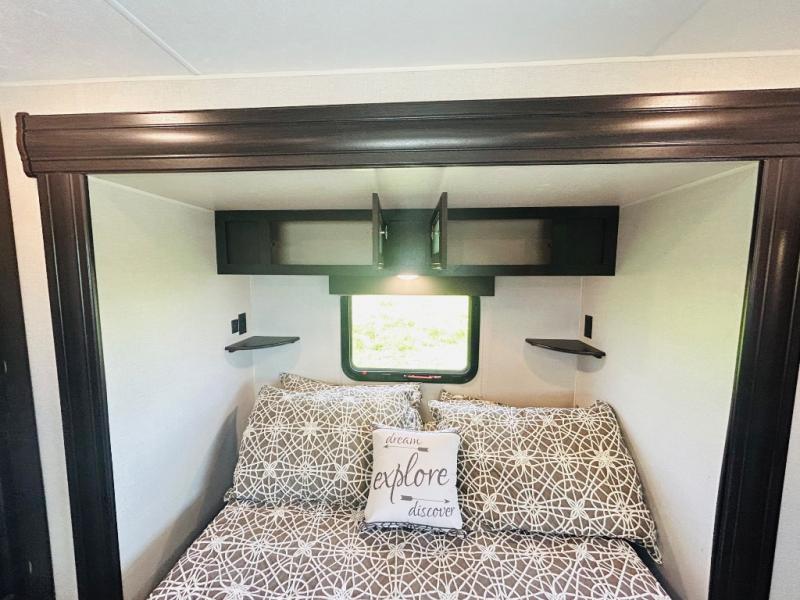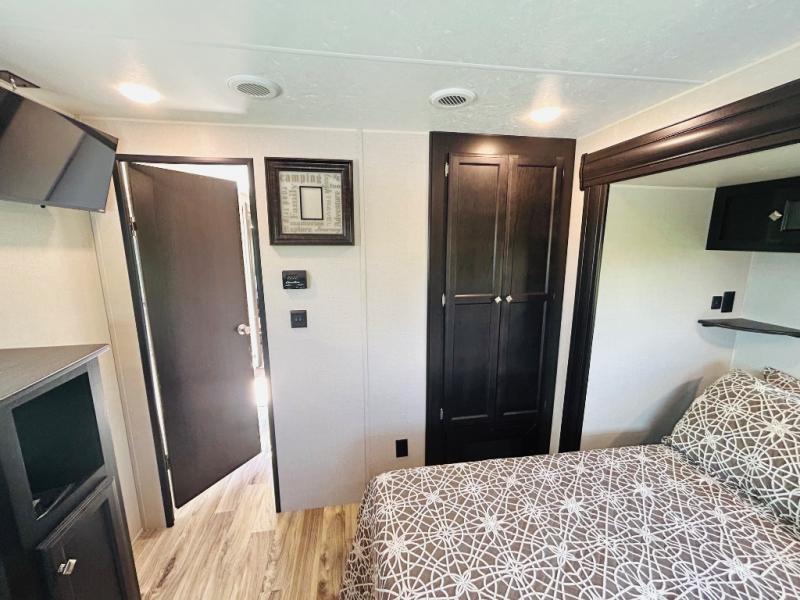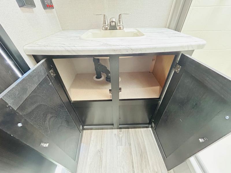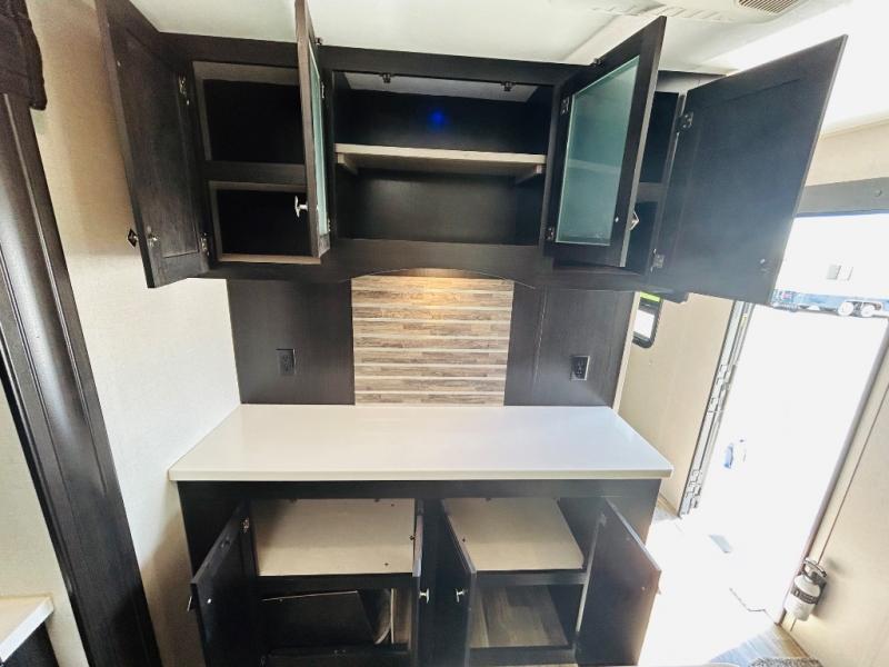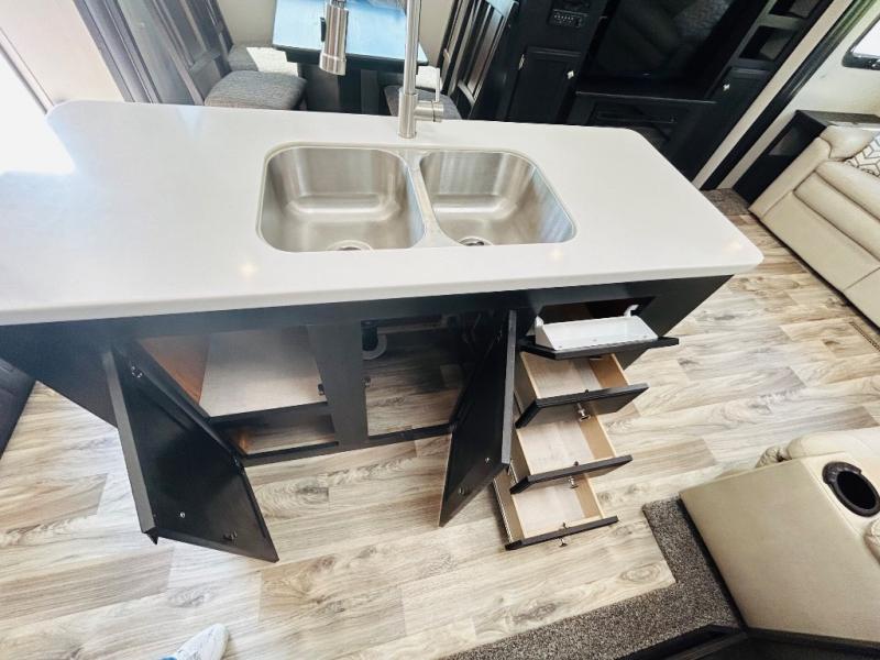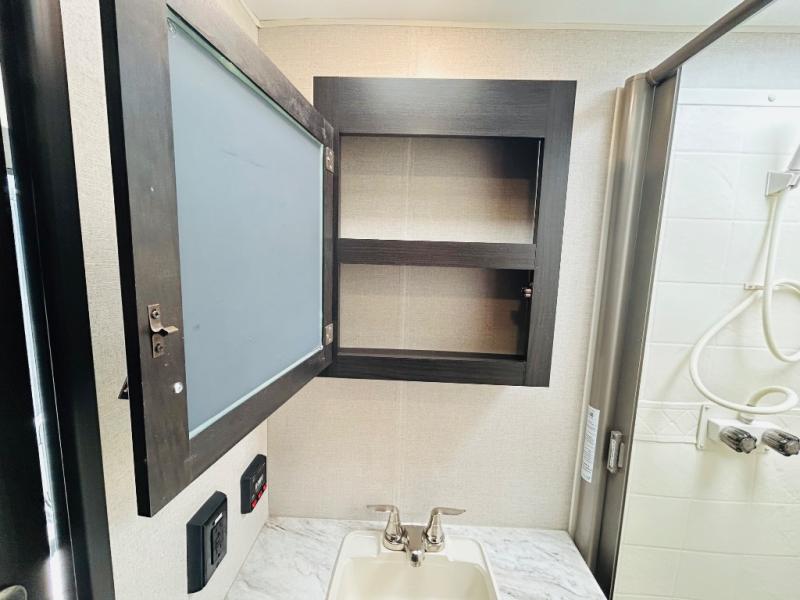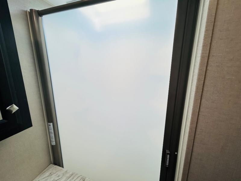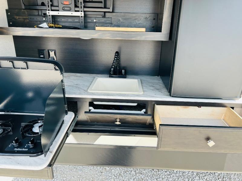 Pack your bags and hitch up this travel trailer for a great weekend camping trip! The front private bedroom has a 70" x 80" sleep tight king bed slide to lay your head at night, a dresser with a 30" frameless fireplace, a window seat with shelves on either side for your books, and a wardrobe that is prepped to add an optional washer and dryer for an extended trip. Freshen up each morning in the full bathroom with the 30" x 36" shower then head to the kitchen to fry up some eggs on the three burner cooktop and pour a cold glass of orange juice stored in the 10 cu. ft. refrigerator. The kitchen island will make your meal prepping easier and the table and chairs offer a comfortable place to enjoy your meals or play card games. You could even cook your meals at the exterior campfire café and set up a table underneath one of the two power awnings!