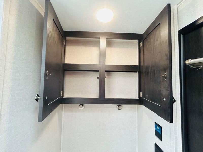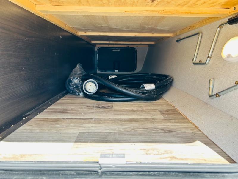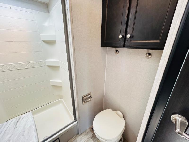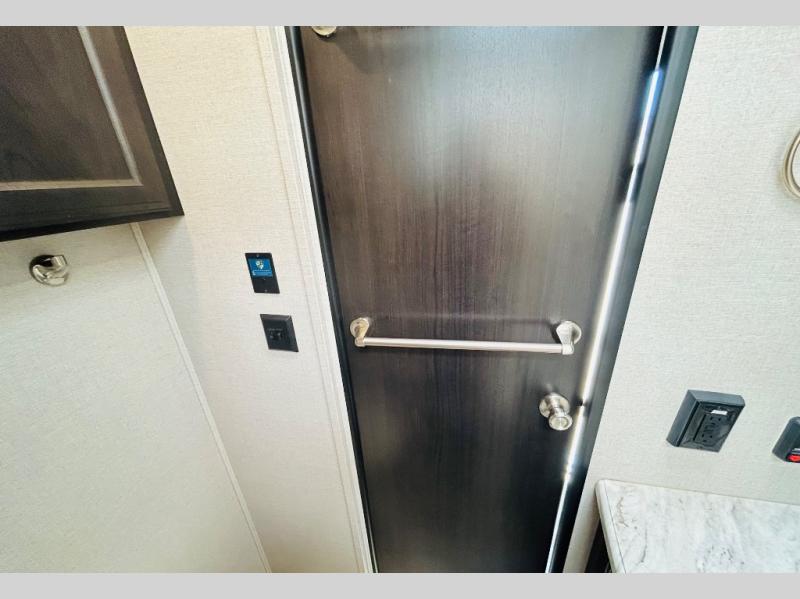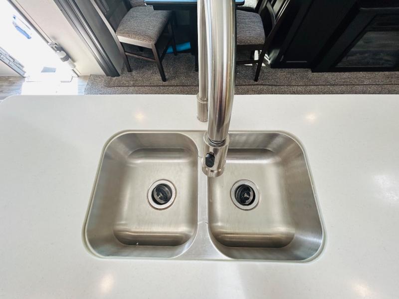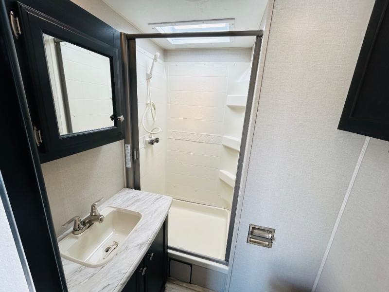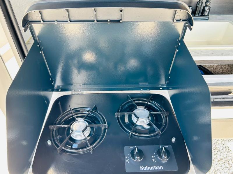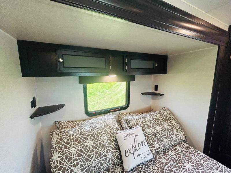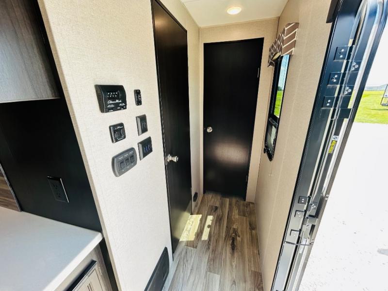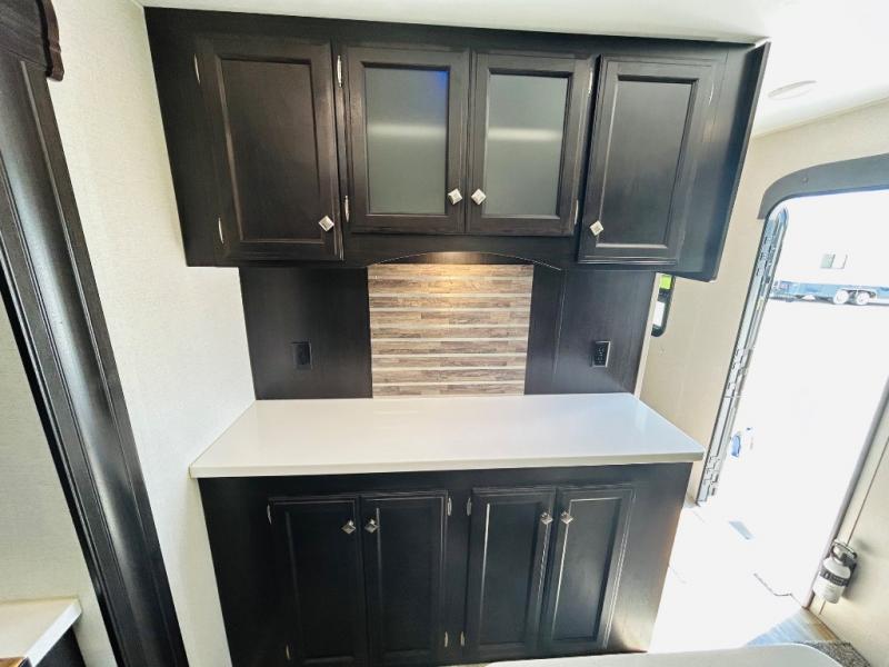 Pack your bags and hitch up this travel trailer for a great weekend camping trip! The front private bedroom has a 70" x 80" sleep tight king bed slide to lay your head at night, a dresser with a 30" frameless fireplace, a window seat with shelves on either side for your books, and a wardrobe that is prepped to add an optional washer and dryer for an extended trip. Freshen up each morning in the full bathroom with the 30" x 36" shower then head to the kitchen to fry up some eggs on the three burner cooktop and pour a cold glass of orange juice stored in the 10 cu. ft. refrigerator. The kitchen island will make your meal prepping easier and the table and chairs offer a comfortable place to enjoy your meals or play card games. You could even cook your meals at the exterior campfire café and set up a table underneath one of the two power awnings!