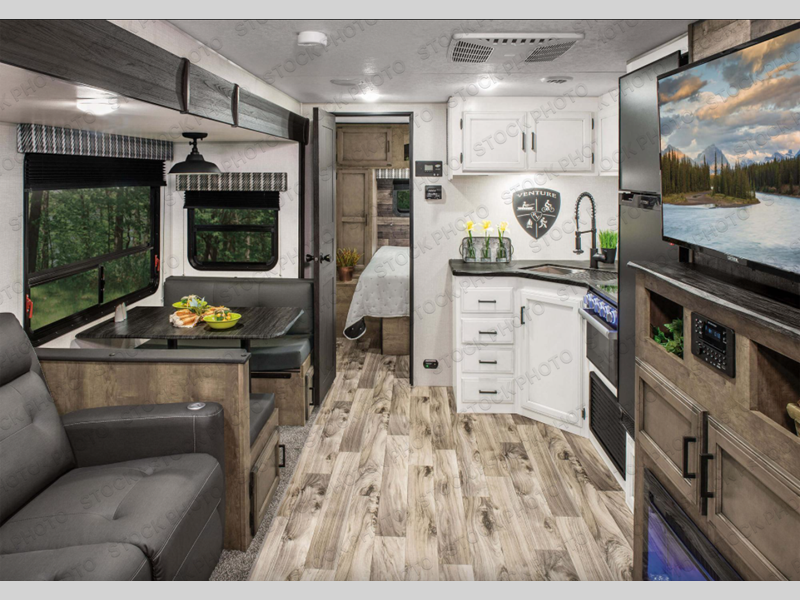 The whole family will have a fun time camping in this travel trailer! You will appreciate having your own privacy with the front private bedroom that has a sleep tight queen bed to lay your head at night and wardrobes on either side to hang your clothes. The kids can sleep on the set of 51" x 75" double bed over double bunk beds and can even invite a friend or two to tag along and sleep on either the 70" sofa or the 42" booth dinette once they are converted. Everyone can freshen up in the rear corner bathroom with the 30" x 36" shower. Behind the entertainment center is a walk-in pantry with coat hooks so you can store your jacket and canned goods in one place. The chef will enjoy cooking at the outside campfire café with the griddle, the refrigerator, and the sink!