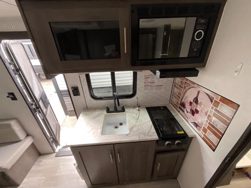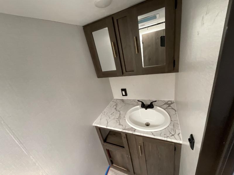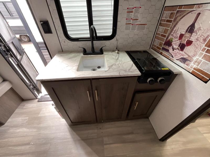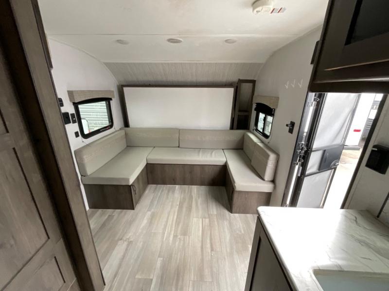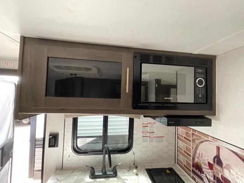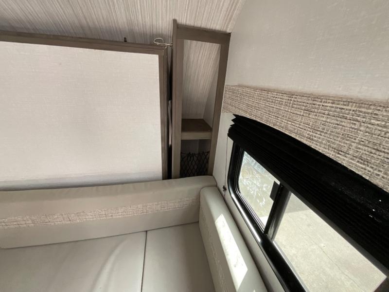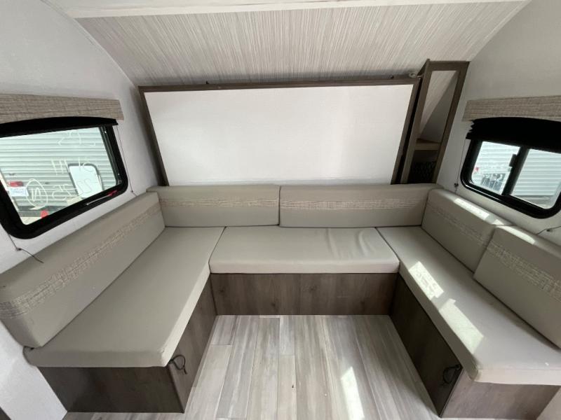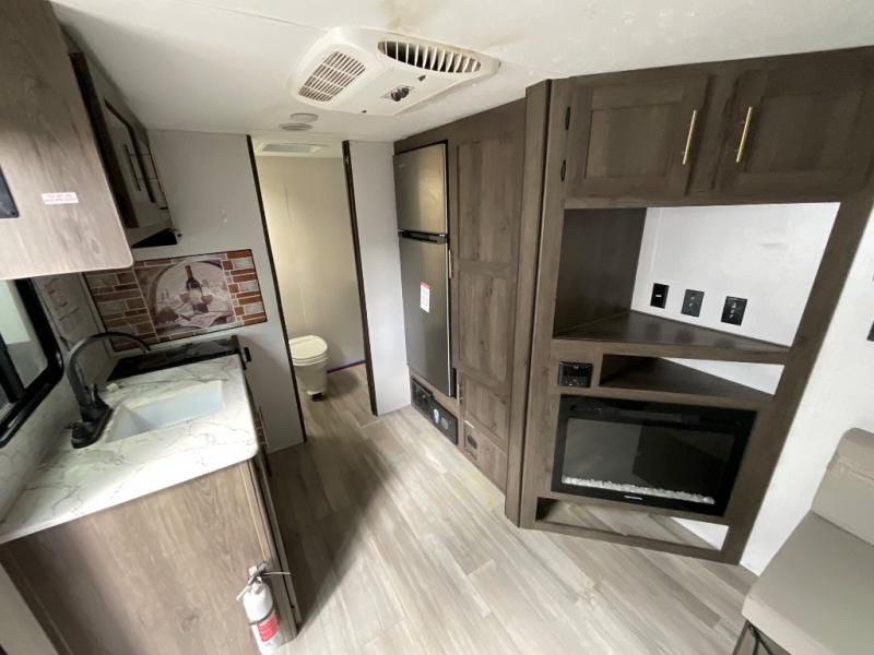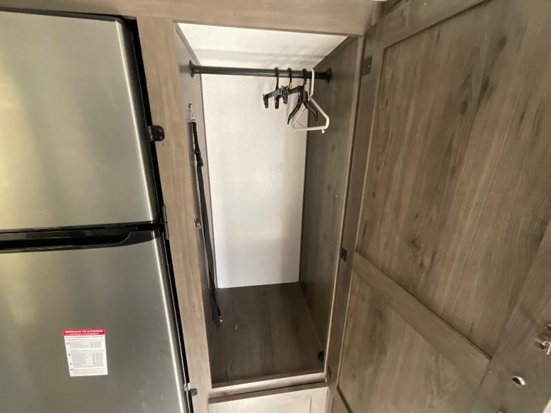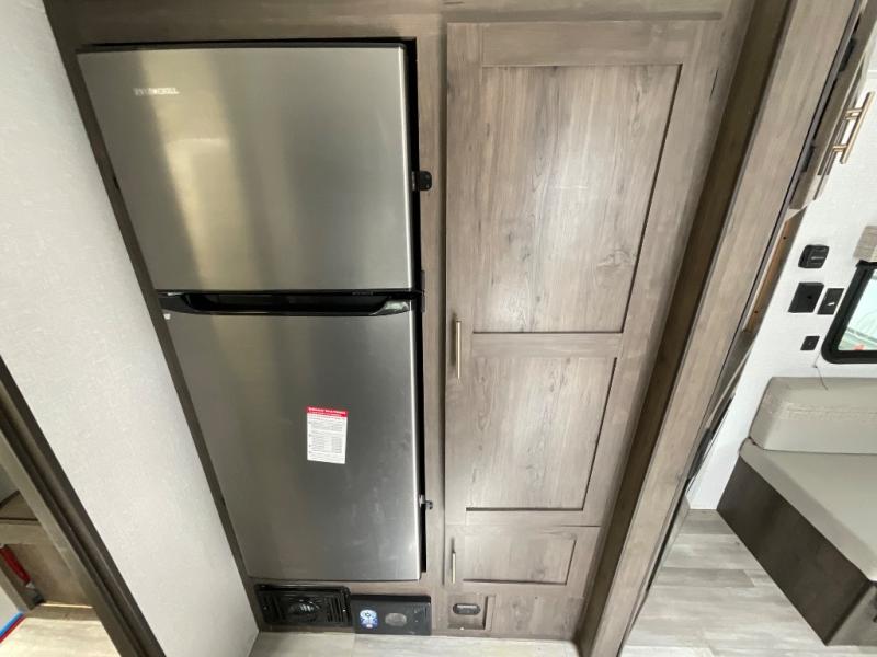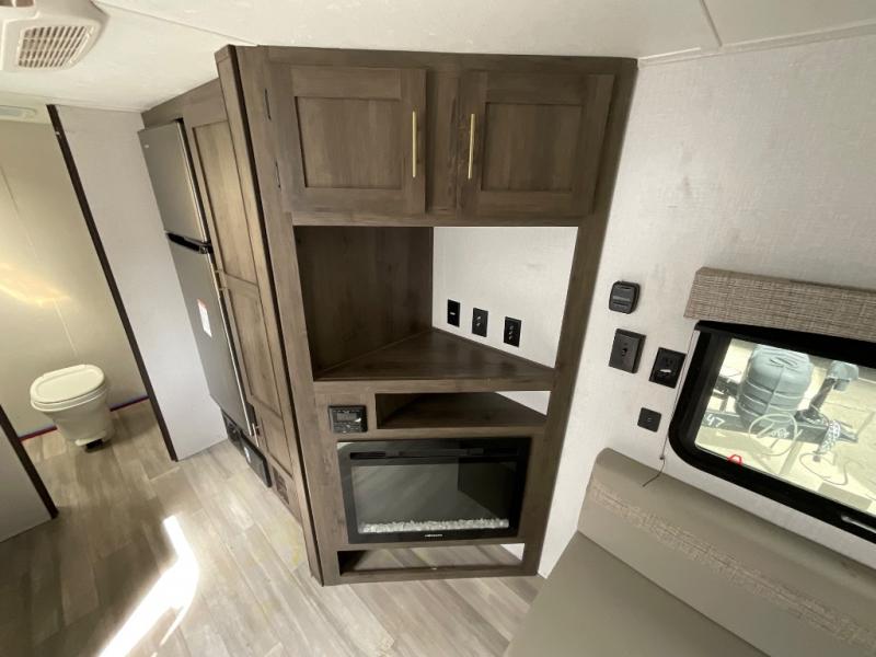 Camping in this single-axle will just feel right with its full bath, comfortable sleeping space, and plenty of storage space for your belongings. Each morning you can fold up the Murphy bed so you can enjoy breakfast around the U-shaped dinette, then freshen up in the full bath before heading out for the day. There is a 7 cu. ft. gas/electric refrigerator and a pantry for store your food for the weekend, and a front wardrobe by the bed to keep your clothes in order. This model also incudes an entertainment center where you can add an optional fireplace!