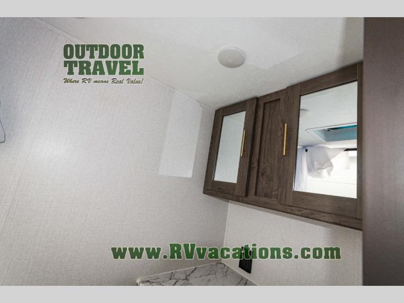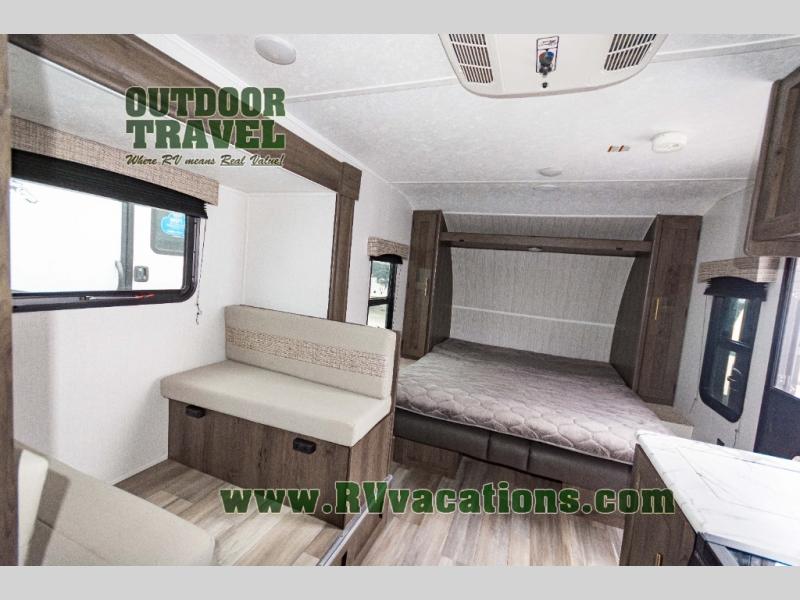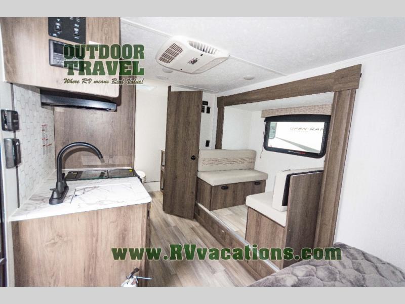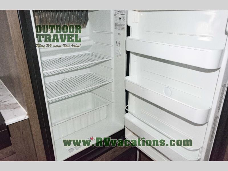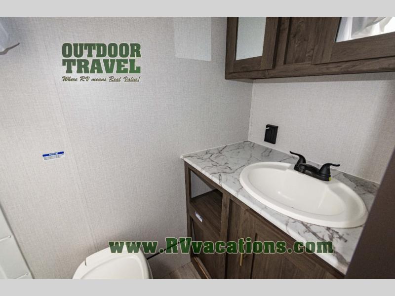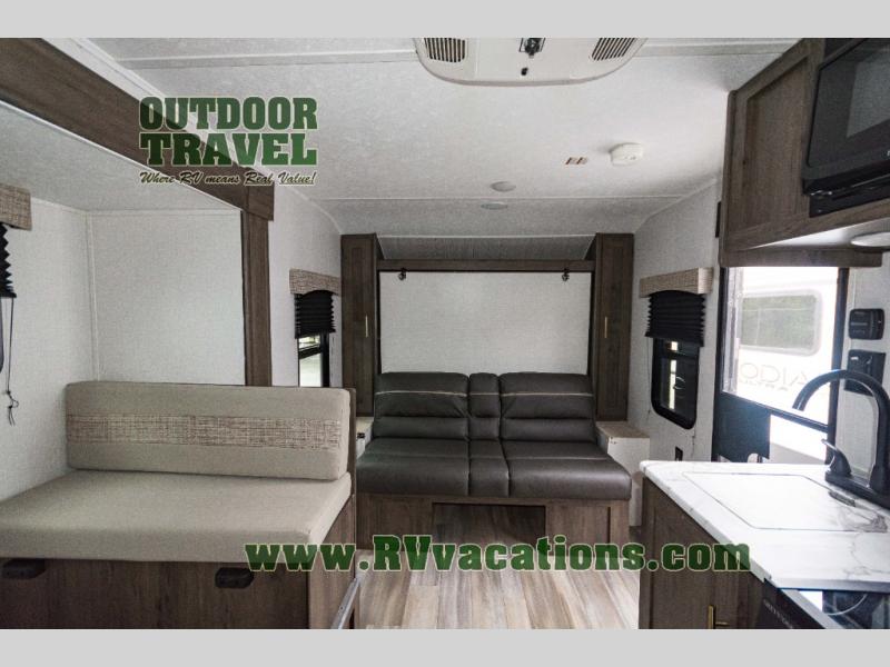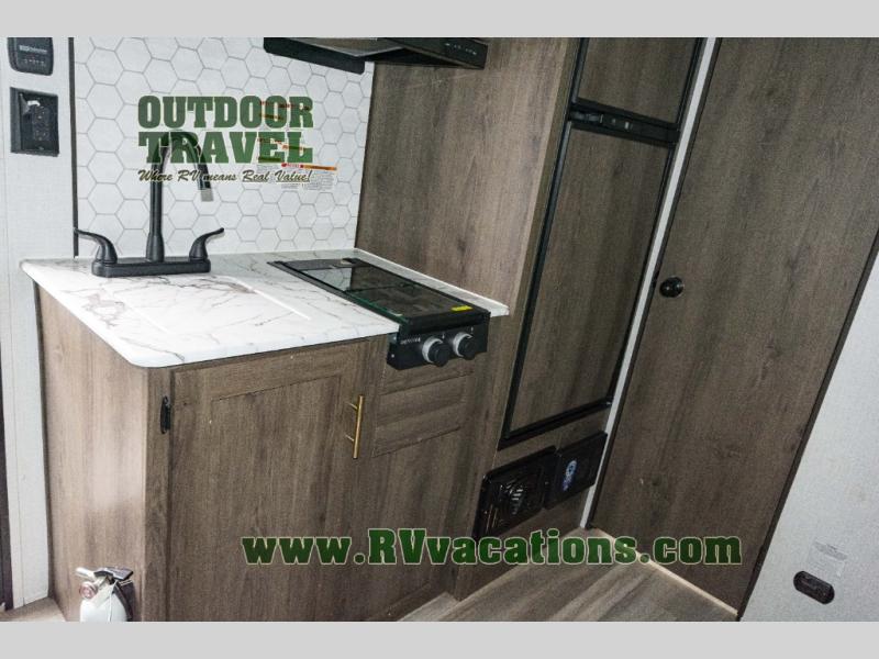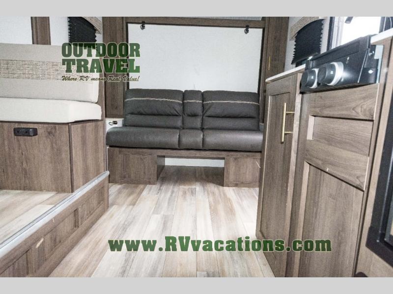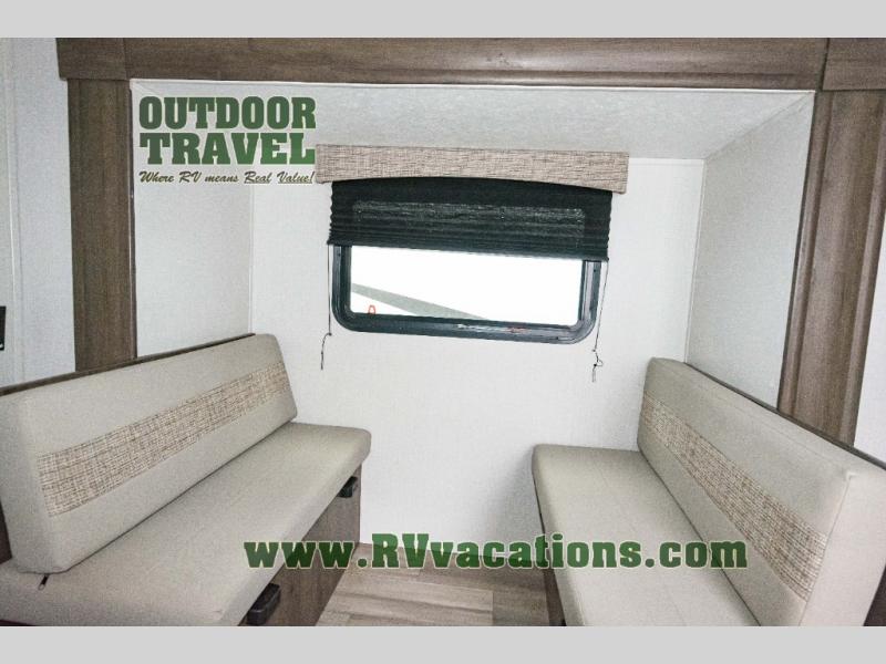 Looking for more interior space in your next trailer? This is the perfect couples trailer with a slide out booth dinette, a walk-around queen bed, and a rear full bathroom! Yet you might like to choose the Murphy Bed option instead if you prefer having a sofa during the daytime and a bed that folds up into the wall. The cook will have everything at their fingertips including a two burner range. You can relax outdoors protected by the elements under the 12' power awning, and you will find storage along the exterior as well. You might even like to choose the sofa slide out option in place of the dinette, the choice is yours!