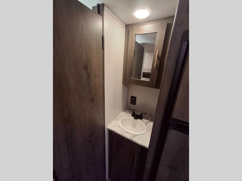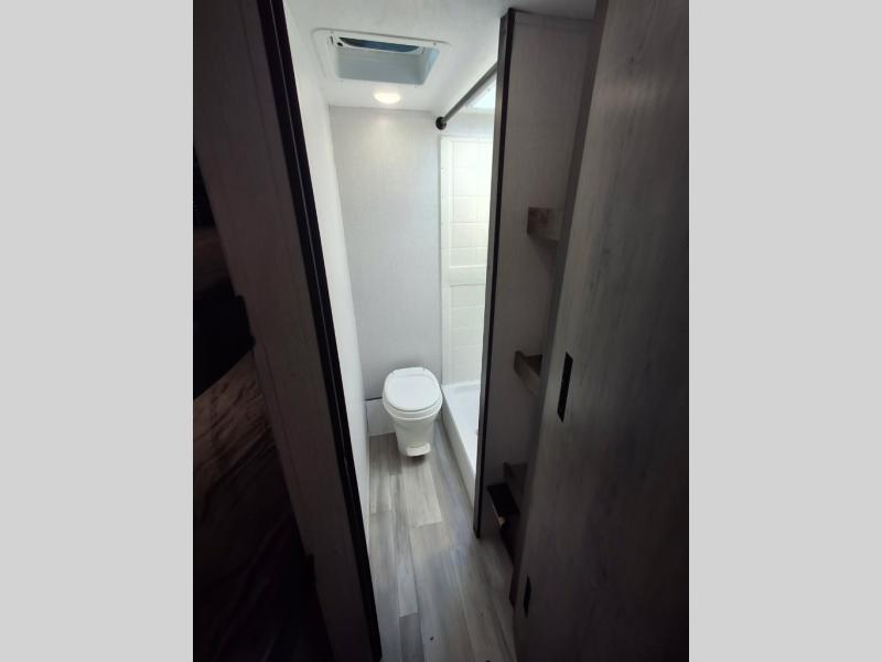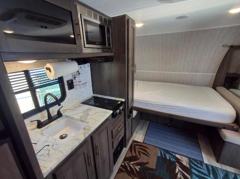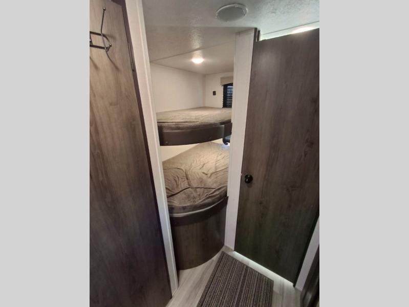 You and your family or friends will experience versatile living with a front Murphy bed located behind the U-shaped dinette with a free-standing table, and the bed can be pulled down after you have enjoyed your dinner and played a few card games at the dinette. And the kids or your guests will love the bunk beds! There is a private shower and toilet room which includes a linen closet to keep your towels, plus the vanity is just outside of the bathroom for your convenience. The kitchen offers full amenities, plus a pantry with upper bunk storage, and the cook can make meals using the outside kitchen as well.