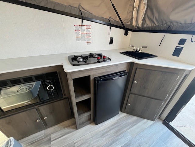 This Express Series folding pop-up camper is an amazing choice for easy camping trips! It offers you a 54" x 74" bed to rest, a wardrobe to store your clothes, an outside shower to rinse off your feet, and a microwave to cook your food. The one-piece screen door can be used to prevent bugs from flying in while you allow some fresh air to breeze through, and the Bluetooth stereo will provide you with some entertainment while you're relaxing.