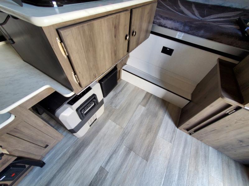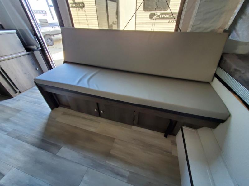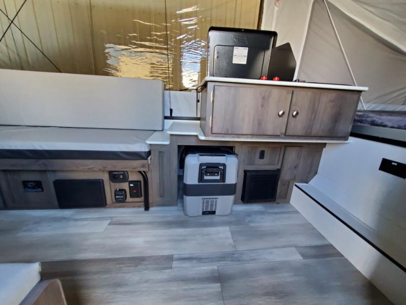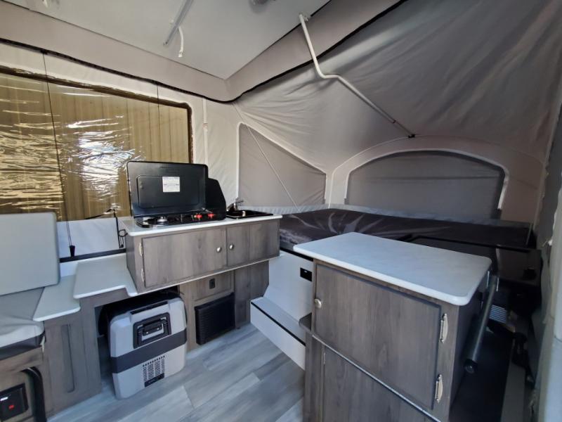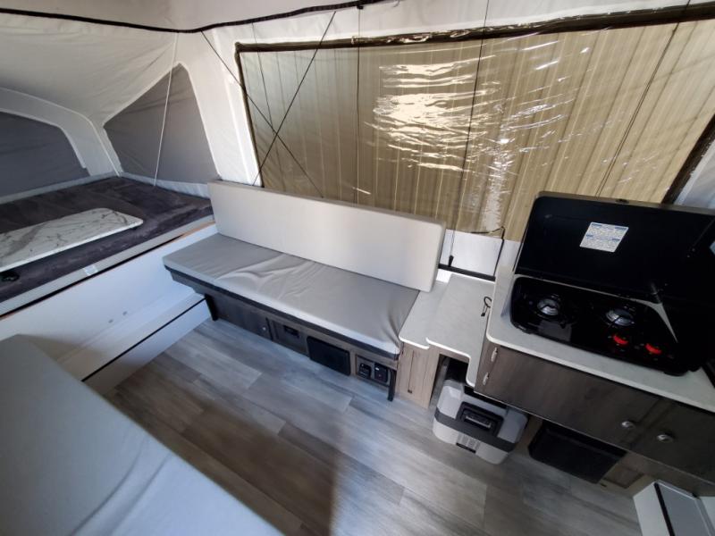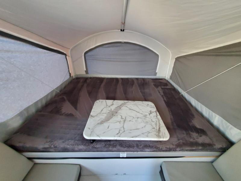 You will find comfort features all throughout this folding pop-up camper! The queen tent end insulated beds supported by Glide-N-Lock cables offer a comfortable night's rest, and you can even transform the two opposing 70" gaucho sofas into an extra sleeping space. Enjoy home cooked meals with the two burner high output range, cold beverages with the 120 watt/12V refrigerator/freezer cooler, and an easy clean up with a deep acrylic sink bowl. The new exterior style storage and shroud lets you bring more items to the campsite and the exterior awning will protect you rain or shine!