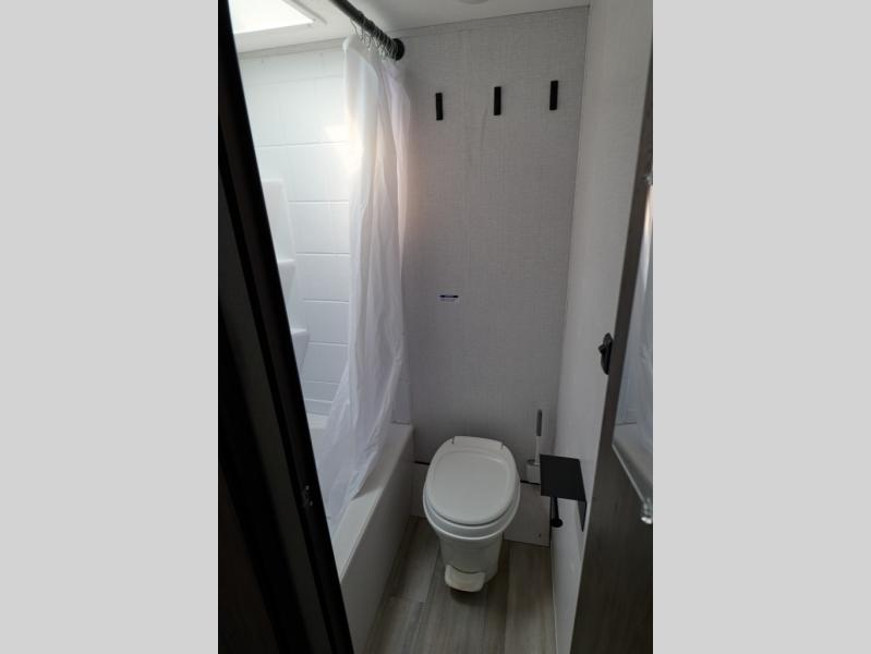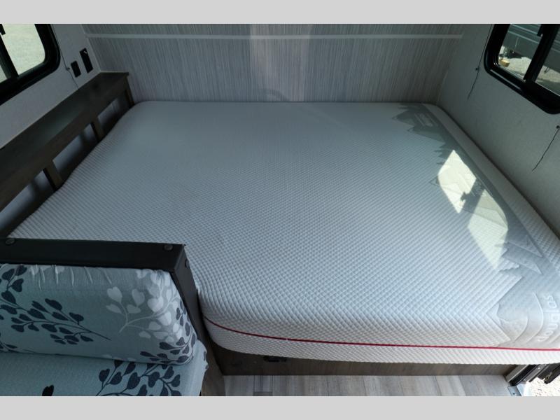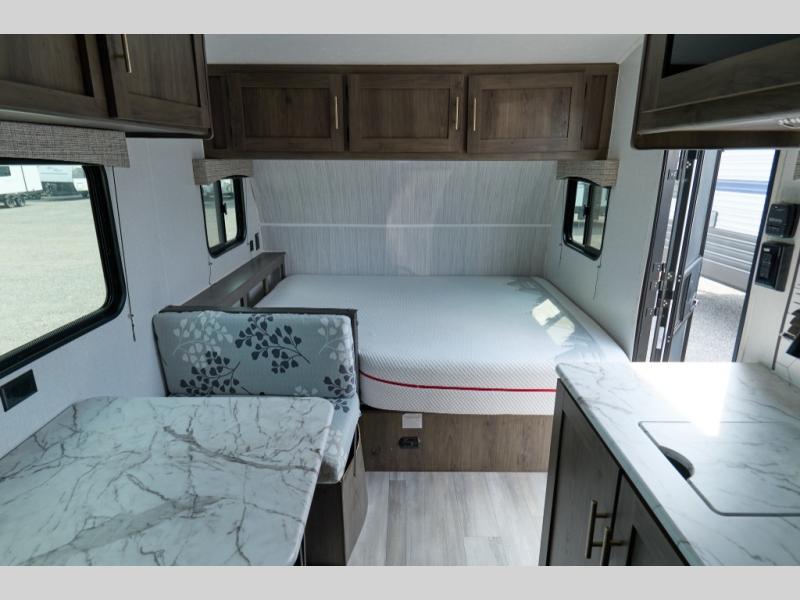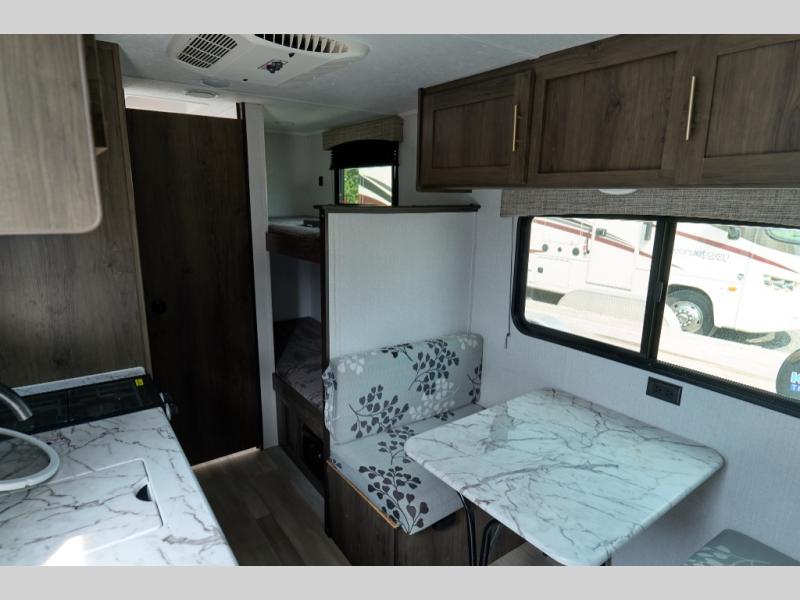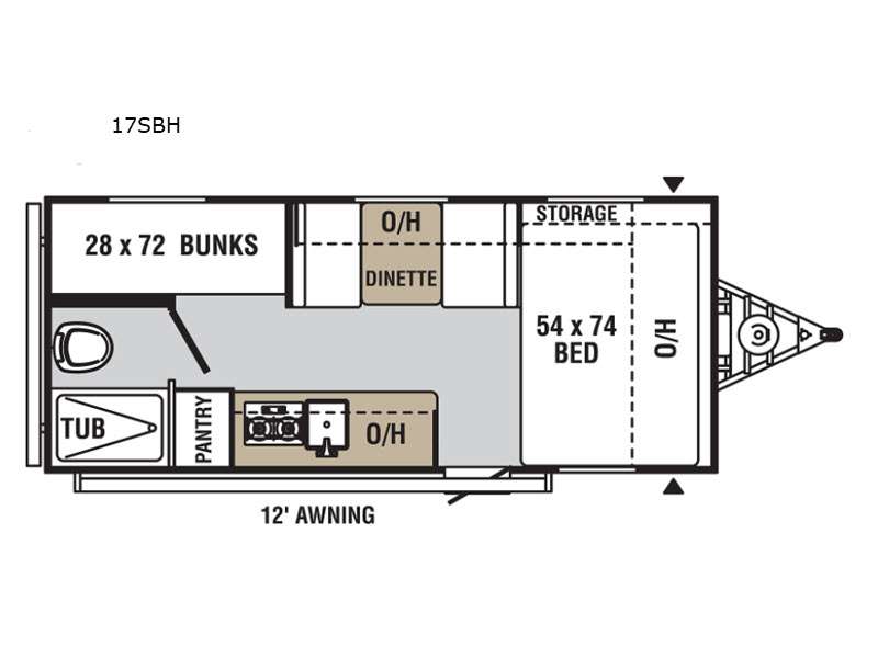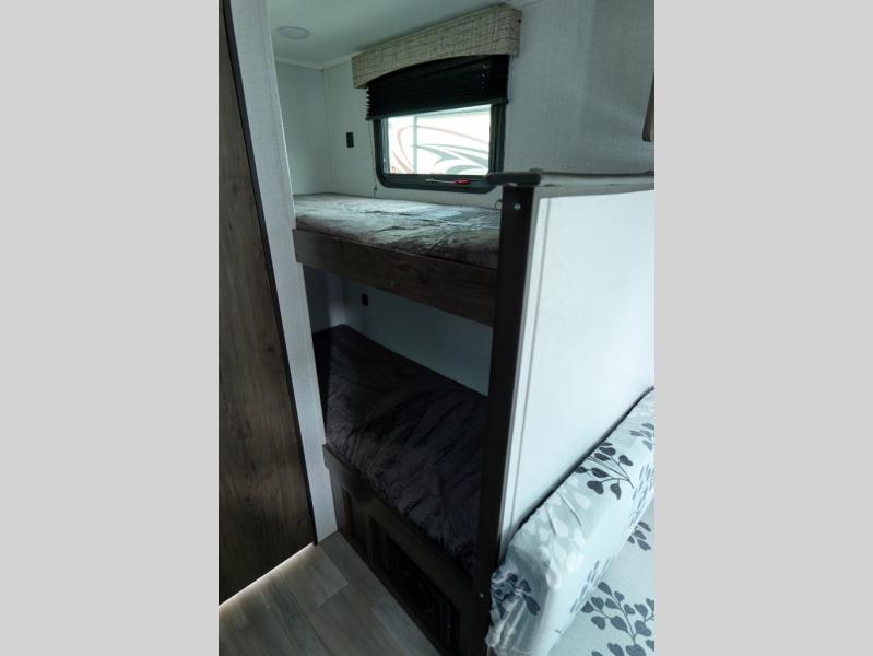 This is the perfect travel trailer for the family since it includes bunk beds for the kids, and a full-size bed up front for mom and dad. There is a two burner range to cook meals on, and a sink to clean up each day. You can dine at the booth dinette or take your plate outdoors to sit under the 12' oversized power awning. This model also includes a shower/tub to get cleaned up each day, and a shower skylight for more standing space. Get an early start on family vacations with this travel trailer in tow!