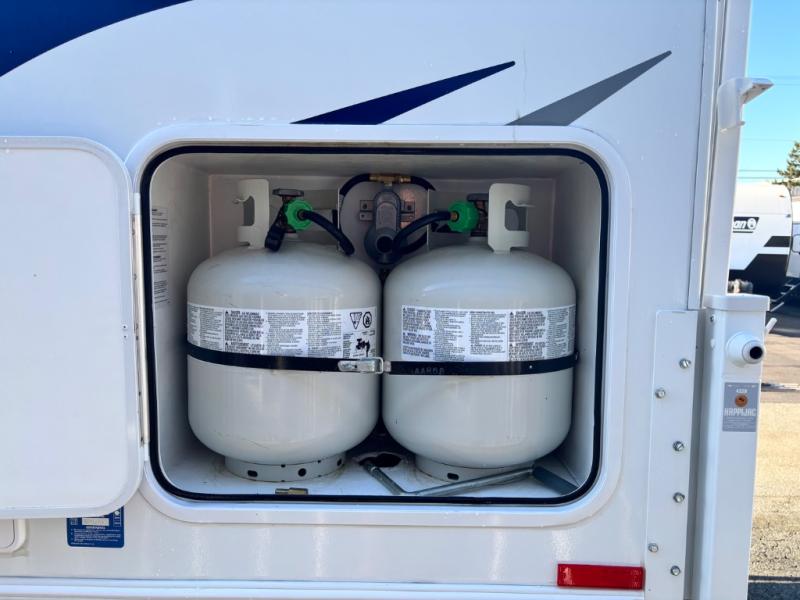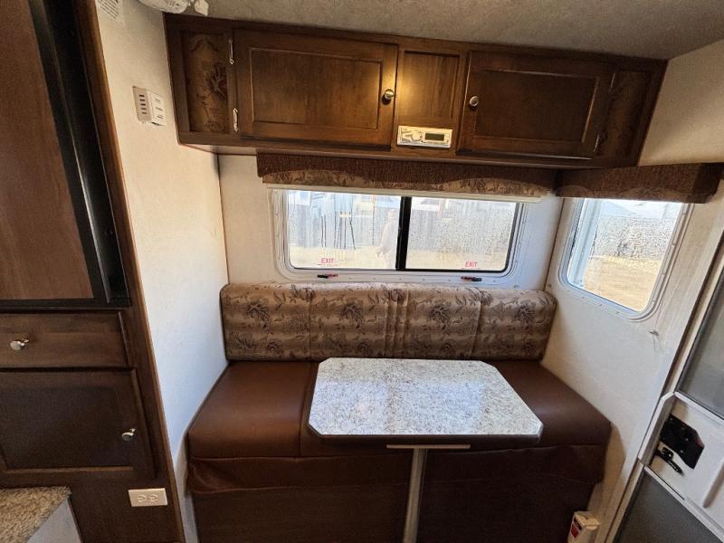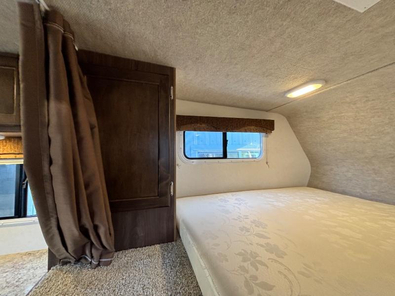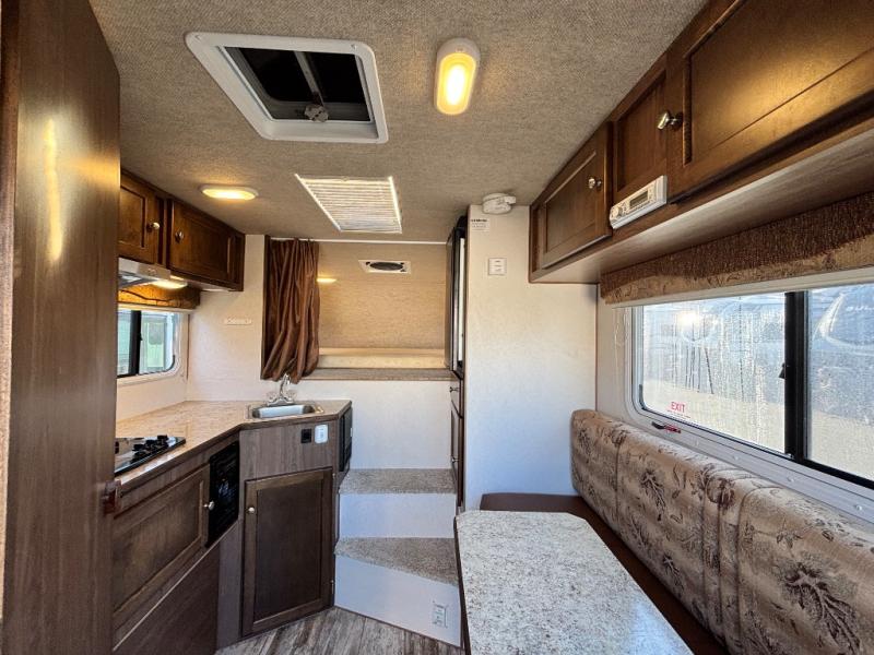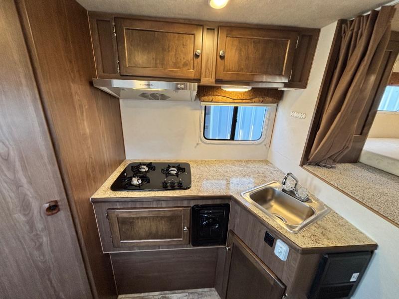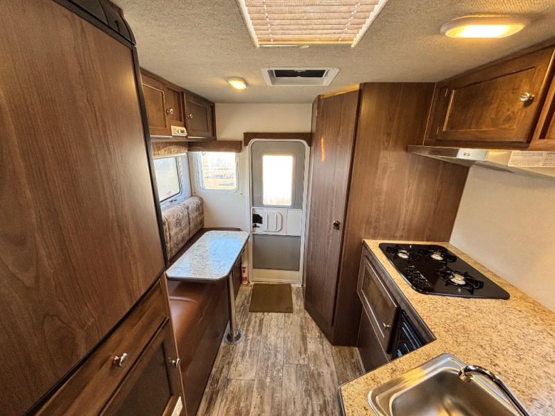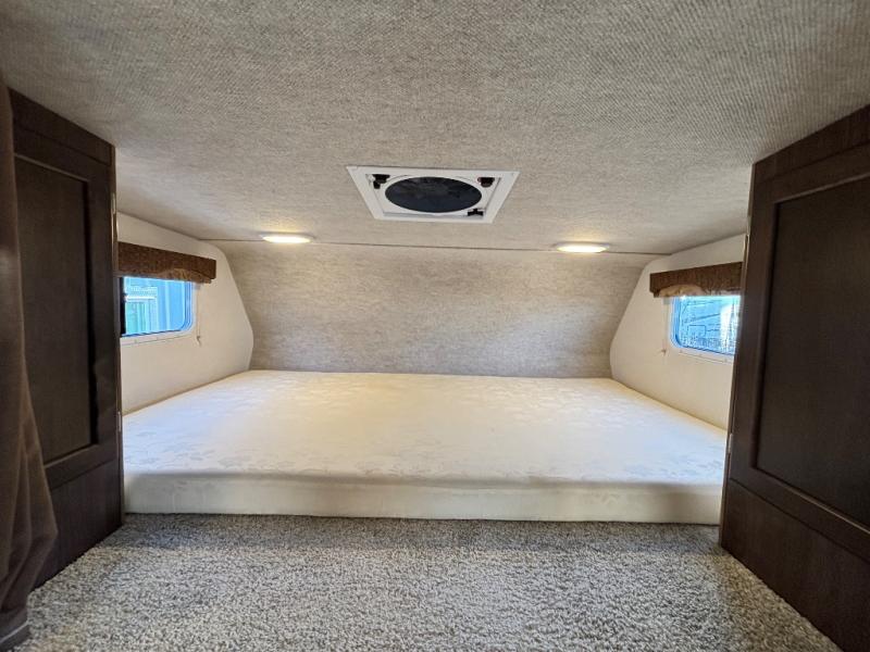 Load this truck camper onto your truck for a fun fishing trip! Enjoy a good night's rest on the front 50" x 80" foam mattress and store your clothes in the closets at the foot of the bed, plus there is a TV plug for your entertainment. Grab some eggs from the two way Dometic 3.0 cu. ft. refrigerator then fry them up on the three burner cooktop and comfortably eat them at the bench with table. The private toilet has a closet with shelves to store your toiletries. Stay warm in the cooler months with the 12,000 BTU furnace and if you add the optional air conditioning then you can stay cool in the warmer months!