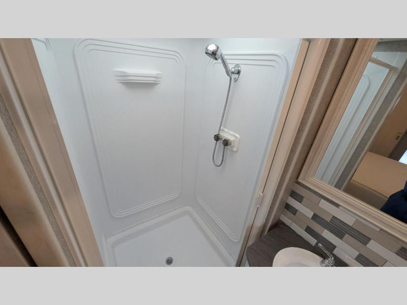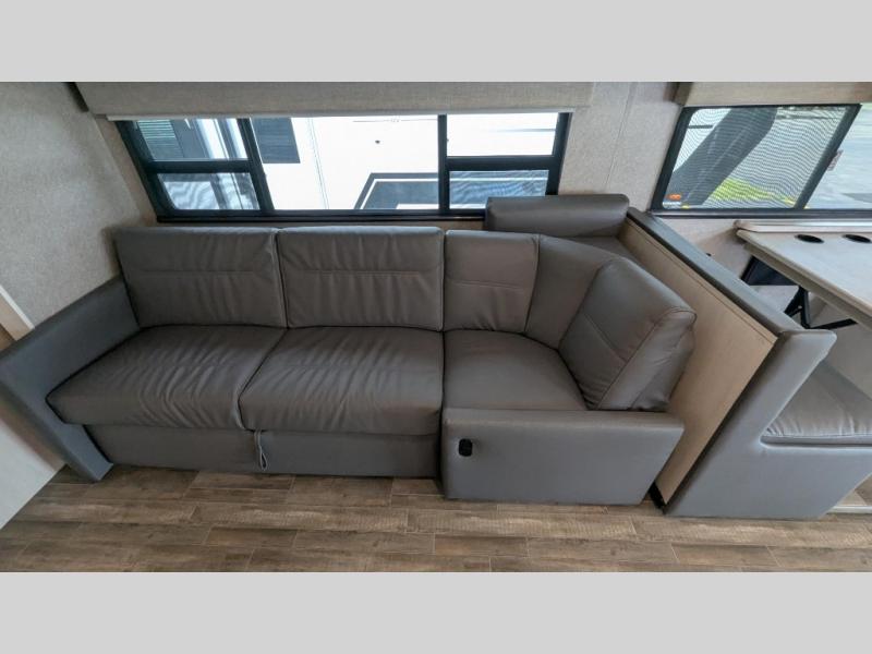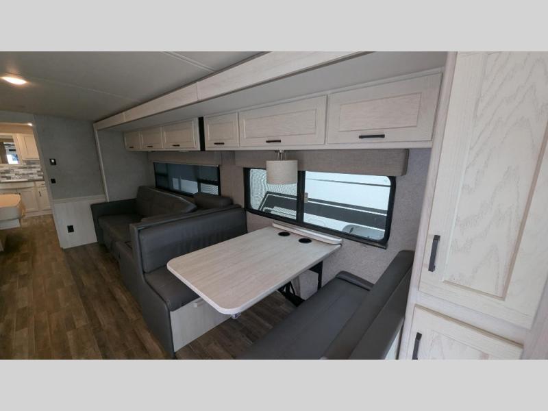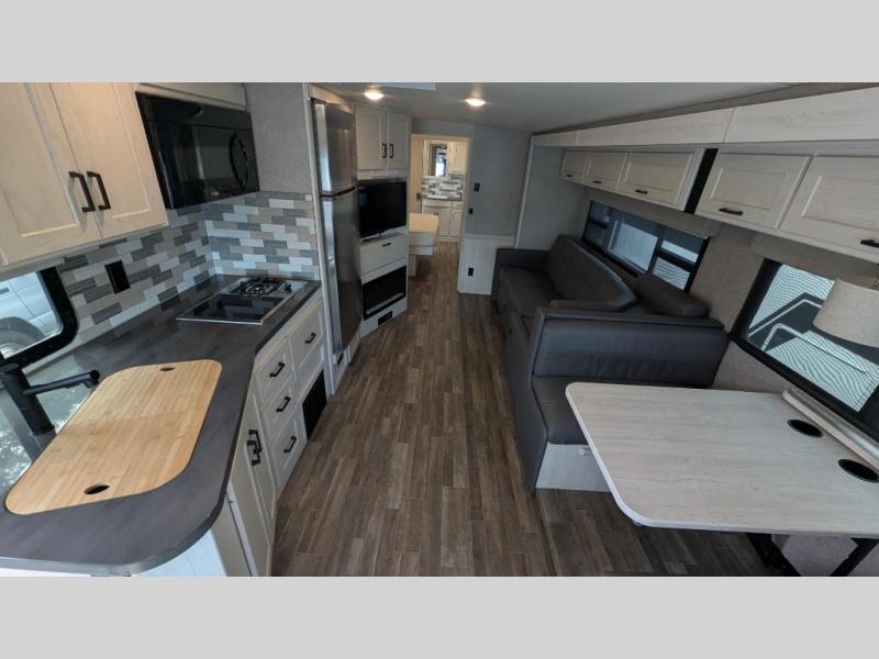 The family-friendly Adventurer Class A gas motorhome by Winnebago is the ultimate family getaway for your trips near and far. The swivel captain's seats include fixed lumbar support and multi-adjustable slide/recline for a truly comfortable ride. You will appreciate the 7" Bluetooth multimedia radio with a rearview/sideview monitor system and color touchscreen for easy navigation, and the powered MCD blackout roller visor/shade on the front windshield will provide privacy when you stop for lunch. Each model includes residential vinyl flooring throughout, a soft vinyl ceiling, a solid-surface kitchen countertop, and a double stainless steel sink with bamboo sink covers. The under-bed storage will provide a place for your luggage, and you'll find lighted storage compartments outside for all your larger gear. These models are constructed with a premium high-gloss fiberglass skin for a sleek look, and the electronic stability control will provide a smooth ride wherever the road takes you!