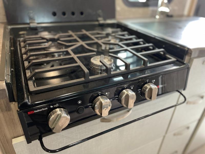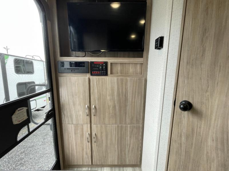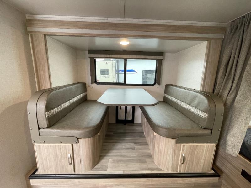 Don't pass your chance to camp comfortably with your spouse in this travel trailer! Up front there is a 60" x 74" RV queen bed with a divider curtain for privacy at night. Scramble up some eggs with the three burner cooktop and grab a cup of orange juice from the 10.3 cu. ft. refrigerator then head to the 44" x 72" booth dinette slide to enjoy your meal. The dinette can also transforms into an extra sleeping space if you want a tag along guest. Everyone can freshen up in the rear corner bathroom and watch their favorite movies on the LED TV!