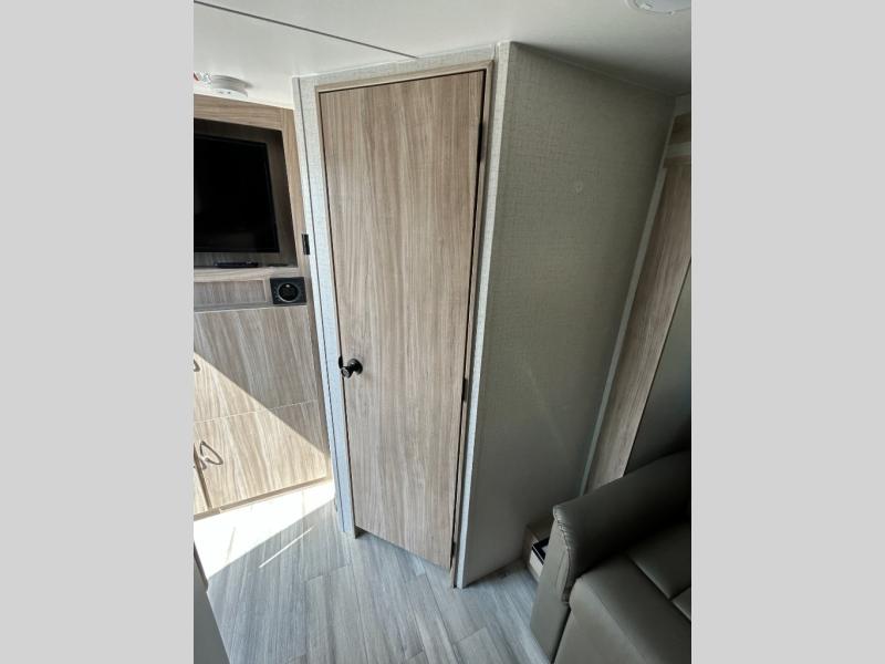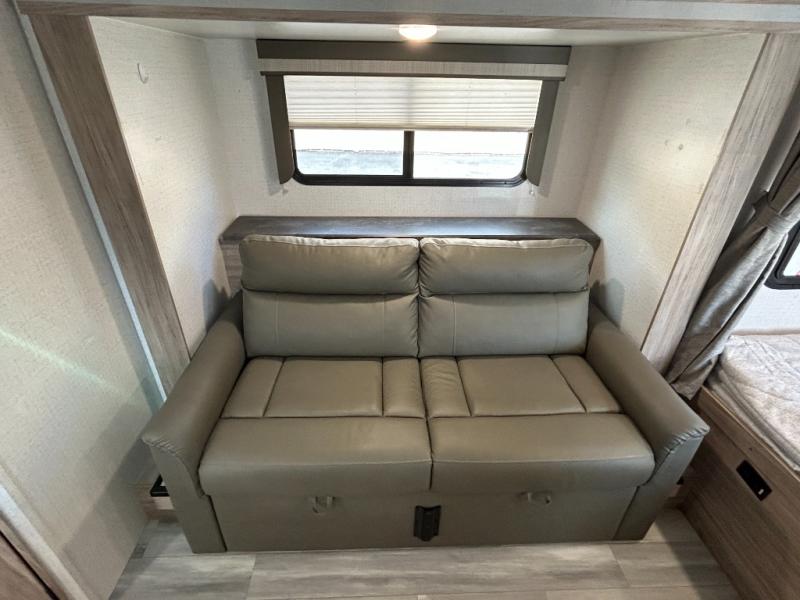 Don't pass your chance to camp comfortably with your spouse in this travel trailer! Up front there is a 60" x 74" RV queen bed with a divider curtain for privacy at night. Scramble up some eggs with the three burner cooktop and grab a cup of orange juice from the 10.3 cu. ft. refrigerator then head to the Sofa Lounge with removable table in the slide-out to enjoy your meal. The sofa can also transforms into an extra sleeping space if you want a tag along guest. Everyone can freshen up in the rear corner bathroom and watch their favorite movies on the LED TV!