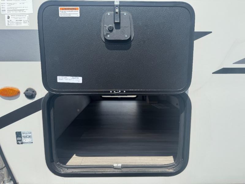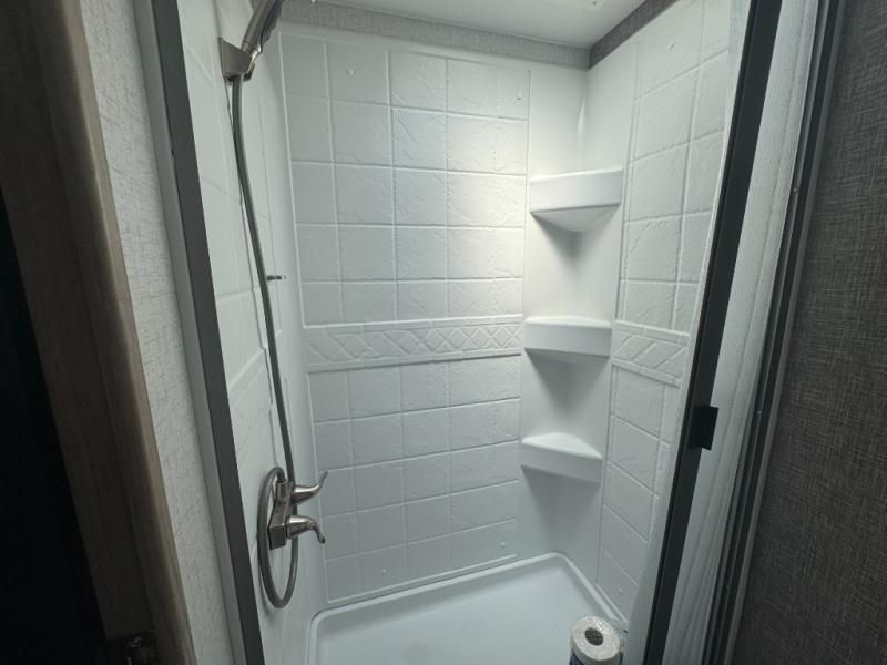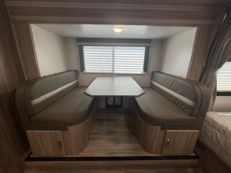 Get ready for a fun family weekend in the great outdoors with this trailer only steps away to enjoy inside comforts! The cook will love having everything to make warm meals, and can easily store leftovers in the double refrigerator, plus the flip-up counter gives them more space to prep or dry the dishes. The front 54" x 74" full bed has a divider curtain for privacy at night and the rear corner 28" x 72" bunk beds are conveniently next to the private toilet and shower room. The booth dinette slide gives you a place to dine as well as sleep one more person, plus you will love the extra floor space that it provides. You might like to choose the EZ Glide Sofa Sleeper and table option in its place, the option is yours!