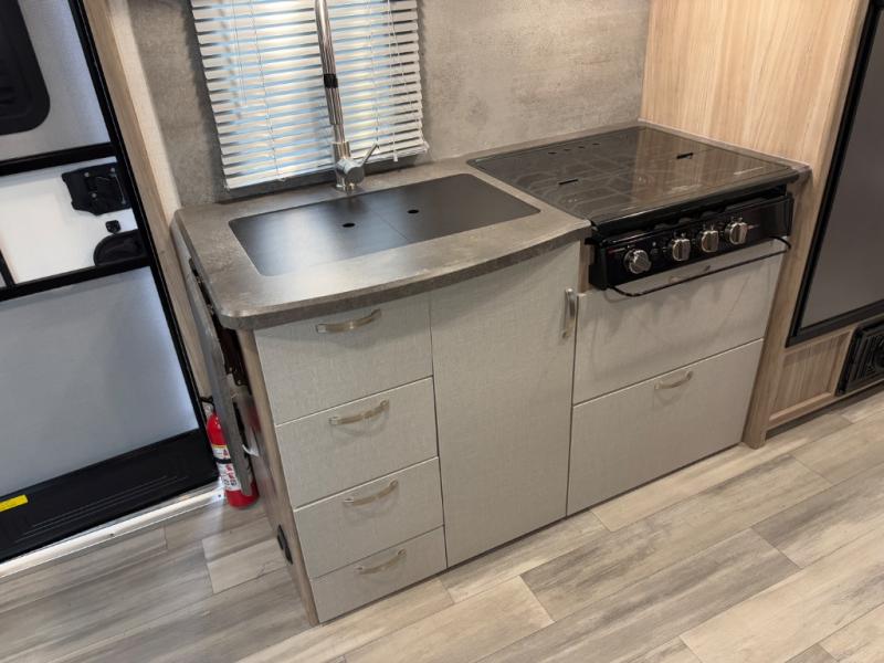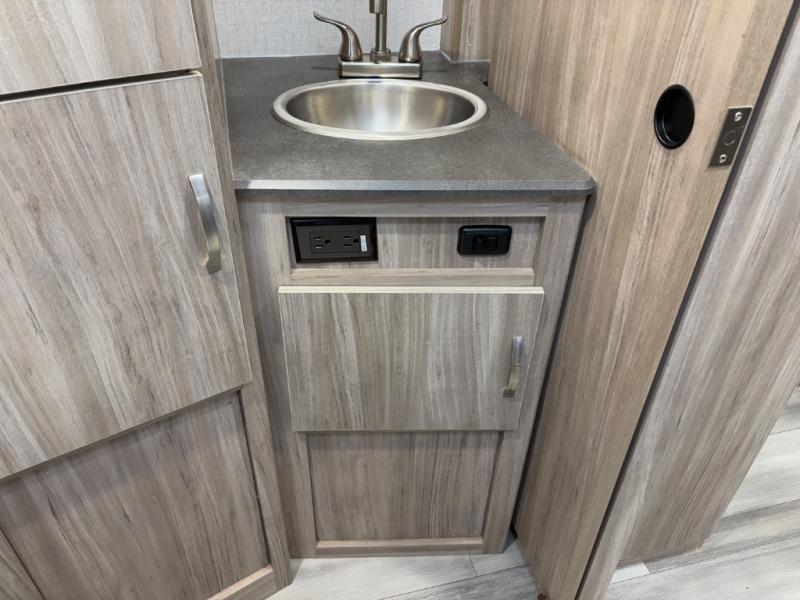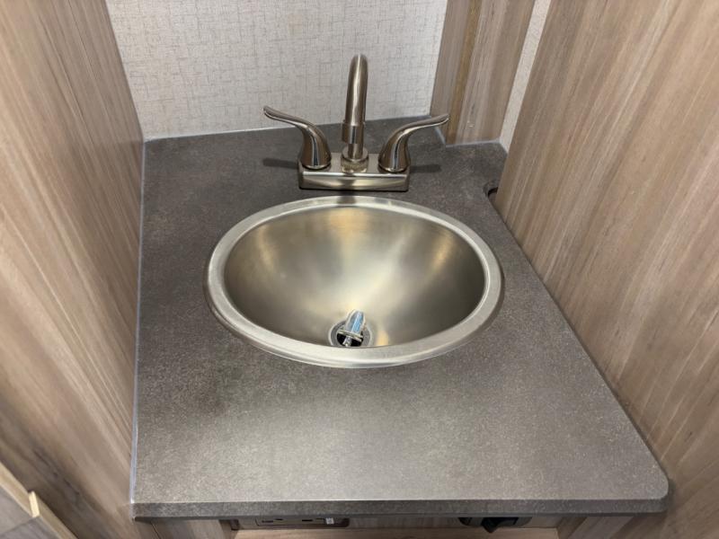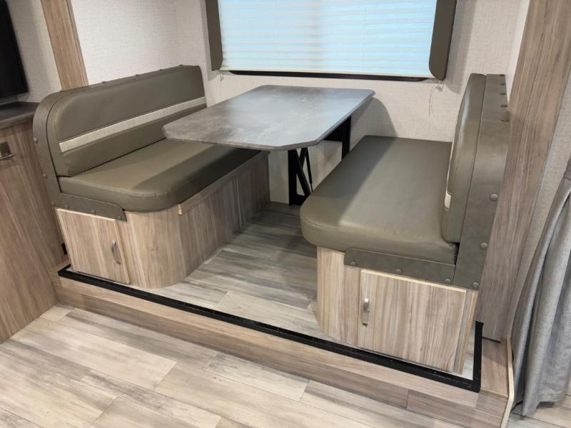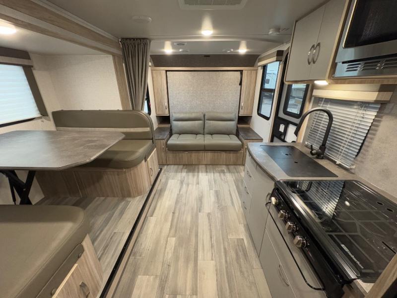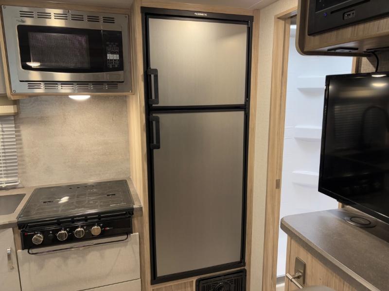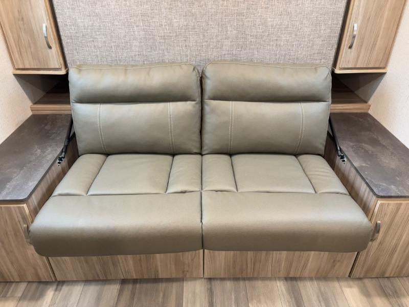If you're looking for versatility then you need this travel trailer! Depending on the time of day you enter will determine whether you see the Murphy bed or the sofa up front. A slide out 44" x 72" booth dinette can be used for dining, playing games, and sleeping space at night. The full rear bathroom is equipped with everything you will need to freshen up each morning and features a wardrobe for your clothing and linens, and a pocket door into the bath saves space in the main room. The LED TV is conveniently located so you can watch your favorite shows from the sofa or Murphy bed as well as the dinette, plus the pantry offers a place to store your snacks and such for easy access. The cook in our bunch will love all the amenities to make meals including the handy flip-up counter for more prep space.