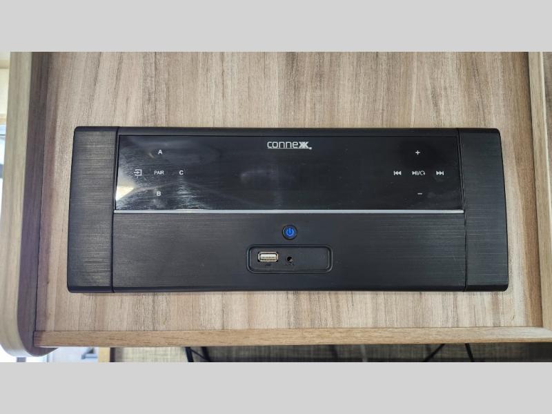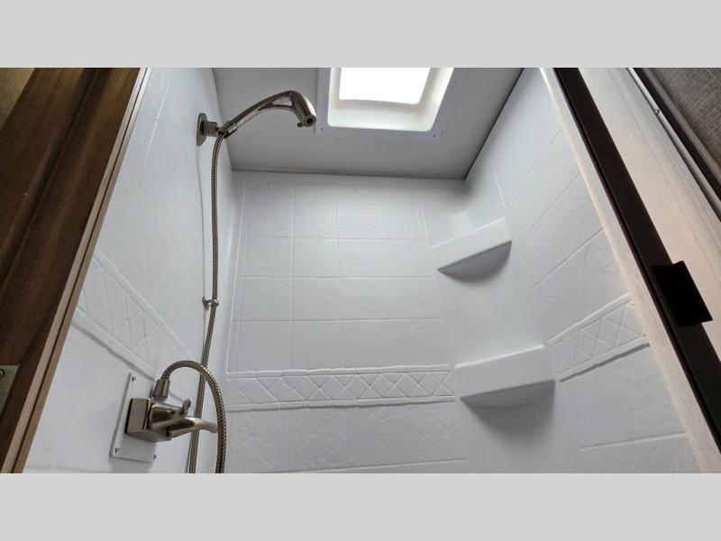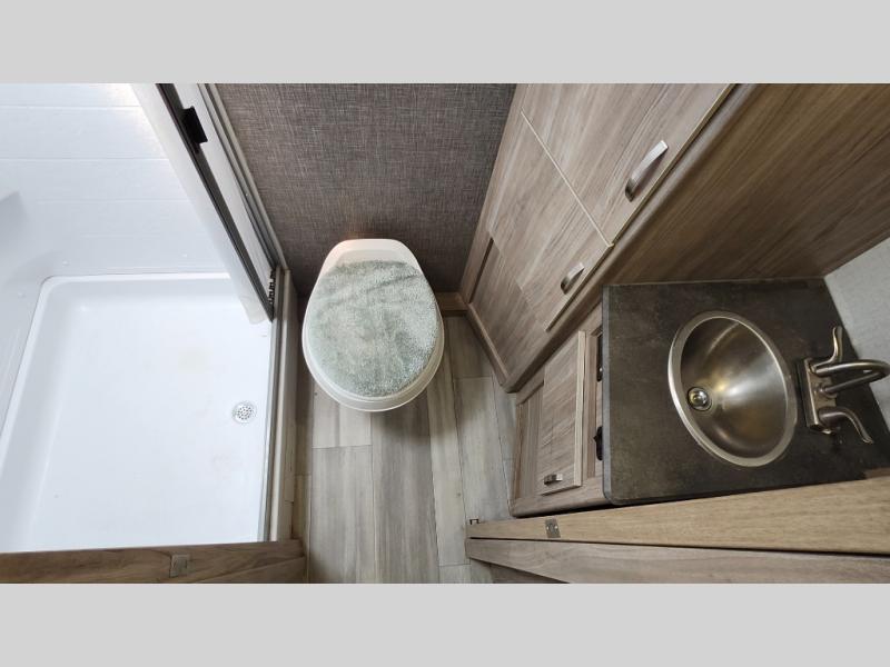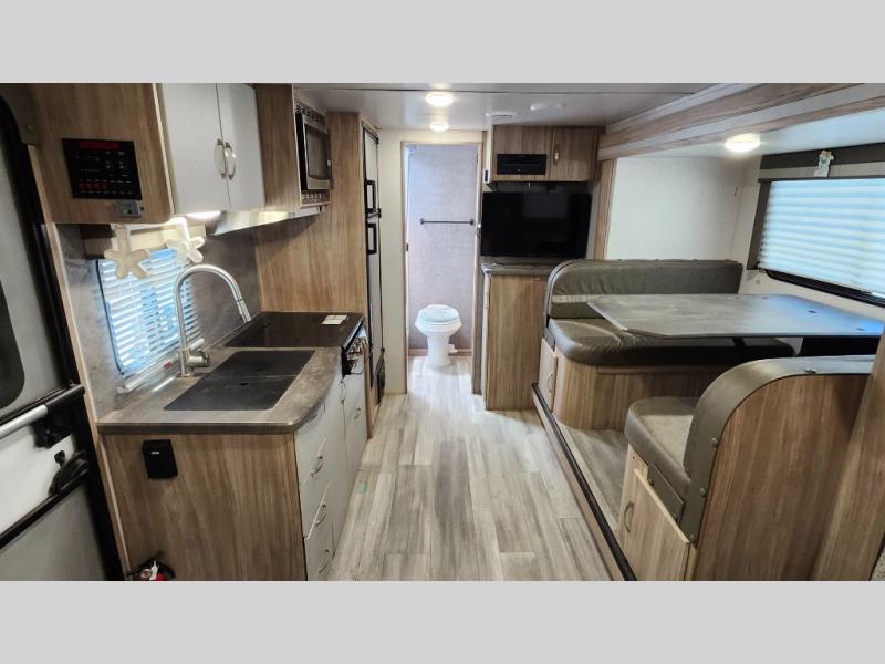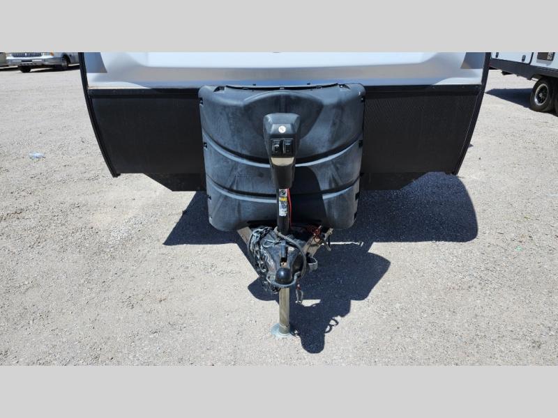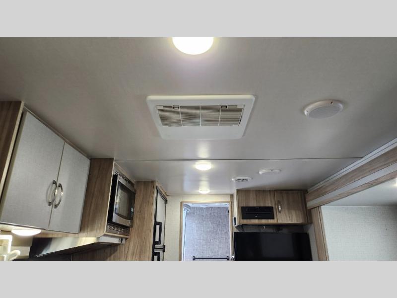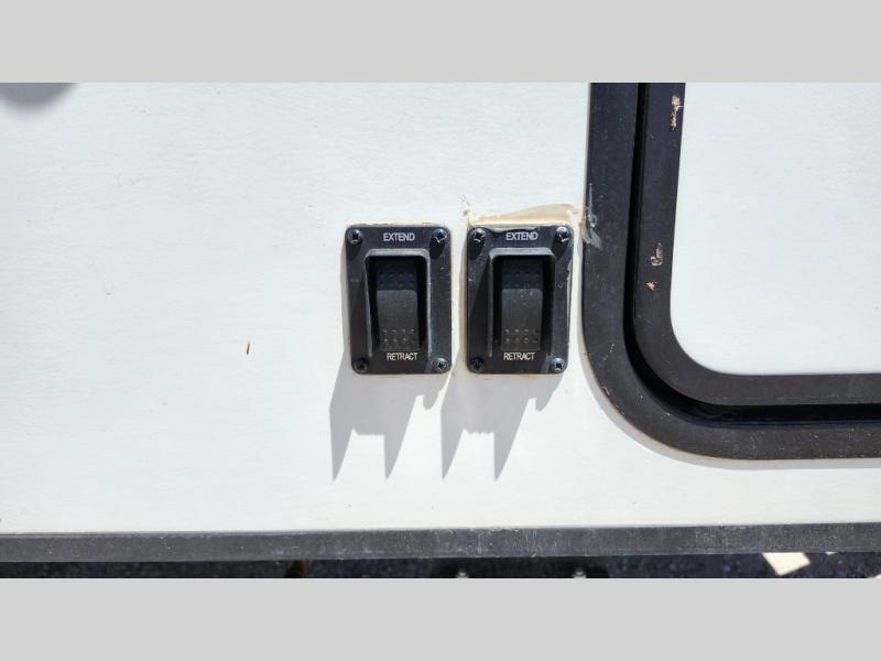 Come see just how accommodating this travel trailer can be! The two 32" x 74" twin beds up front have a nightstand in between them and a divider curtain to draw, plus they can convert into one 74" x 82" king-size bed. The 44" x 72" booth dinette slide can also convert into an extra sleeping space when you're not using it for meal time or play games. Everyone can get squeaky clean in the full rear bathroom, and the wardrobe is a convenient place to store your linens and extra clothes. Grab a snack from the kitchen pantry or pop a bag of popcorn in the microwave then watch a movie on the LED TV or head outdoors and relax underneath the power awning while your favorite tunes play through the patio speakers!