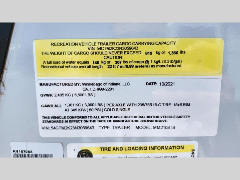 Used 2022 Winnebago Industries Towables Micro Minnie 2108TB Travel Trailer