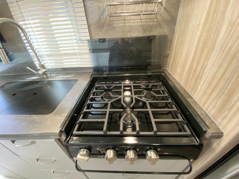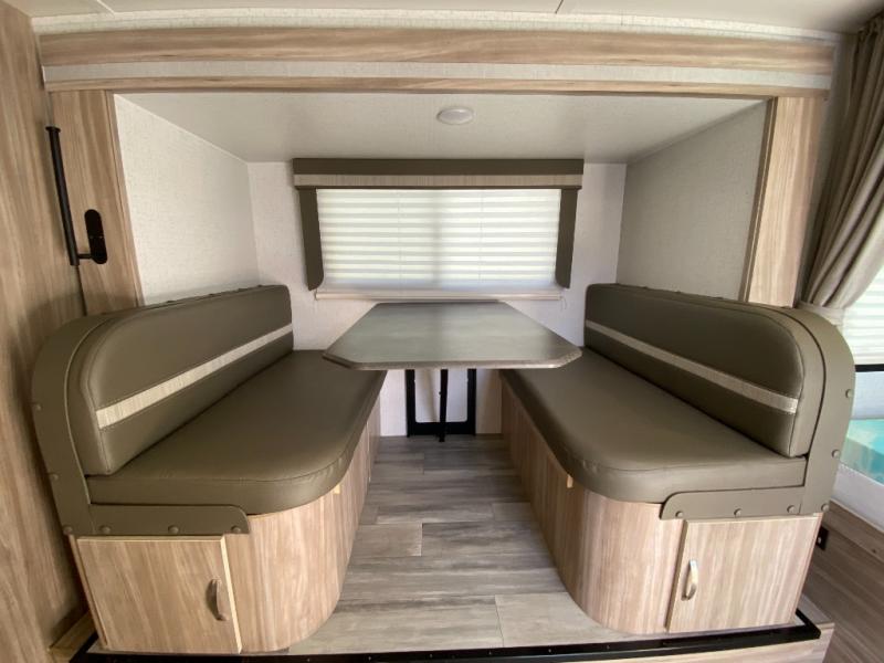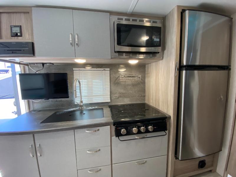 Join the crew of happy campers who are getting away in this Micro Minnie FLX travel trailer! You will be able to store your favorite belongings in the exterior Pack-N-Play storage, and you can also fill up the 10.3-cubic foot refrigerator with fresh produce. The kitchen includes a recessed three-burner cooktop with backlit knobs and glass cover as well as a convection microwave, so you'll never go hungry. There is even a flip-up countertop in the kitchen too, and it can be used when you need more space to prep meals. The front 54" x 74" bed can be sectioned off from the rest of the trailer by drawing the divider curtain, and you can switch out the booth dinette for the optional EZ Glide sofa sleeper with hutch and table if you prefer that configuration.