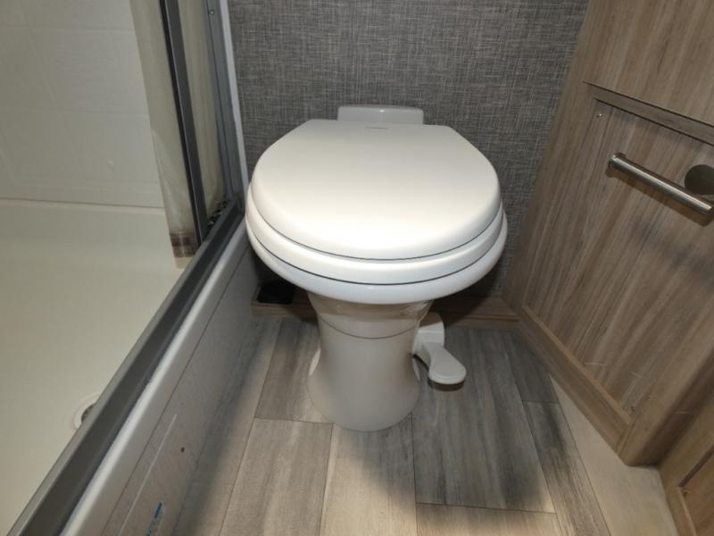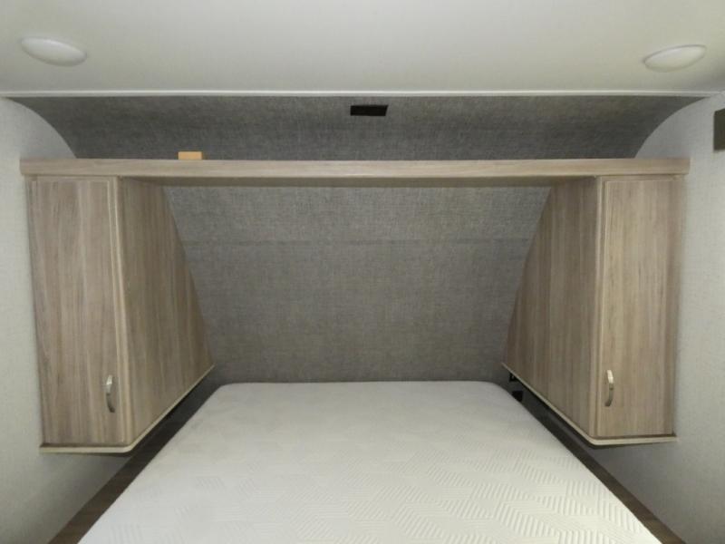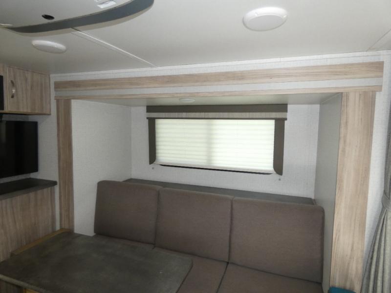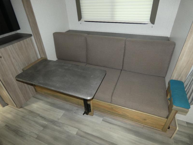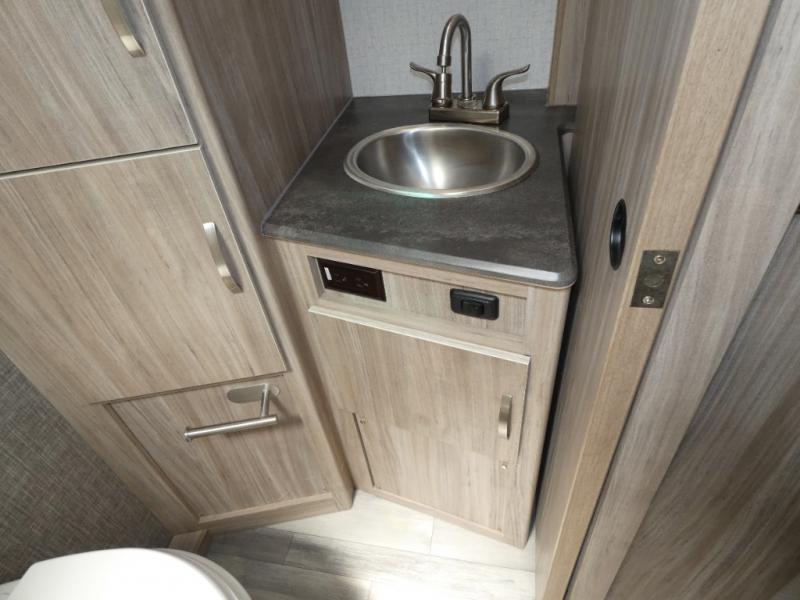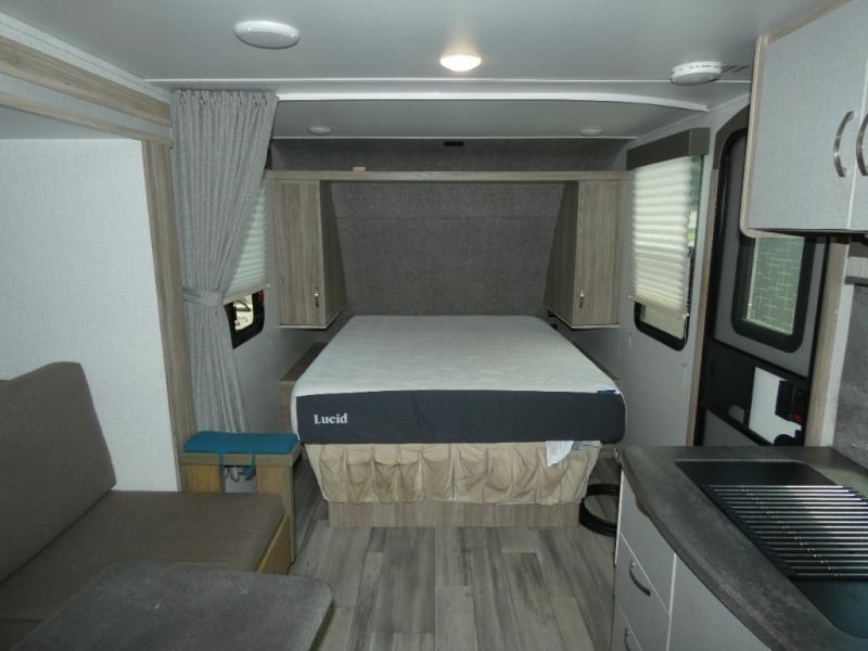 Comfort and convenience are at the heart of this Micro Minnie FLX travel trailer! There is a front bedroom area with an RV queen bed, wardrobe, and nightstand when you draw the privacy curtain, and the rear bathroom has an Aqua View Showermiser system that provides hot water almost instantly while reducing water use. The kitchen comes with a 10.3-cubic foot refrigerator that can hold your favorite foods, and the flip-up countertop adds more prep space without taking up precious living space. You will also be grateful to find an LED TV to watch when the rain just won't stop.