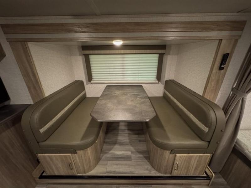 Head to your favorite destination with your favorite person in this Micro Minnie FLX travel trailer! It features two 32" x 74" twin beds up front with a nightstand in between and the ability to convert into a 74" x 82" king bed. You also have a divider curtain for privacy at night. Keep your bellies full with home cooked meals prepared with the recessed three burner cooktop, enjoy your meals at the 44" x 72" booth dinette slide, and store any leftovers in the 10.3 cu. ft. refrigerator. You could even switch out the dinette for the optional 60" x 75" sofa with table and cabinet above it. A pocket door closes off the full rear bathroom which has a 30" x 36" shower and a wardrobe to keep your towels close!