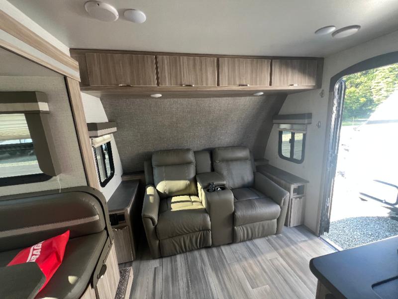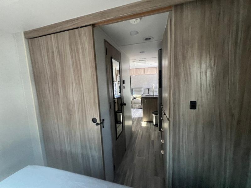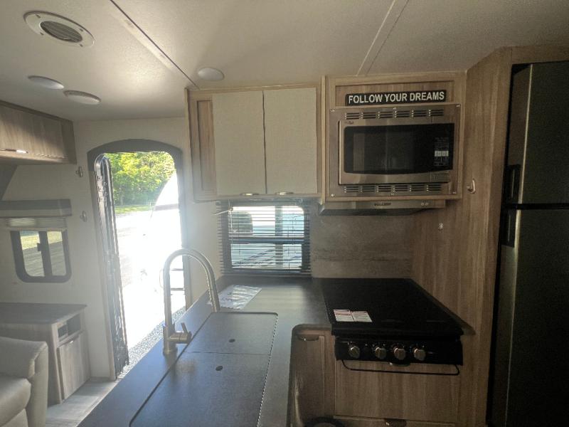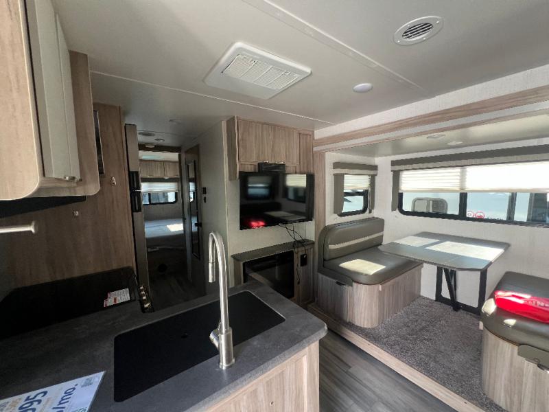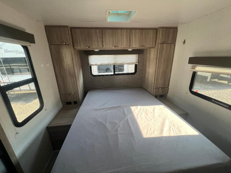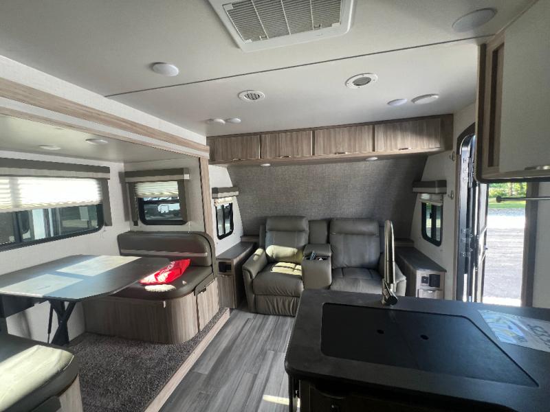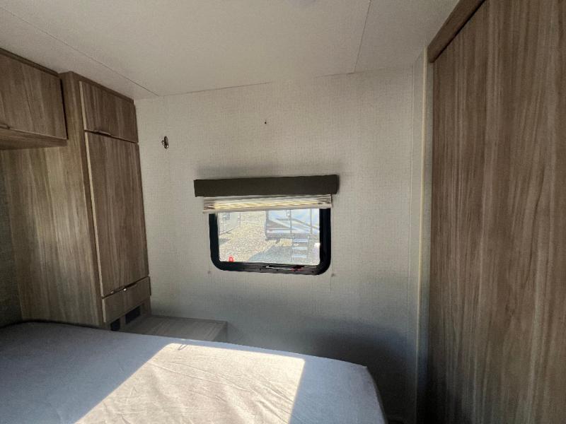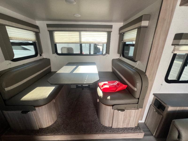Dual entry doors will provide a smooth flow of traffic in and out of this cozy travel trailer, so come take a look! The front living area includes a tri-fold sofa with two end tables/cabinets, a booth dinette slide out, and an LED TV to watch your favorite shows. There are two pantries for added storage and a flip-up counter in the kitchen for extra counter space. This model includes a full bath to clean up each day, and a wardrobe right across the hall to store towels. And check out the rear private bedroom with a queen bed, dual wardrobes and nightstands, and its own exterior entry door for convenience!