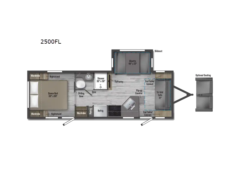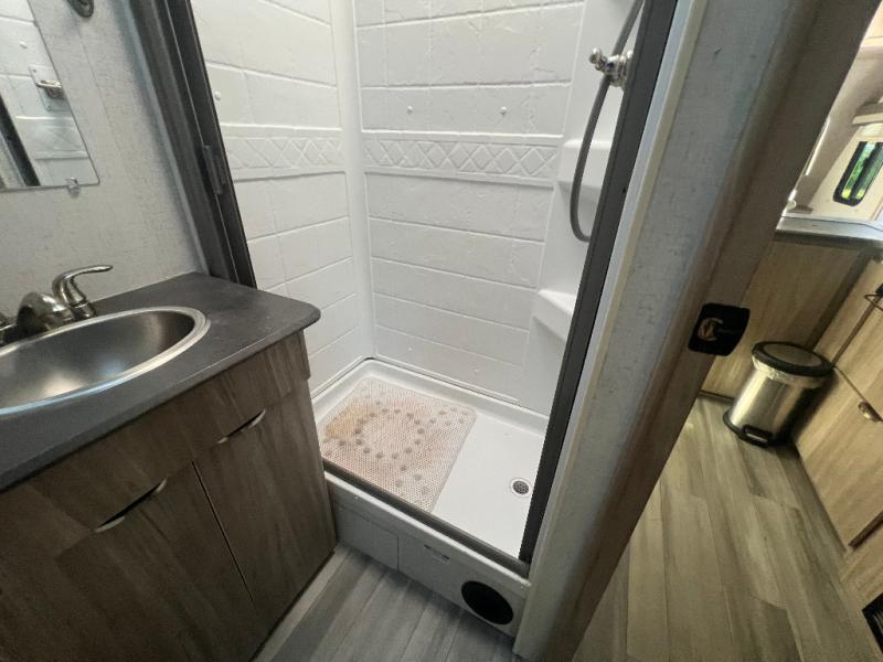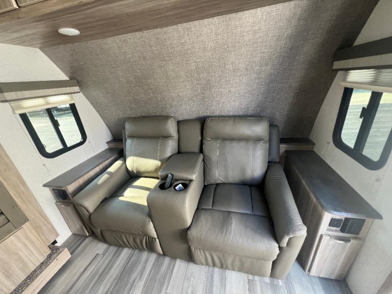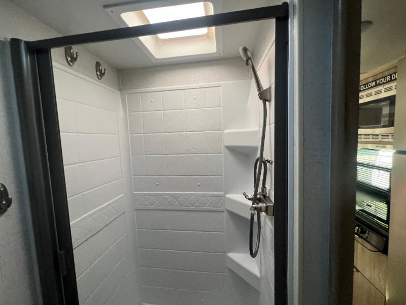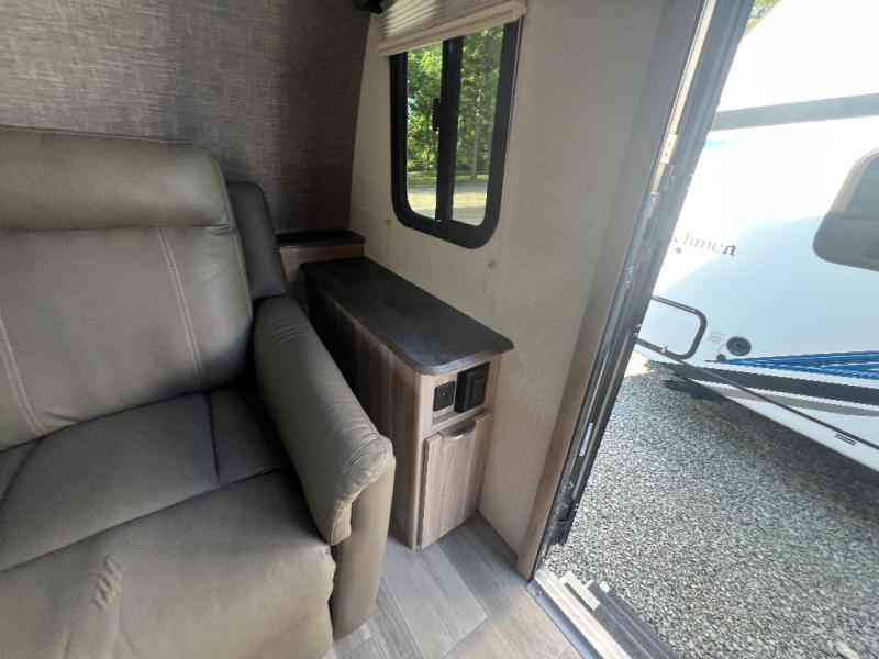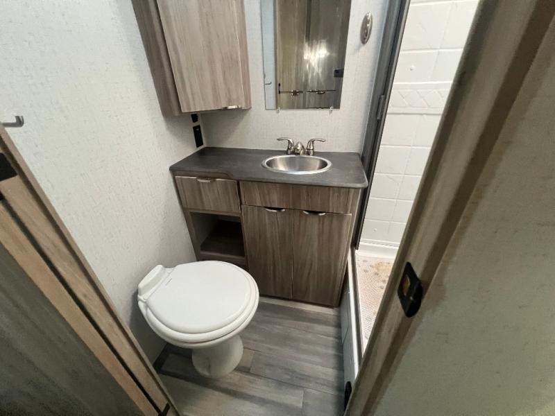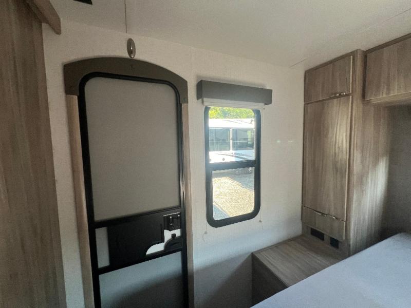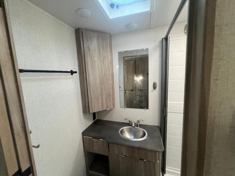 Dual entry doors will provide a smooth flow of traffic in and out of this cozy travel trailer, so come take a look! The front living area includes a tri-fold sofa with two end tables/cabinets, a booth dinette slide out, and an LED TV to watch your favorite shows. There are two pantries for added storage and a flip-up counter in the kitchen for extra counter space. This model includes a full bath to clean up each day, and a wardrobe right across the hall to store towels. And check out the rear private bedroom with a queen bed, dual wardrobes and nightstands, and its own exterior entry door for convenience!