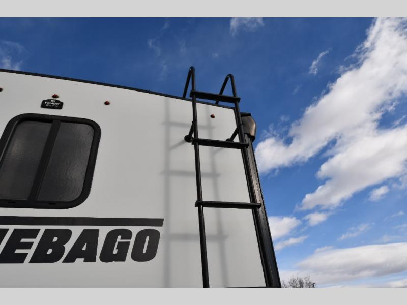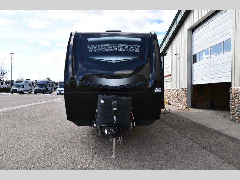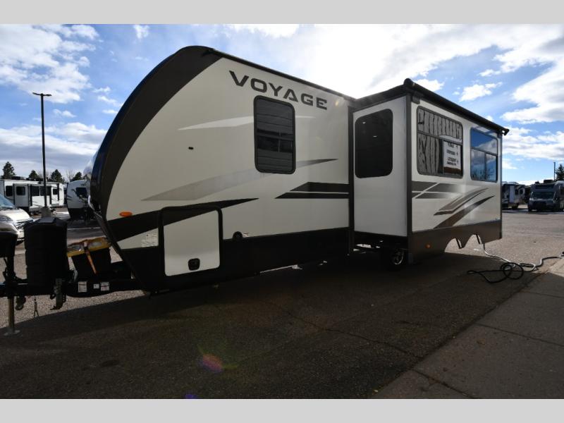 Each Voyage travel trailer by Winnebago Industries Towables includes two 100-watt solar panels with a charge control monitor so you can camp off-grid, satellite and antenna connections, and an antenna with wifi prep. Also included is a heated and enclosed underbelly with thermo foil insulation for four seasons of travel, a gel coat fiberglass front cap with integrated LED lighting, walk-on roof decking, plus four-point power/electric stabilizers for easy setup and stability. The interior offers comforts of home, large windows, ceiling LED lights, ductless flooring throughout, and full kitchen amenities. No voyage is better than the one taken in the Voyage travel trailer!