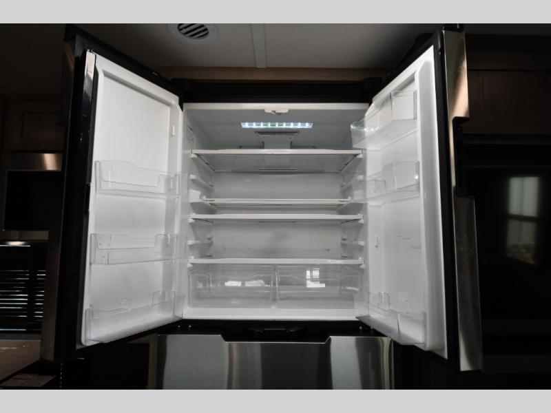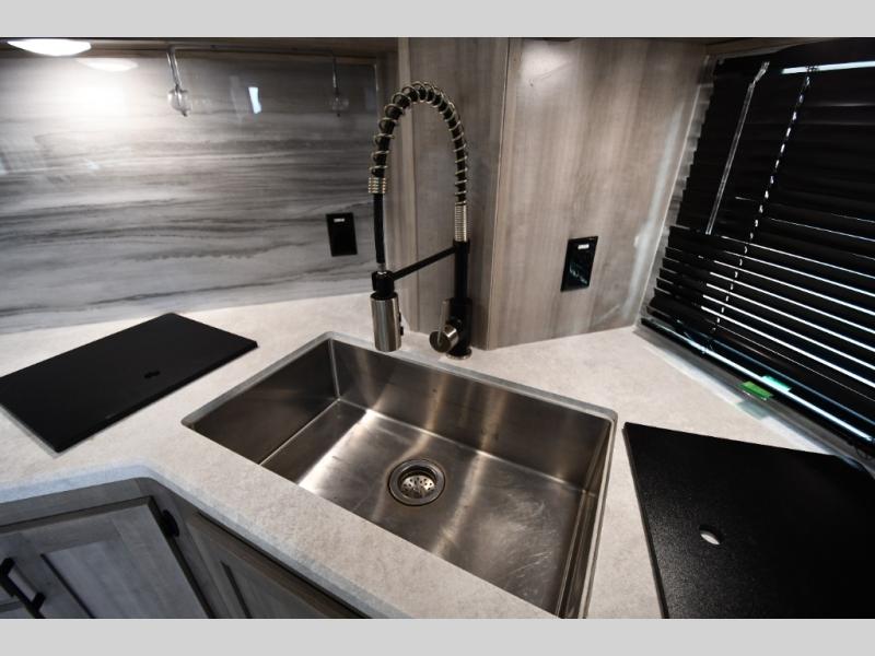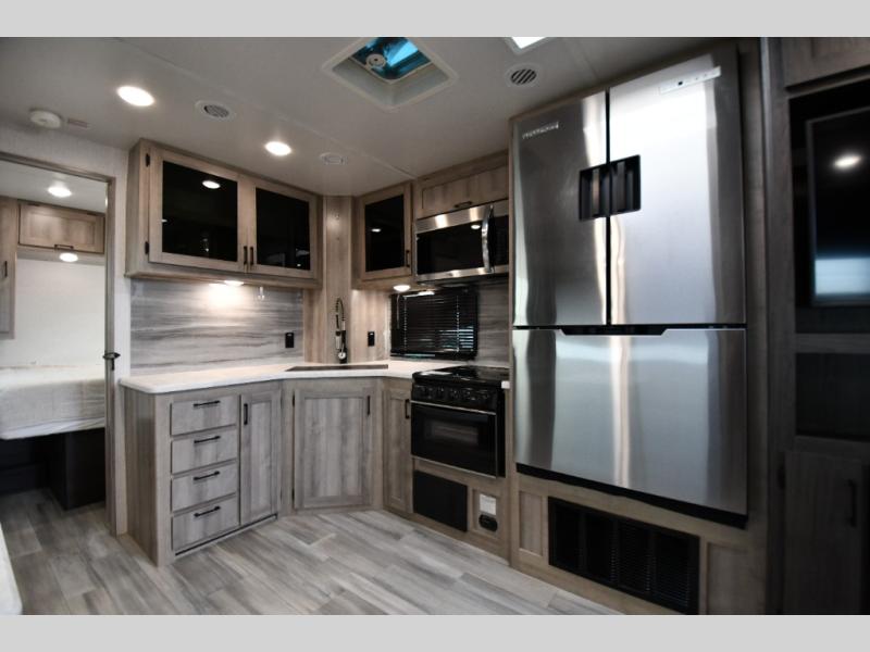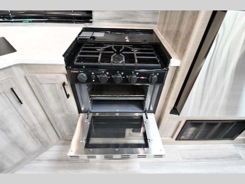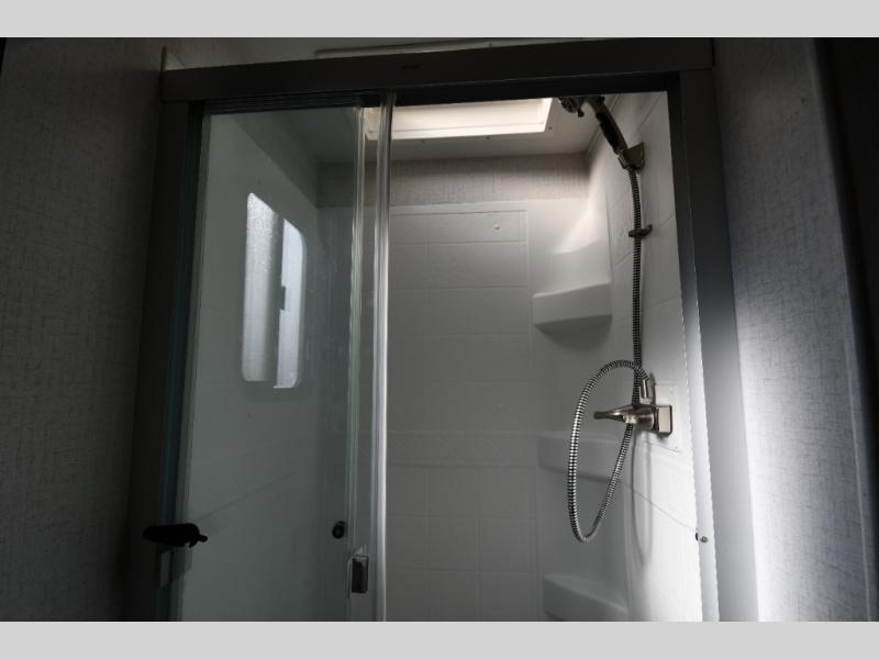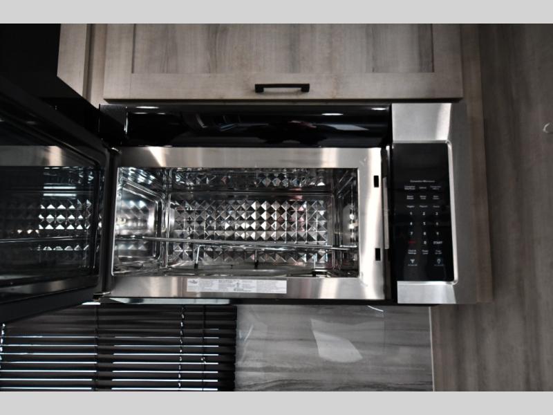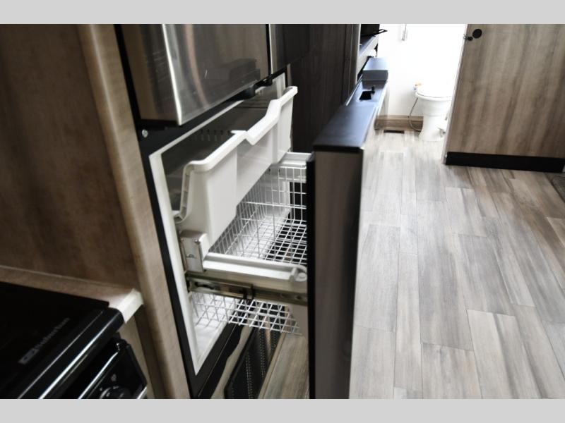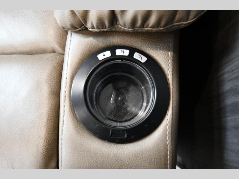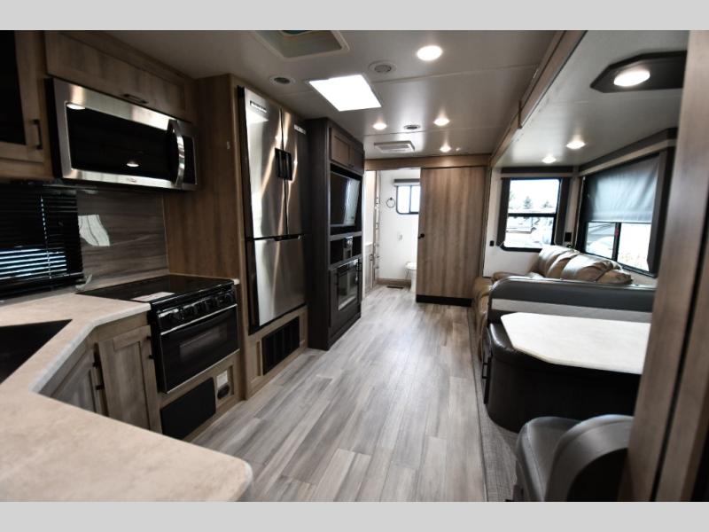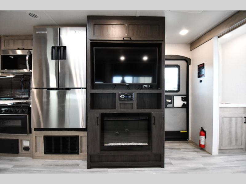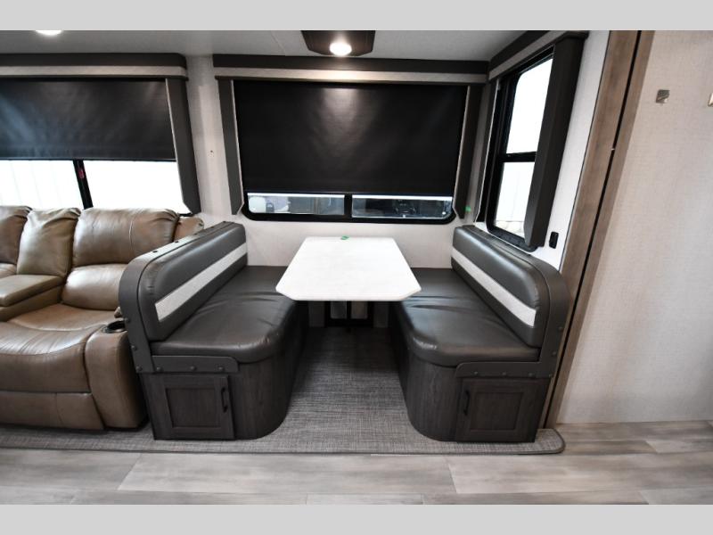Convenience and comfort are found throughout as you return to your own accommodations after exploring the campgrounds. There are two entry doors so that you can choose to either enter the front private bedroom or the main living area. When you choose to enter through the main entrance, you will be met with a walk-in pantry to your right and a full rear bathroom to your left. That makes it very convenient when you are coming in after a muddy adventure so that you don't track dirt all throughout the trailer. Within the main living area there is a large slide that has a tri-fold sofa and booth dinette across from the kitchen area. You will love sitting back on these pieces of furniture while you watch the LED TV within the entertainment center across from you.