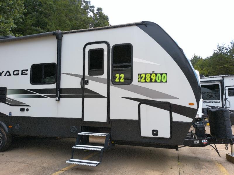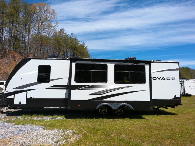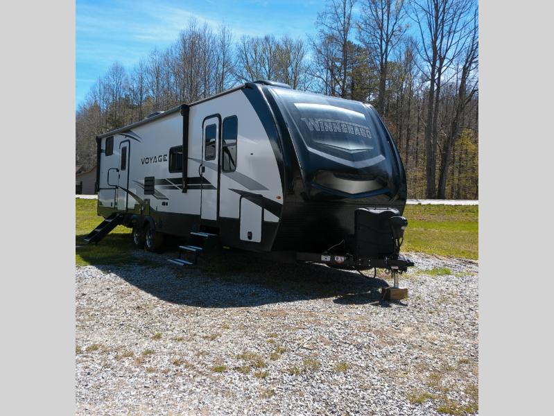 Each Voyage travel trailer by Winnebago Industries Towables includes two 100-watt solar panels with a charge control monitor so you can camp off-grid, satellite and antenna connections, and an antenna with wifi prep. Also included is a heated and enclosed underbelly with thermo foil insulation for four seasons of travel, a gel coat fiberglass front cap with integrated LED lighting, walk-on roof decking, plus four-point power/electric stabilizers for easy setup and stability. The interior offers comforts of home, large windows, ceiling LED lights, ductless flooring throughout, and full kitchen amenities. No voyage is better than the one taken in the Voyage travel trailer!