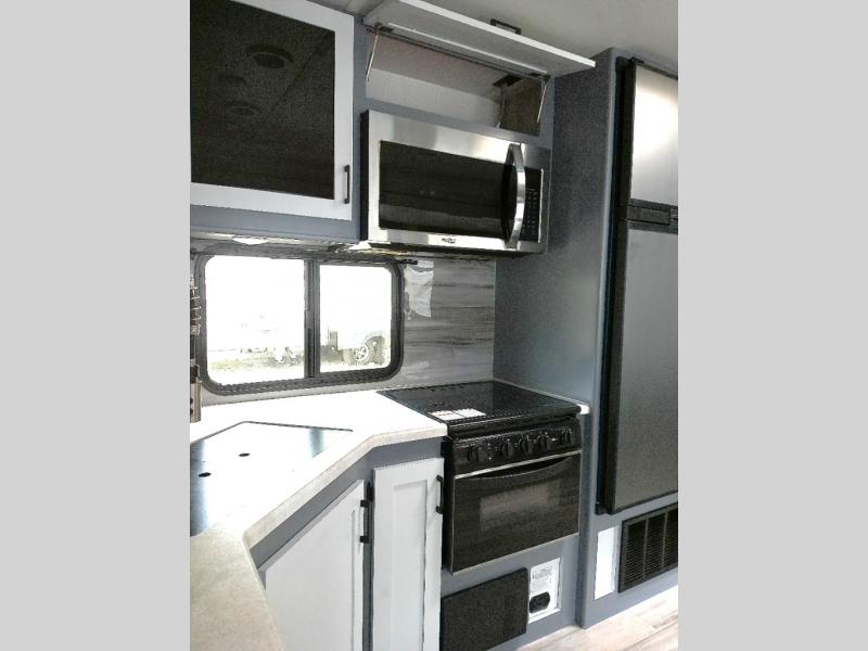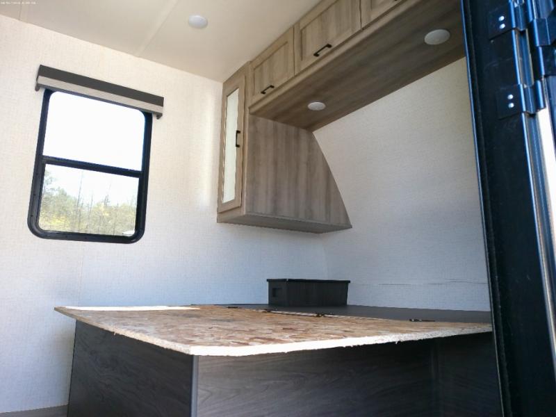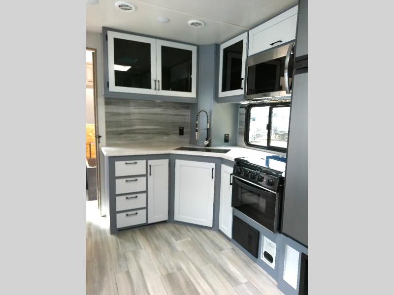 Whatever reason you get away from your daily schedule, you'll want to sleep in a little bit longer each morning since you will have your own private bedroom in the front with a queen bed or choose the king option, and since the bedroom has the second exterior entry door, you can come and go as you please. Your guests or your kids will also have a comfortable place to spend the night with the double-size bunks in the back. And if you do happen to have even more people traveling with you, there is a tri-fold sofa and booth dinette slide out that can provide more sleeping space. The indoor kitchen is fully equipped with a recessed three-burner cooktop and convection microwave for delicious meals, but there is also an exterior kitchen that you can use for some summertime fun.