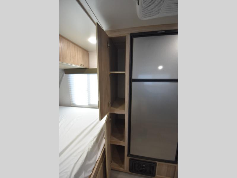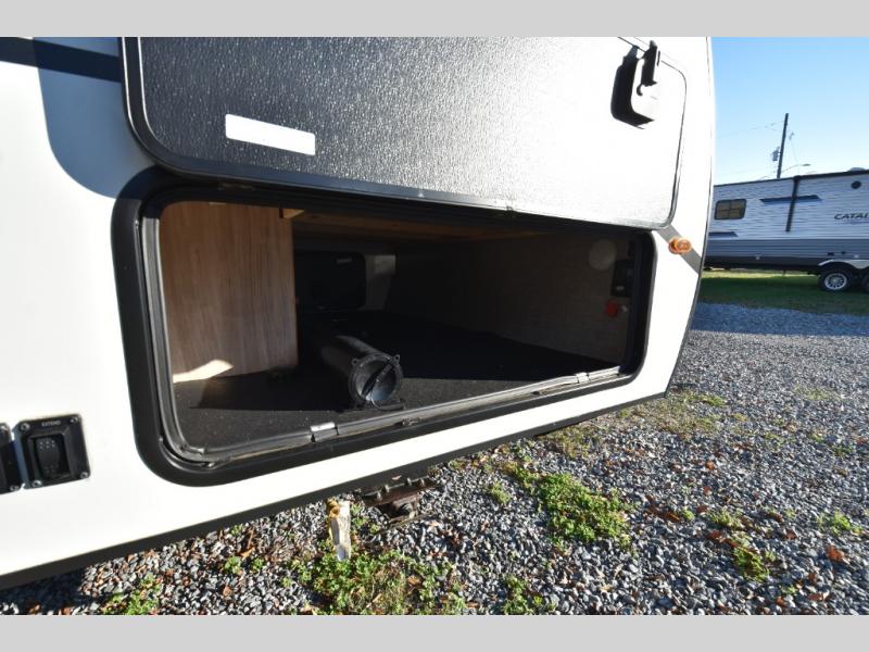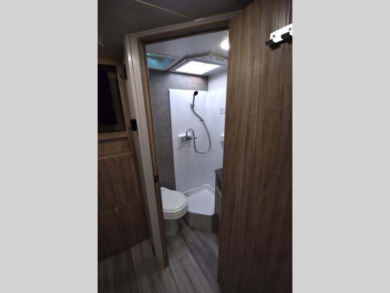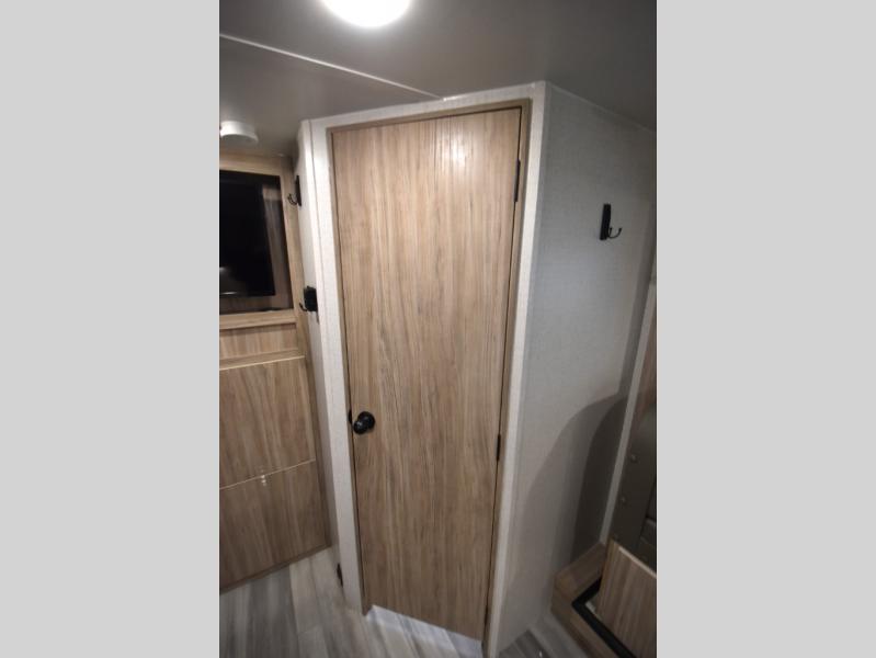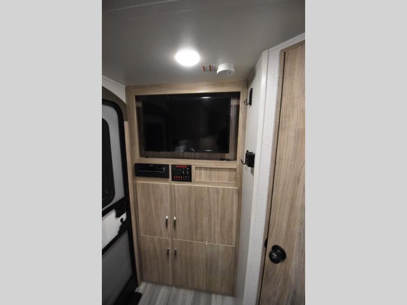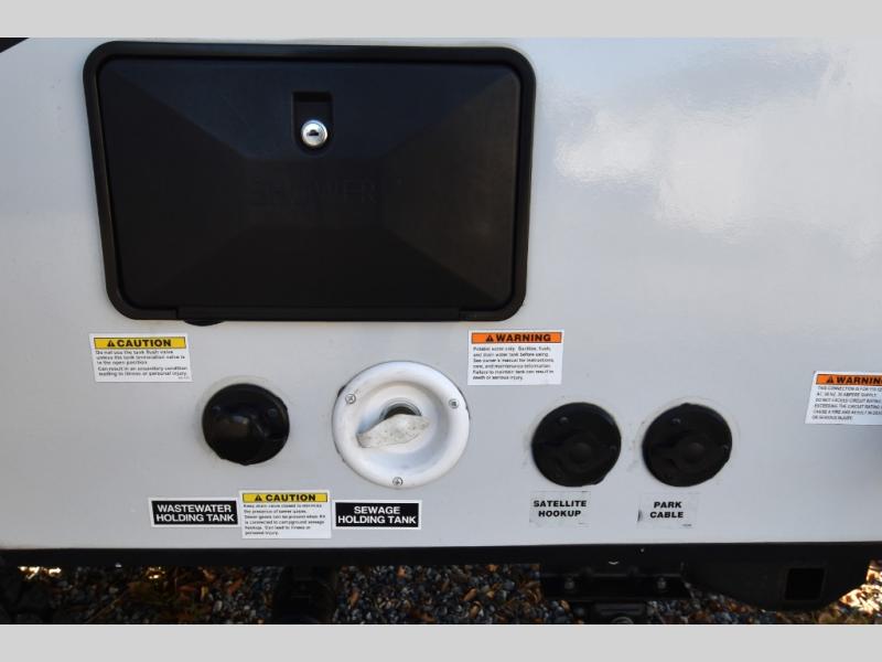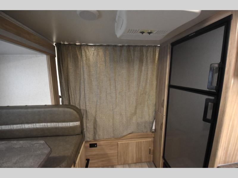 Don't pass your chance to camp comfortably with your spouse in this travel trailer! Up front there is a 60" x 74" RV queen bed with a divider curtain for privacy at night. Scramble up some eggs with the three burner cooktop and grab a cup of orange juice from the 10.3 cu. ft. refrigerator then head to the 44" x 72" booth dinette slide to enjoy your meal. The dinette can also transforms into an extra sleeping space if you want a tag along guest. Everyone can freshen up in the rear corner bathroom and watch their favorite movies on the LED TV!
