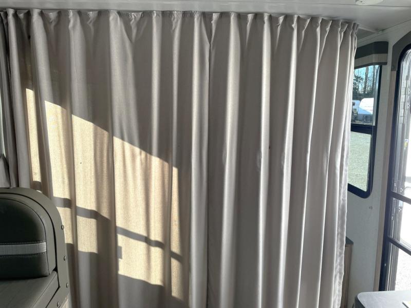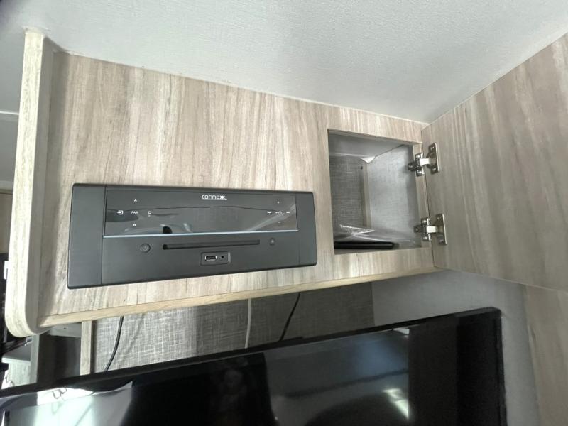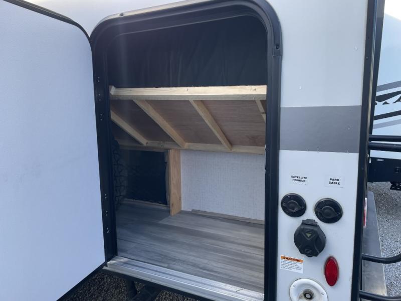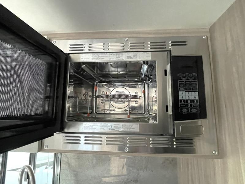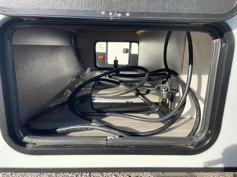 Other highlights include a power awning with LED lighting, exterior patio speakers, an exterior pack-n-play door for flexible storage, an LED TV inside, JBL premium sound system, two burner cooktop, microwave, refrigerator, and flexible exterior storage compartments. The 7 foot width makes towing simple and stress free, even for newer RVers.