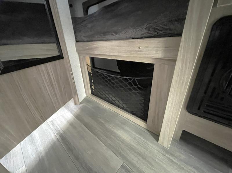 The 28 x 72 bunk beds offer fun, cozy sleeping spots for kids and additional guests, complete with easy access to the rear corner bathroom.