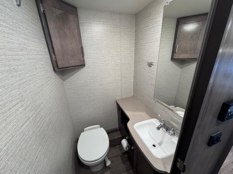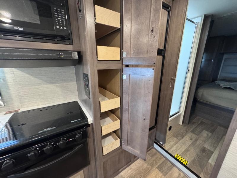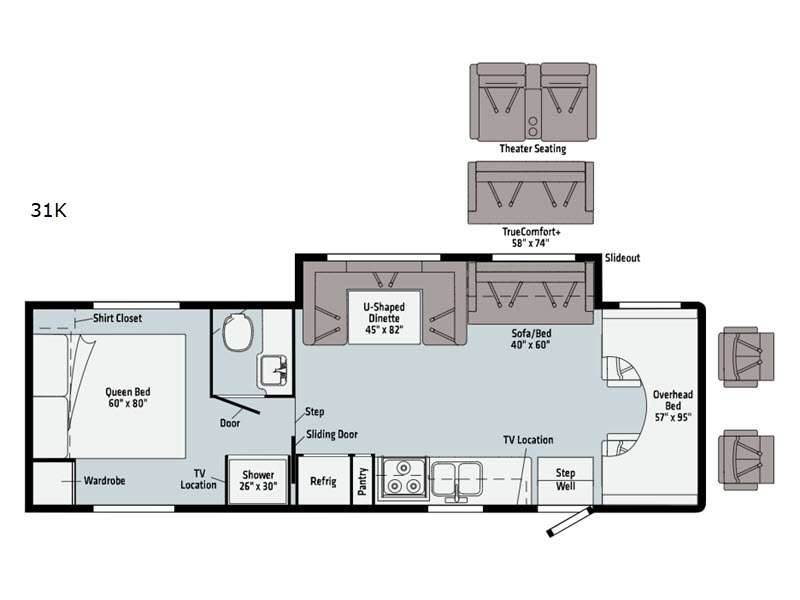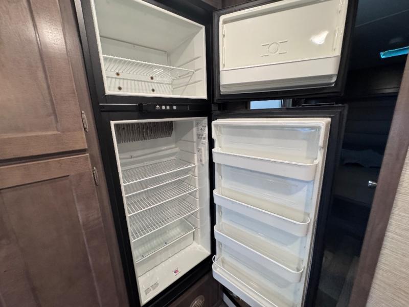 Are you ready to begin your new life of adventuring with this Minnie Winnie Class C gas motorhome? Once you make camp, you can push the large slide out into place for a big living space. The slide out holds the 45" x 82" U-shaped dinette and 40" x 60" sofa bed for comfort and relaxation. You also have a couple of choices for replacing the sofa with the optional TrueComfort+ or theater seating. The rear private bedroom ends up being extremely convenient because you can include the separated bathroom in this space by closing the sliding door, and that creates a makeshift master suite. The 8-cubic foot refrigerator is going to be able to store your cream, eggs, and juice with ease, so you'll always be able to provide the group with breakfast.