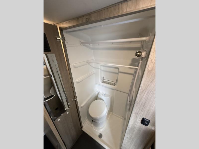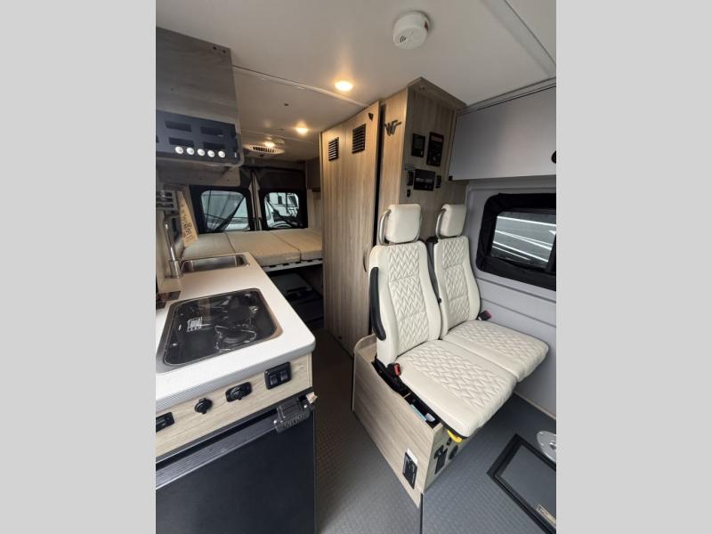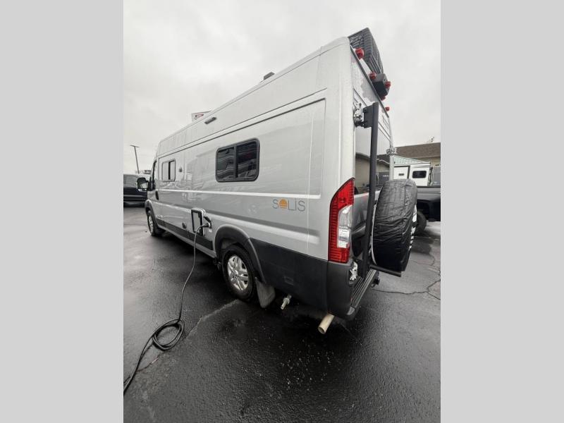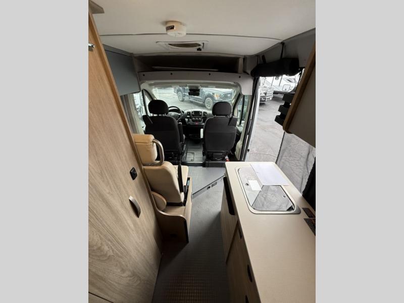 Each Solis Class B gas motorhome by Winnebago sits upon a fuel-efficient Ram ProMaster chassis with a 3.6L V6 engine to power your adventures. You will love the cab conveniences that make each trip enjoyable, like the digital review mirror, the radio/review monitor system touchscreen, and the crosswind assist to keep you steady on the road. Some of the hassle-free amenities you will appreciate are the exterior wash station, the Eco-Hot water system, and the water center control panel located inside the right rear door. Head indoors to find heavy-duty vinyl flooring throughout, a laminate countertop and a stainless steel sink in the galley, plus tinted coach windows for added privacy. The Solis also features off-grid capabilities with its two deep-cycle Group 31 batteries and 220-watt flexible surface solar panel with a controller. Adventures awaits in the Solis Class B gas motorhome!