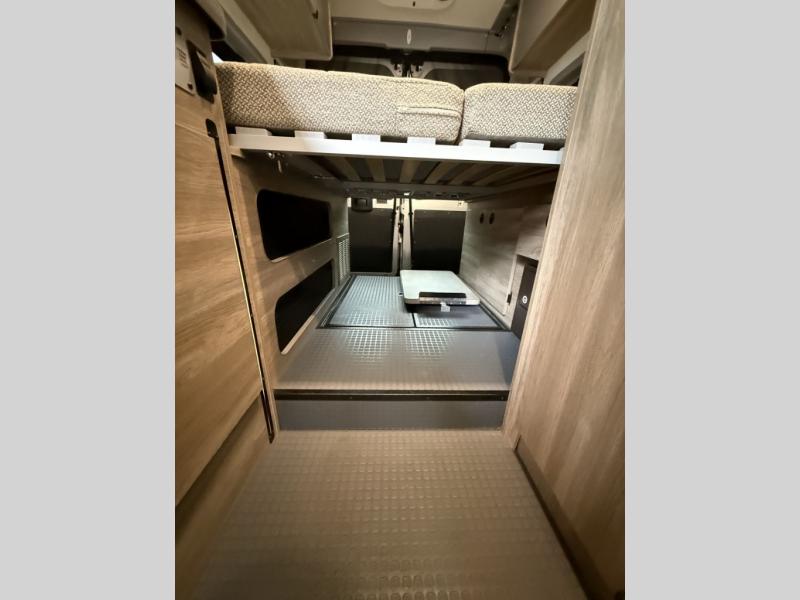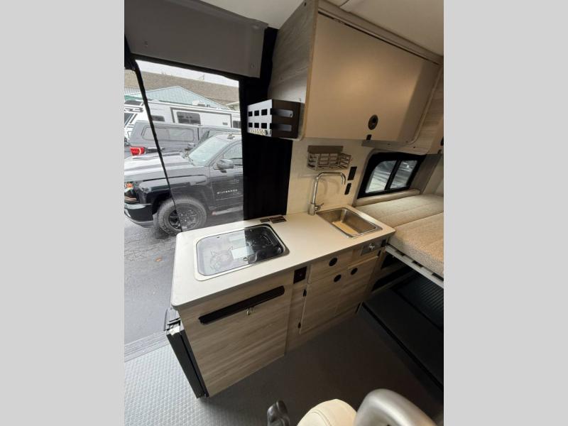 This camper van with an L-track storage system is perfect for those needing more storage space for their hiking and biking gear. You can stay powered up with the Cummins Onan QG 2800i gas generator, and there is a Coleman Mach 10NDQ A/C with directional vents that will allow you to come inside to cool off after a trail ride. A Murphy+ bed comes standard, or you can choose the optional sofa/bed, and any guests that tag along can sleep in the pop-top sleeping area! You'll find the wet bath to come in handy when you want to clean up, and the dinette seating with a removable pedestal table will provide a place to enjoy your dinner at.