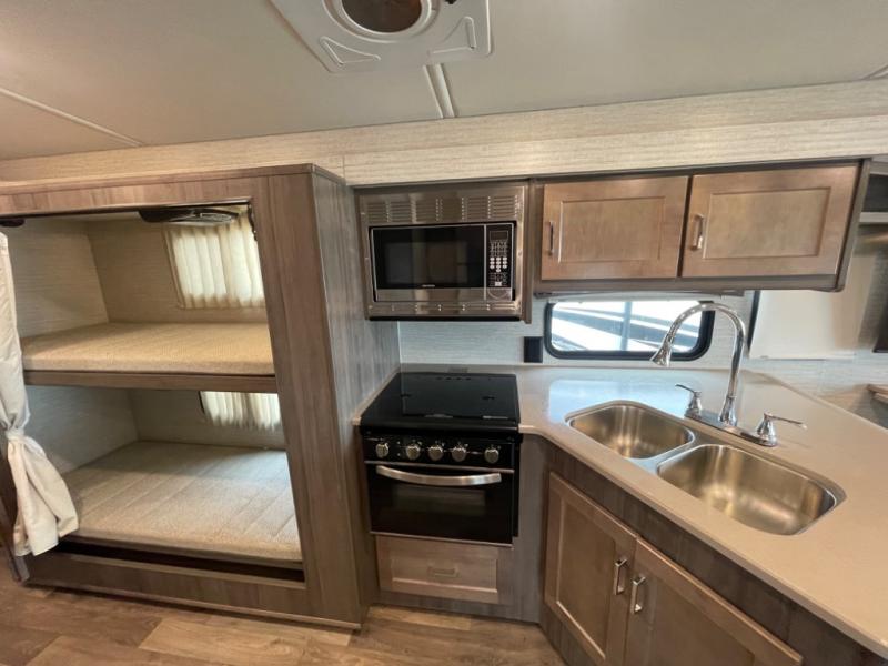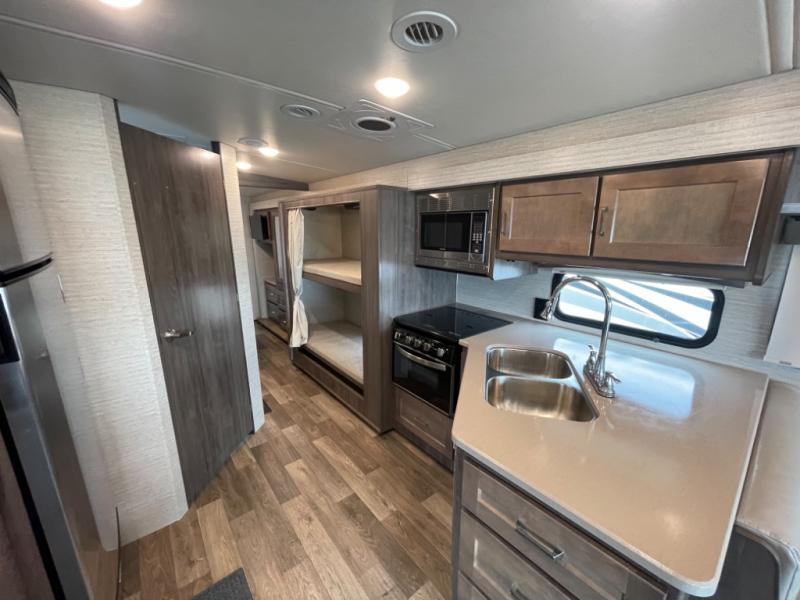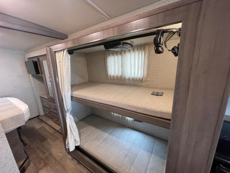 Tailgating in this RV is super fun with the exterior 32" HDTV, the powered patio awning with LED lighting, plus the included Tailgate package which provides a refrigerator, a three-drawer cabinet, LED lights, Quick-Connect LP house, a steel sink, a wall mounted bottle opener, a garbage bag holder, and a paper towel holder. When you want to carry the party inside, there is a sofa/bed, a dinette with Hi-Lo table, and the captain's seats that swivel giving you more seating to visit. When it's time for bed, the the mid-coach bunk beds, and the optional StudioLoft bed will provide sleeping space as well as the furniture. You will find storage throughout in overhead cabinets, in the bedroom wardrobe, and the exterior compartments.