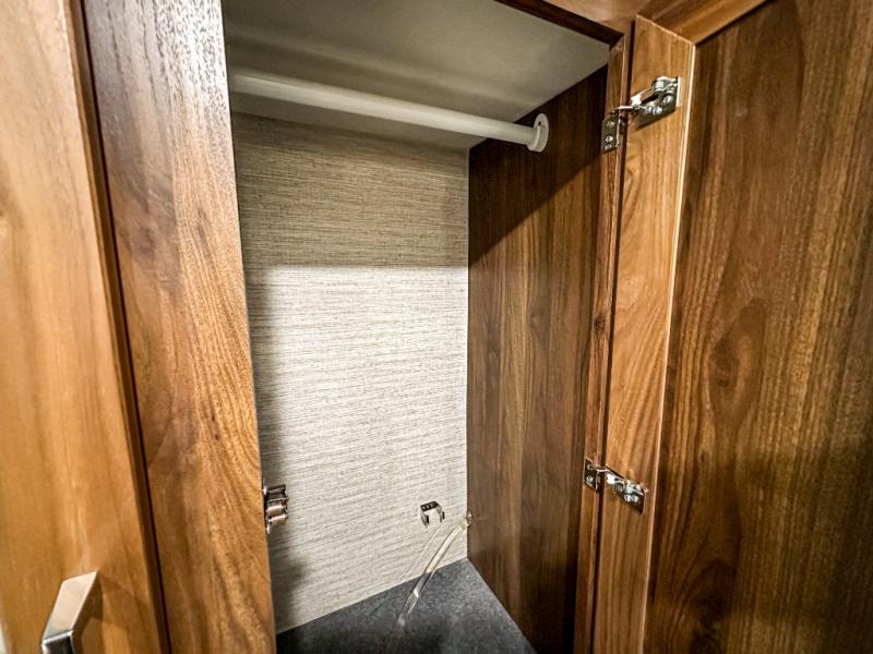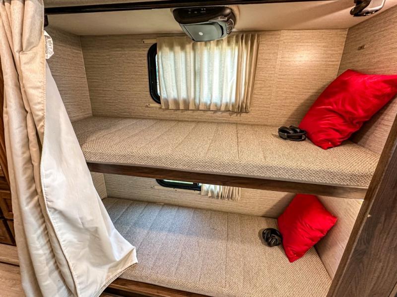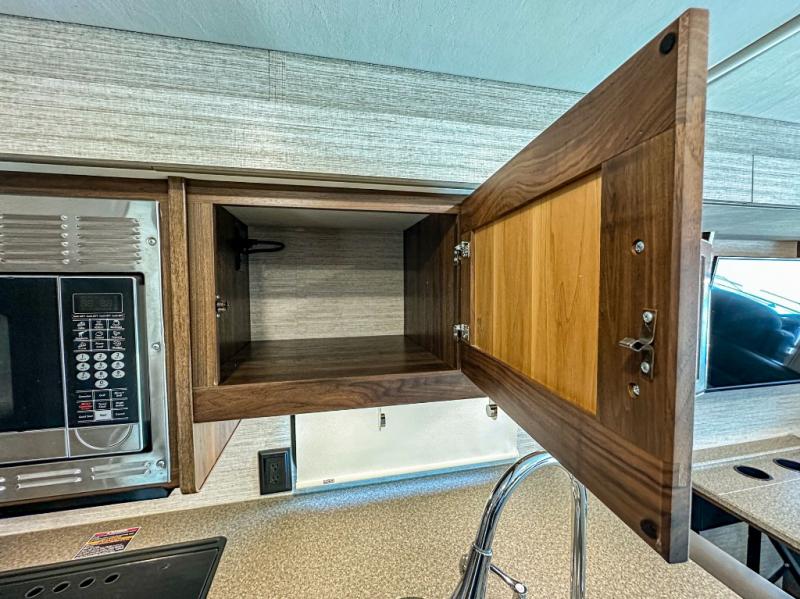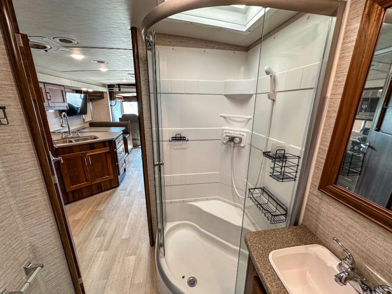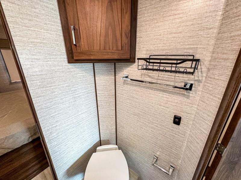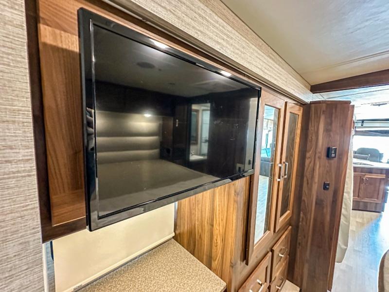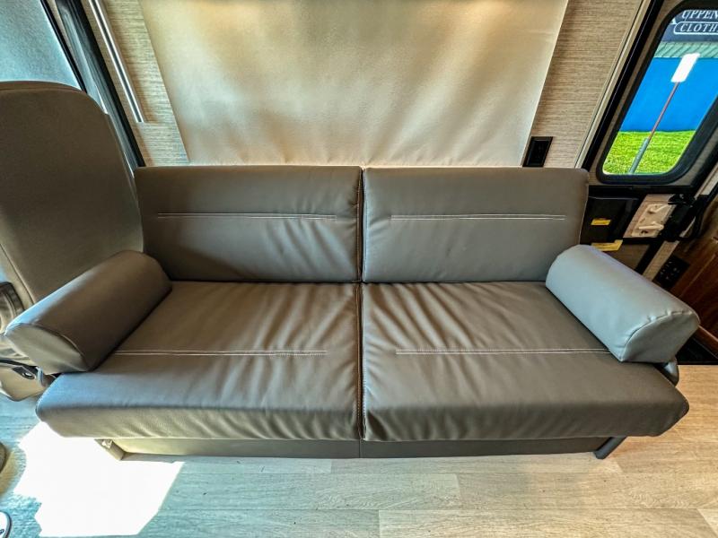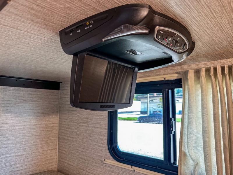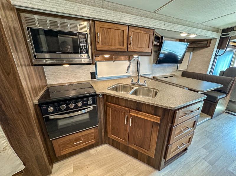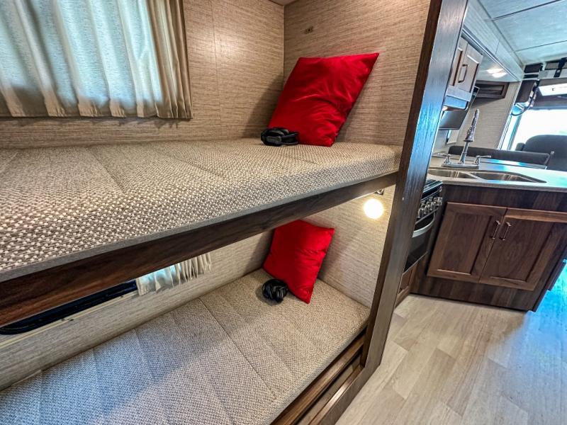 Tailgating in this RV is super fun with the exterior 32" HDTV, the powered patio awning with LED lighting, plus the included Tailgate package which provides a refrigerator, a three-drawer cabinet, LED lights, Quick-Connect LP house, a steel sink, a wall mounted bottle opener, a garbage bag holder, and a paper towel holder. When you want to carry the party inside, there is a sofa/bed, a dinette with Hi-Lo table, and the captain's seats that swivel giving you more seating to visit. When it's time for bed, the the mid-coach bunk beds, and the optional StudioLoft bed will provide sleeping space as well as the furniture. You will find storage throughout in overhead cabinets, in the bedroom wardrobe, and the exterior compartments.