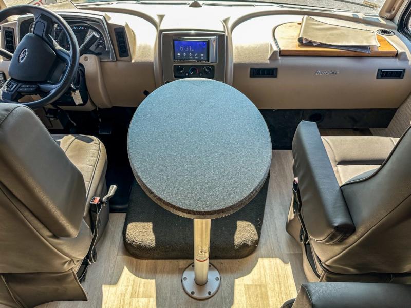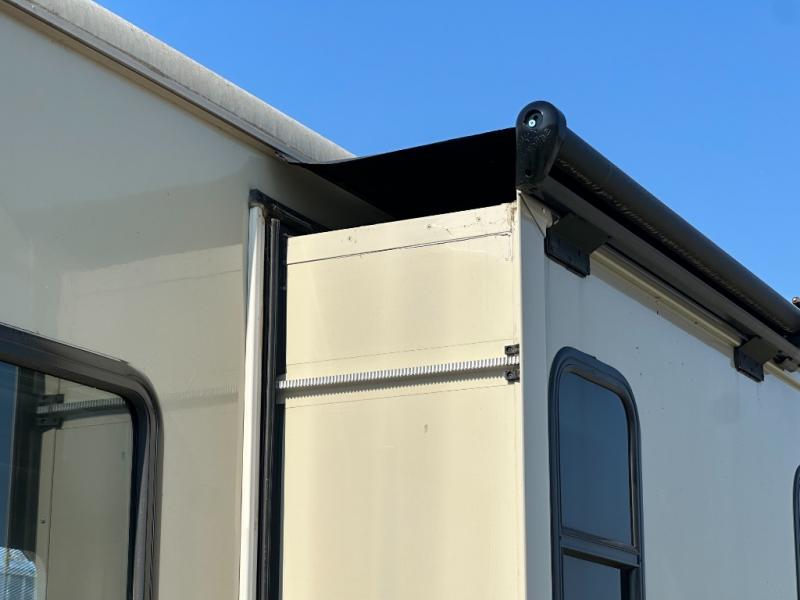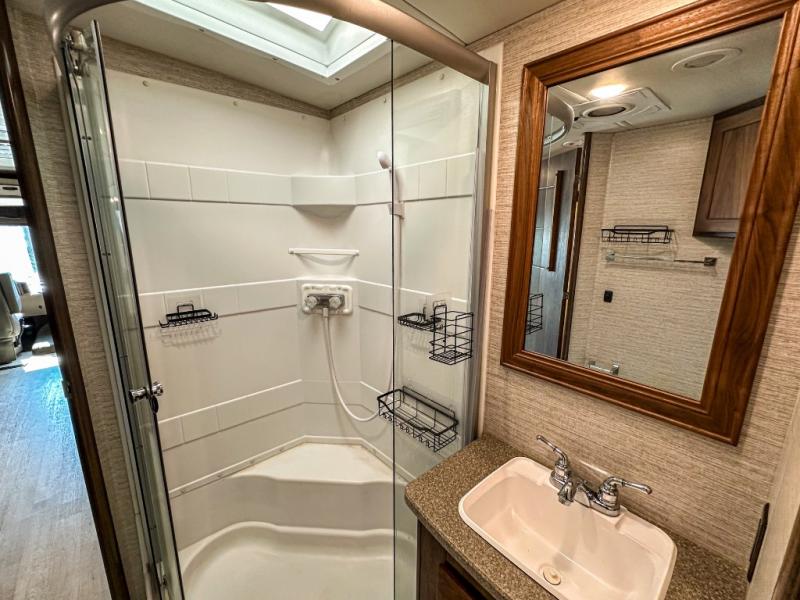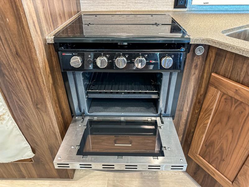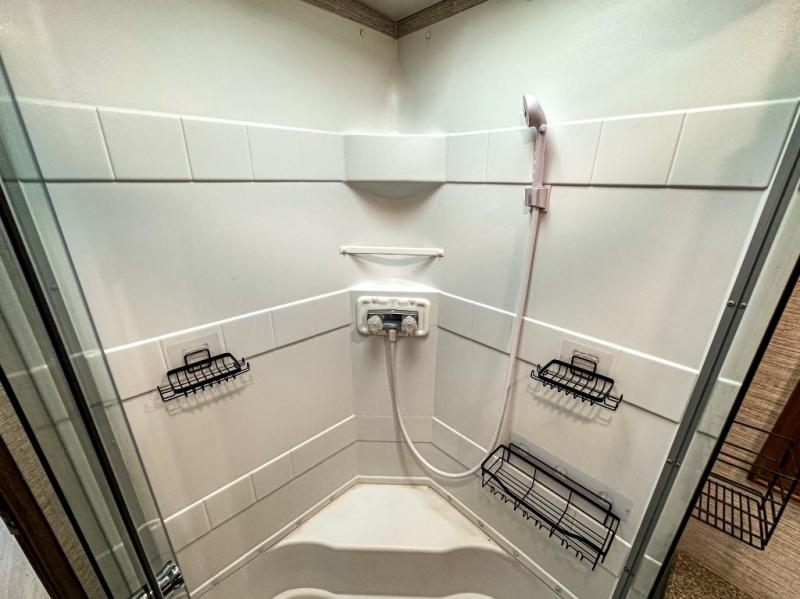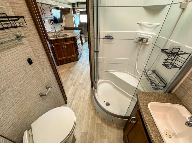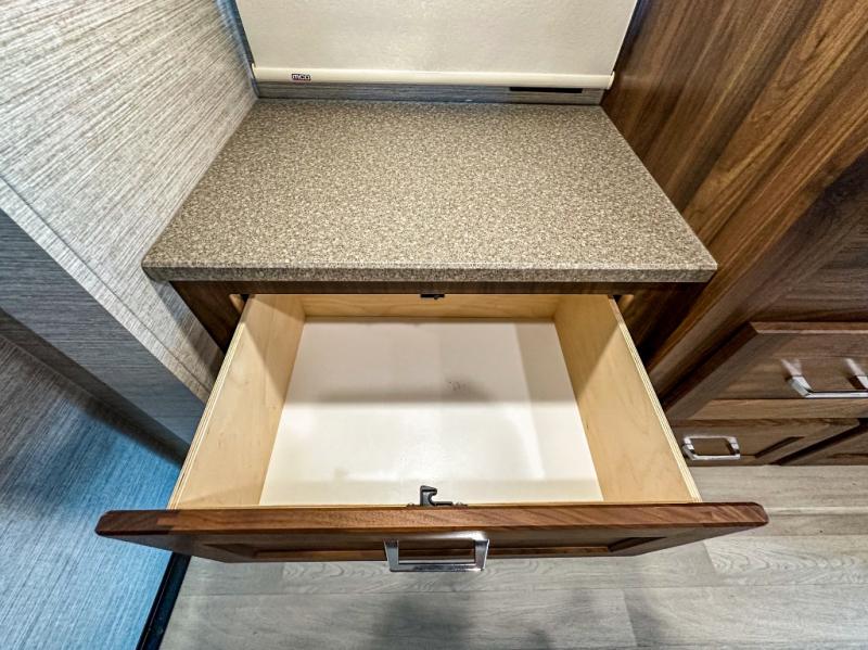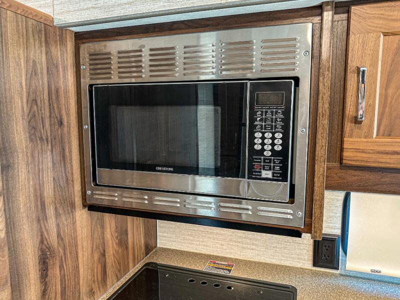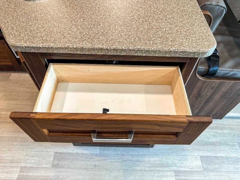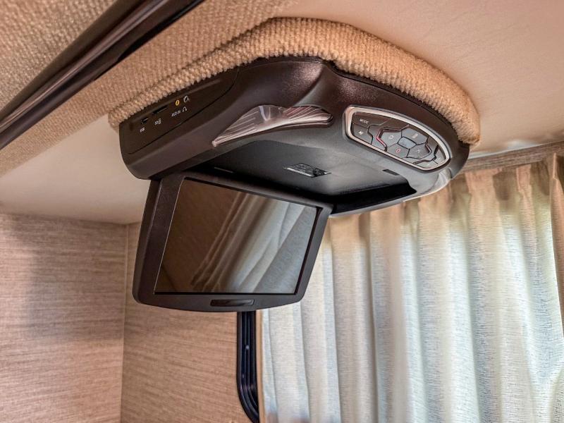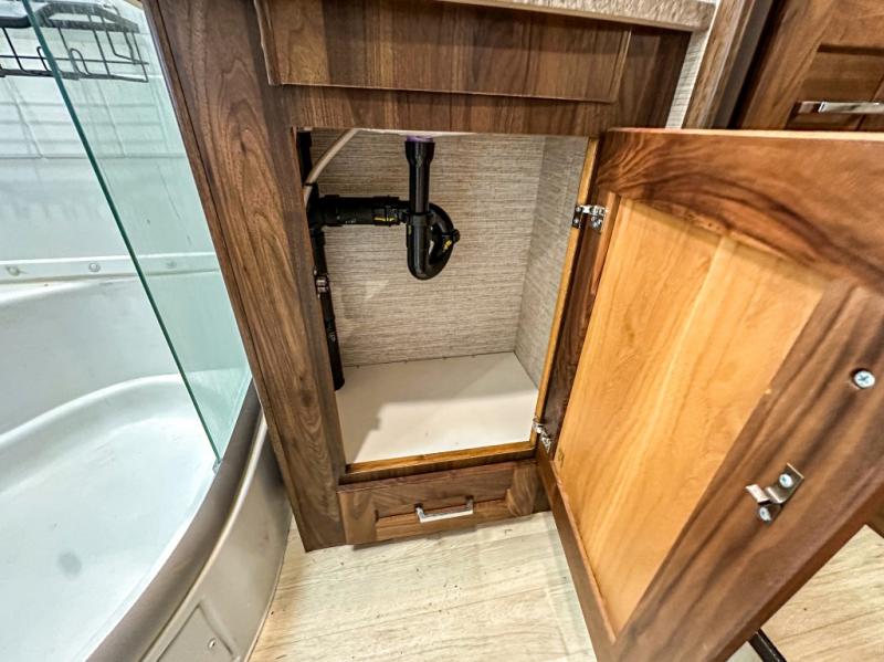 Tailgating in this RV is super fun with the exterior 32" HDTV, the powered patio awning with LED lighting, plus the included Tailgate package which provides a refrigerator, a three-drawer cabinet, LED lights, Quick-Connect LP house, a steel sink, a wall mounted bottle opener, a garbage bag holder, and a paper towel holder. When you want to carry the party inside, there is a sofa/bed, a dinette with Hi-Lo table, and the captain's seats that swivel giving you more seating to visit. When it's time for bed, the the mid-coach bunk beds, and the optional StudioLoft bed will provide sleeping space as well as the furniture. You will find storage throughout in overhead cabinets, in the bedroom wardrobe, and the exterior compartments.