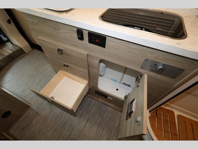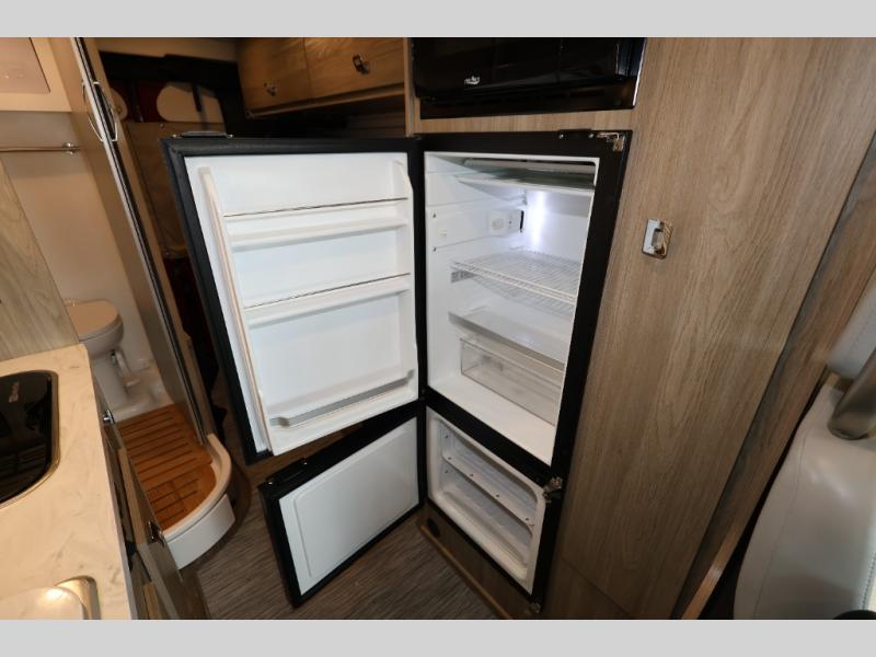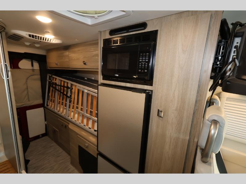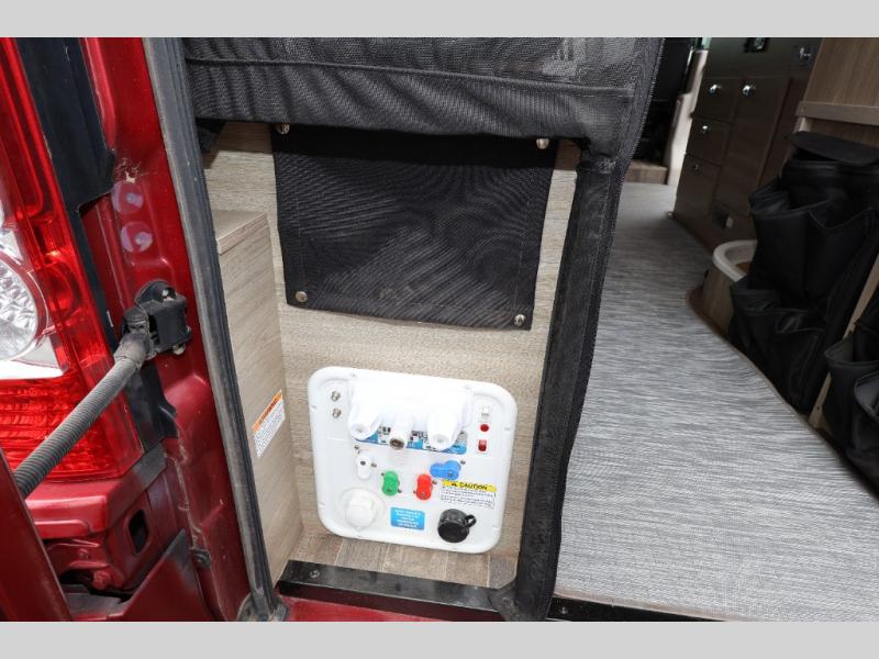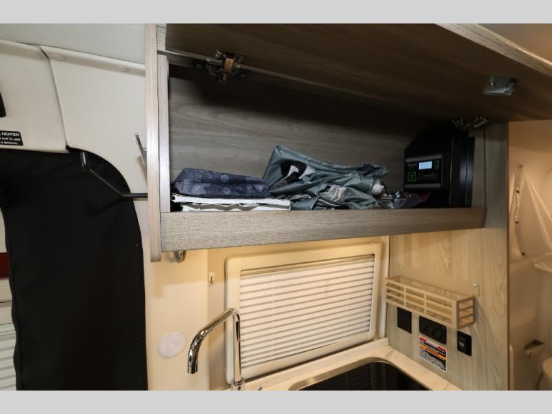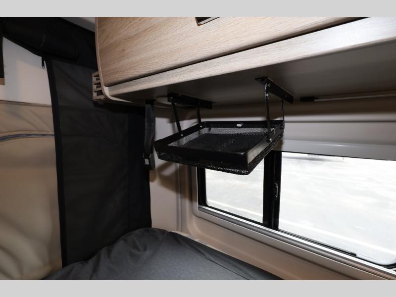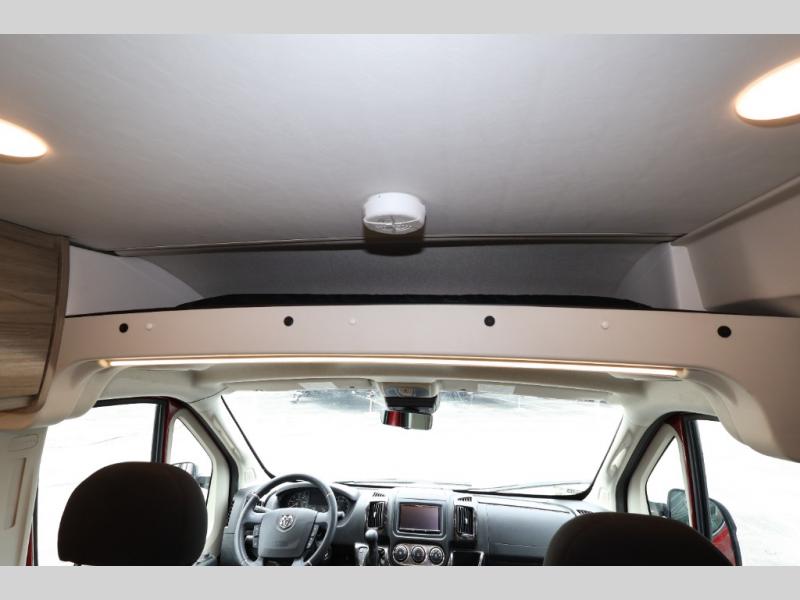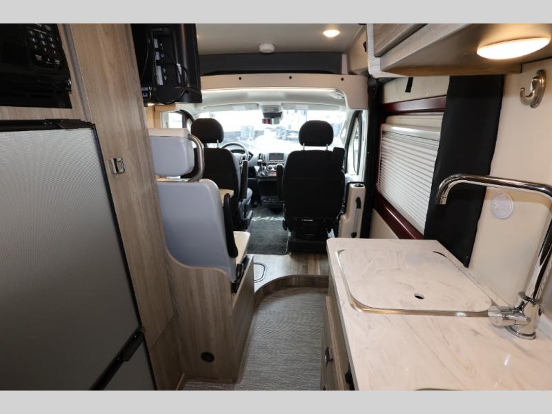 Efficiency meets comfort in the Travato Class B gas motorhome by Winnebago. The 215W solar panels and the energy management system allow you to go off-grid when the adventure calls for it, and the Coleman Mach 10 NDQ A/C will keep you comfortable during the hot summer months. If the weather is nice out, set up the power awning with LED lights or stay inside with the side and rear screen doors closed to keep the bugs out. Each model includes plenty of storage space, including RAM Tough-Track Mounts throughout, Anything Keeper drop-down storage baskets, plus below-floor storage for your outside gear. The Travato also includes a Corian countertop and a spice rack in the galley, a convenient medicine cabinet and mirror in the bath, plus LED ceiling lights throughout to keep everything bright and open! Some of the new additions to the Travato are the Bluetooth sound bar, Honeycomb composite insulated flooring, convenience door strap, and the monitor panels that have been relocated above the sliding door.