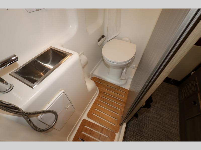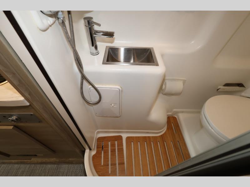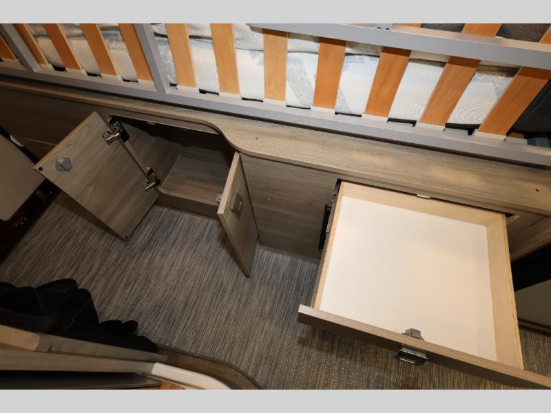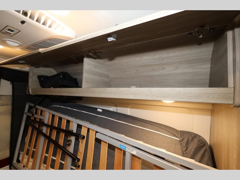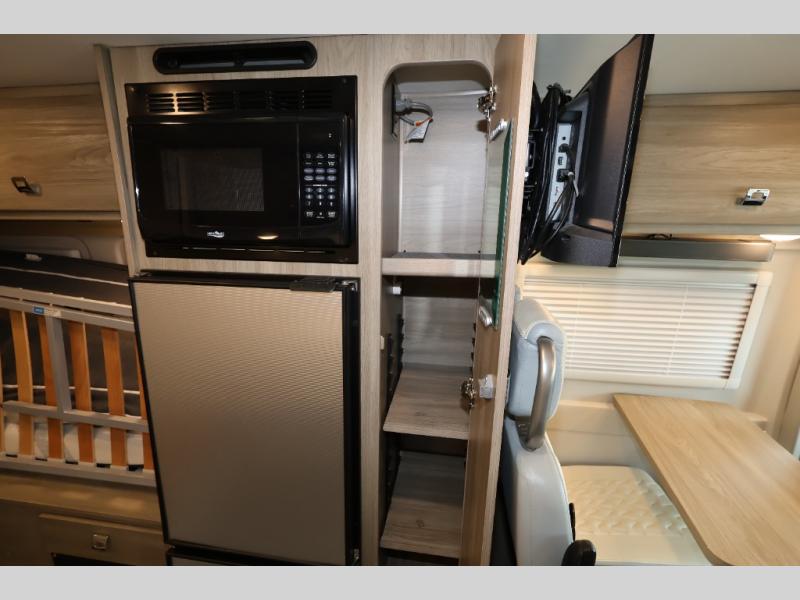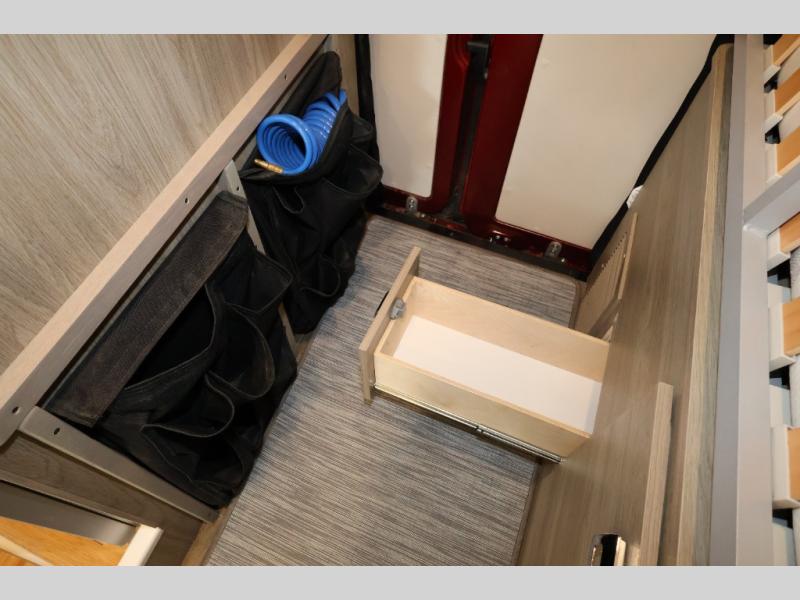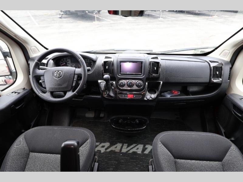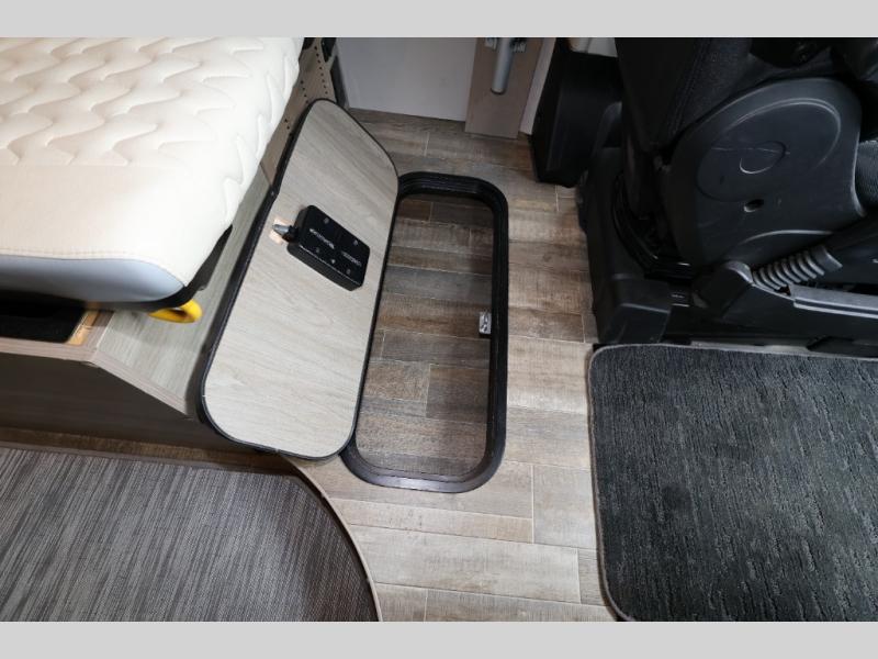 Efficiency meets comfort in the Travato Class B gas motorhome by Winnebago. The 215W solar panels and the energy management system allow you to go off-grid when the adventure calls for it, and the Coleman Mach 10 NDQ A/C will keep you comfortable during the hot summer months. If the weather is nice out, set up the power awning with LED lights or stay inside with the side and rear screen doors closed to keep the bugs out. Each model includes plenty of storage space, including RAM Tough-Track Mounts throughout, Anything Keeper drop-down storage baskets, plus below-floor storage for your outside gear. The Travato also includes a Corian countertop and a spice rack in the galley, a convenient medicine cabinet and mirror in the bath, plus LED ceiling lights throughout to keep everything bright and open! Some of the new additions to the Travato are the Bluetooth sound bar, Honeycomb composite insulated flooring, convenience door strap, and the monitor panels that have been relocated above the sliding door.