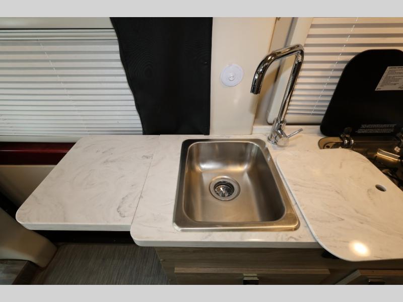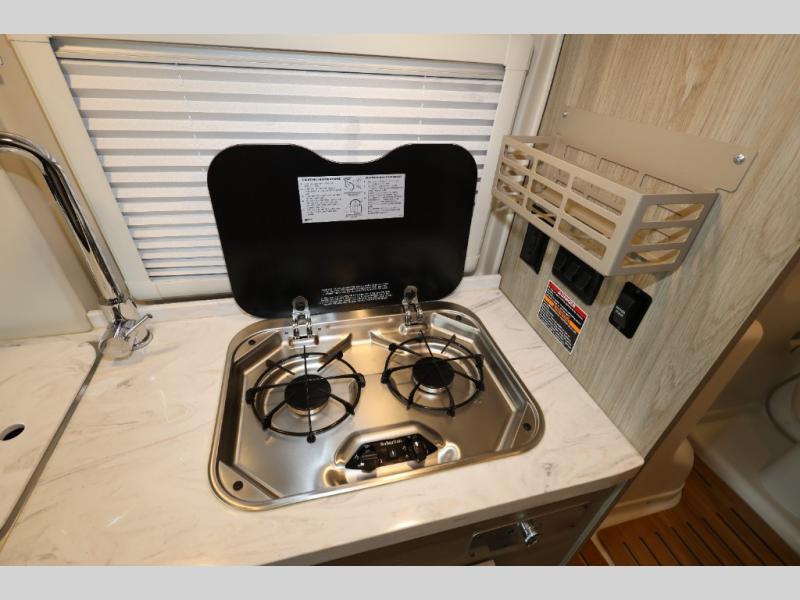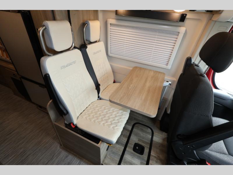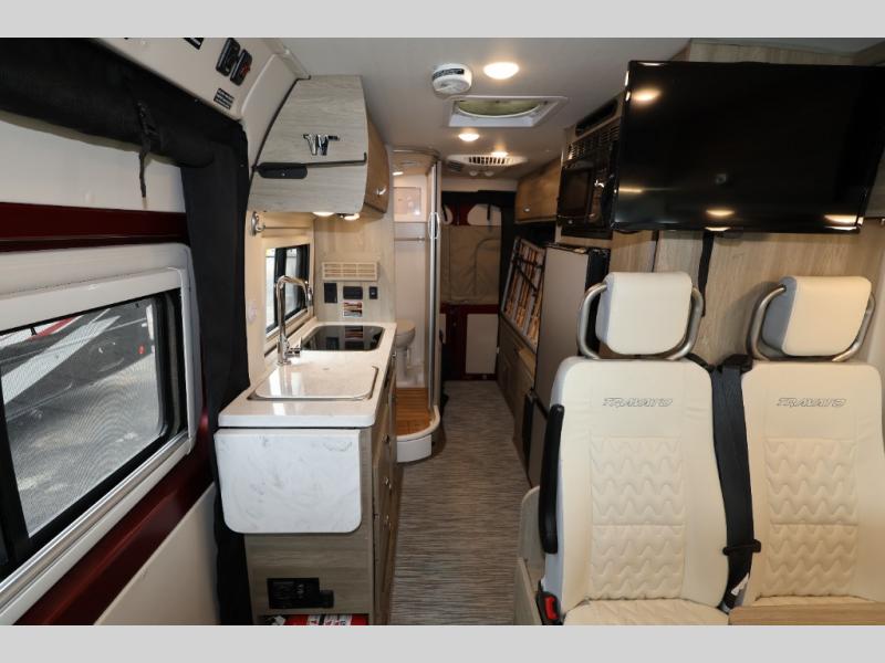 Set out on a new adventure in this Travato Class B gas motorhome. The swivel cab seats feature adjustable lumbar support and comfortable armrests so that you will enjoy the drive just as much as the destination. You can prepare meals each day on the two-burner cooktop, and the flip-up countertop extension will provide space to cut fresh veggies. There is also a pantry and a two-door refrigerator/freezer to store food for the week. The additional cab seats have an adjustable/removable table in front of them to give you a place to dine at each day, and there is a 49" x 77" bed in the back for you and your spouse!