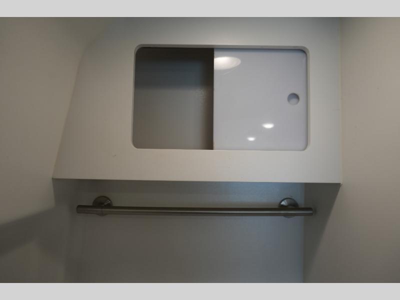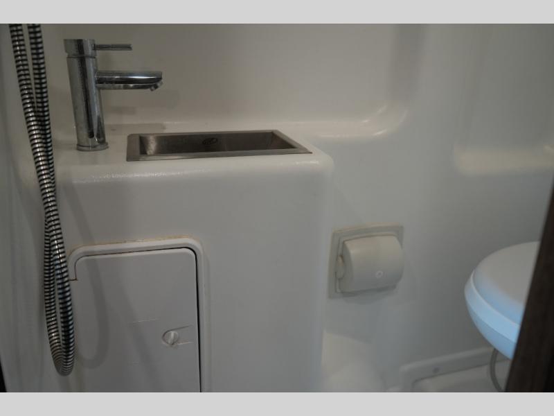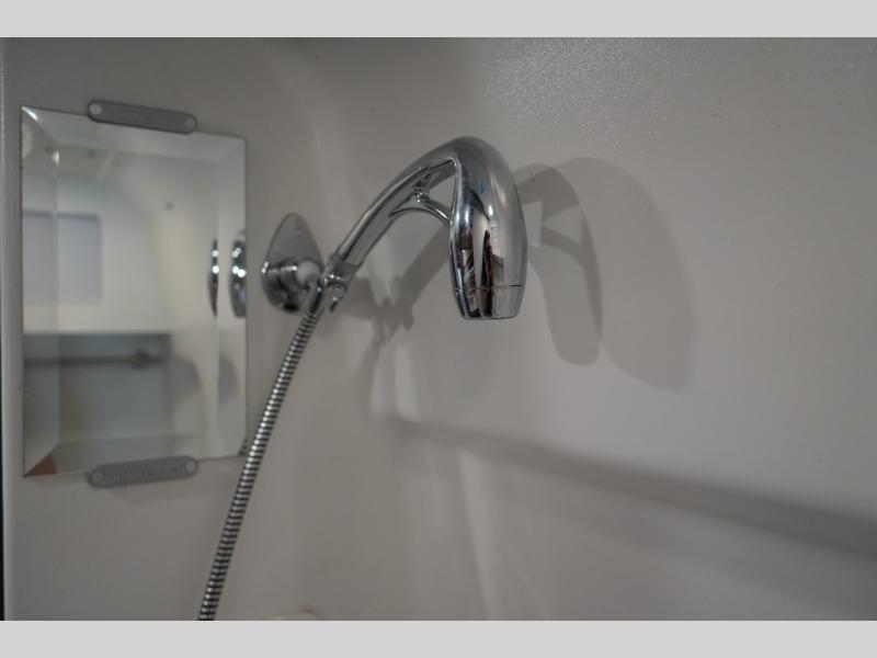 Enjoy the convenience of a full onboard bathroom with a space-saving design, complete with a medicine cabinet and mirrored door. -