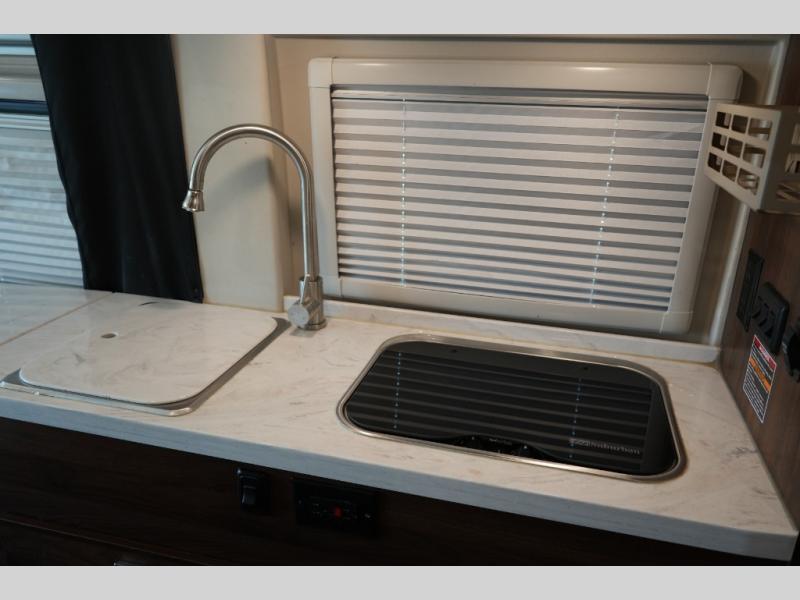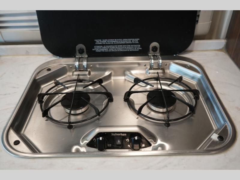 Includes a Corian countertop, two-burner cooktop, pantry, two-door refrigerator/freezer, and a flip-up extension for extra prep space. A built-in spice rack adds a touch of home. -