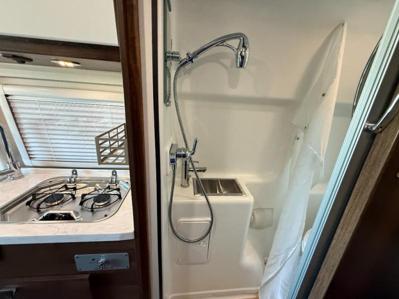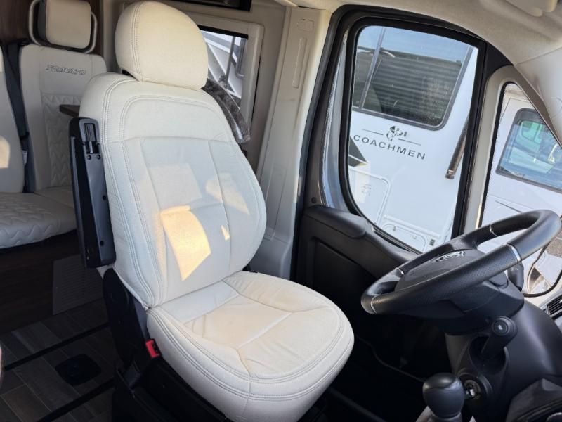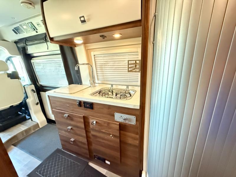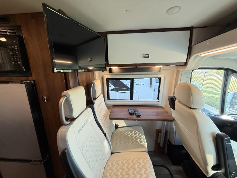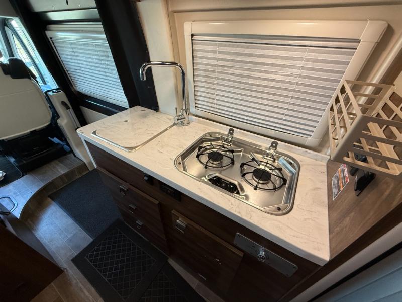 Set out on a new adventure in this Travato Class B gas motorhome. The lithium Pure Energy Management System provides 9,600 usable watt-hours of stored energy for extended power on your trip. You can prepare meals each day on the single-burner induction cooktop, and the flip-up countertop extension will provide space to cut fresh veggies. There is also a pantry and a two-door refrigerator/freezer to store food for the week. The extra cab seats give you a place to dine at each day with the adjustable/removable table in front of them, and there is a 49" x 77" bed in the back for you and your spouse!