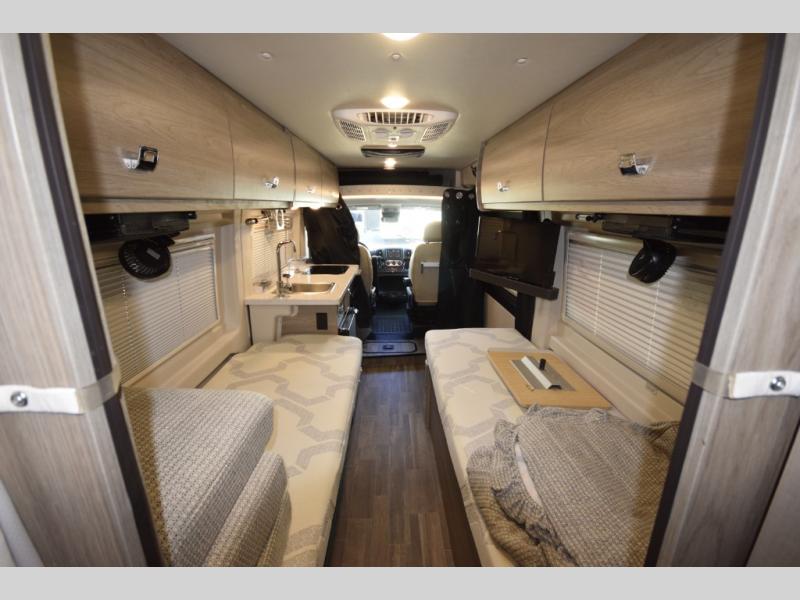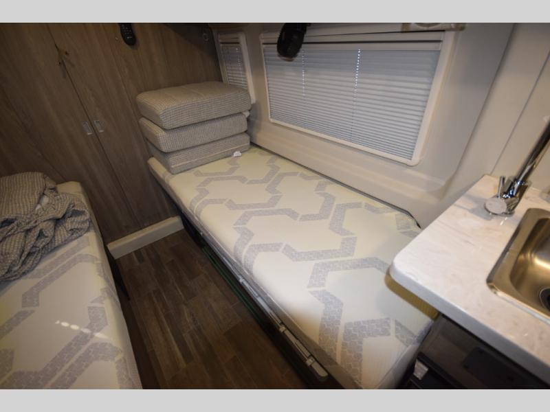 Step inside and discover how every inch of the Travato is designed for comfort and function. Two twin beds easily convert into a spacious king, offering flexible sleeping options whether you’re traveling solo or as a couple. The rear wet bath means you can freshen up anytime, anywhere—no campground facilities required.