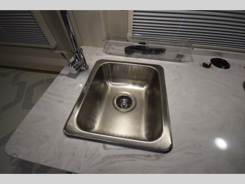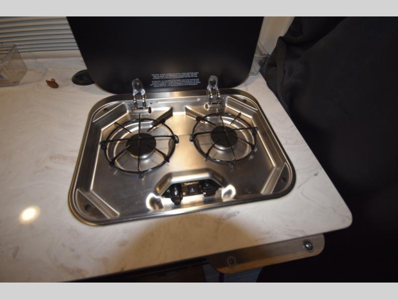 The galley kitchen is equipped to handle everything from quick snacks to full meals, featuring a two-burner cooktop, convection microwave, and Corian countertops with a pull-out extension for extra prep space. Swivel the driver and passenger seats to create a cozy dining or workspace setup, complete with a removable table for your morning coffee or laptop.