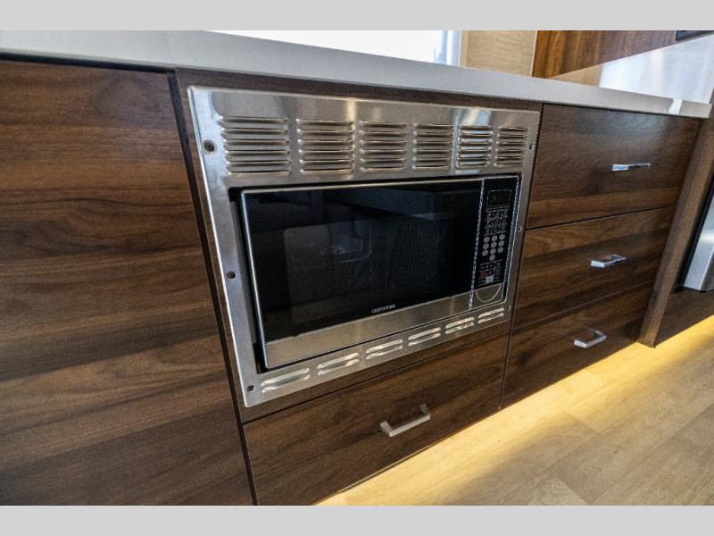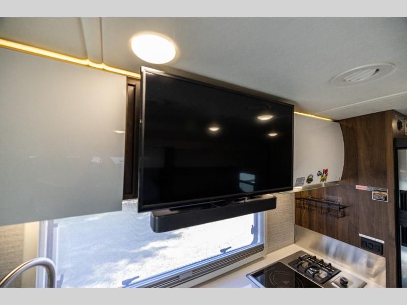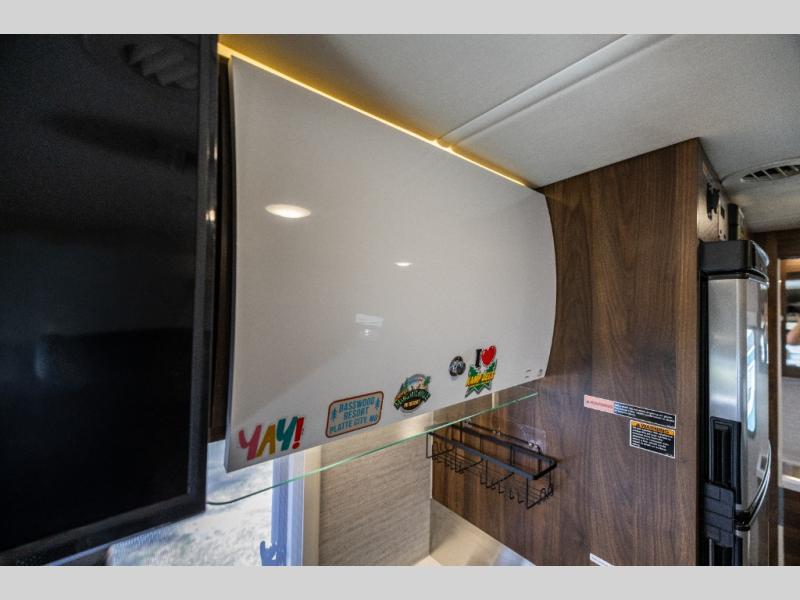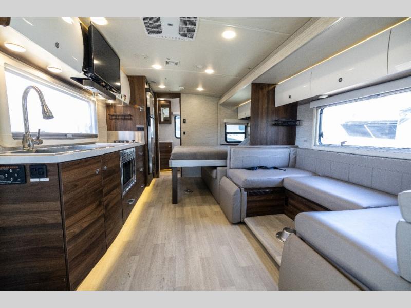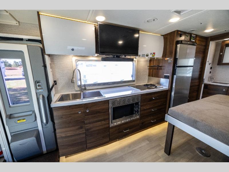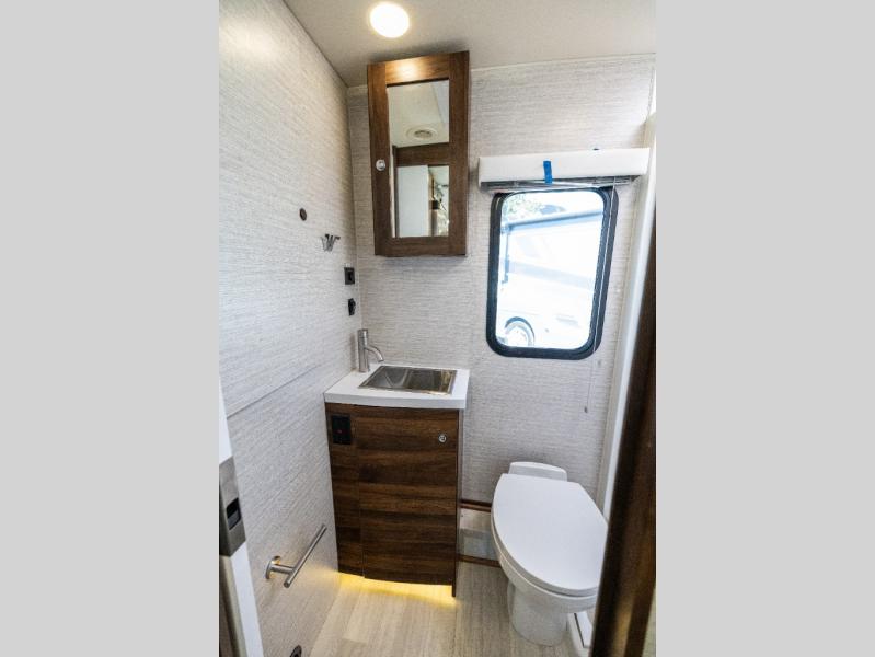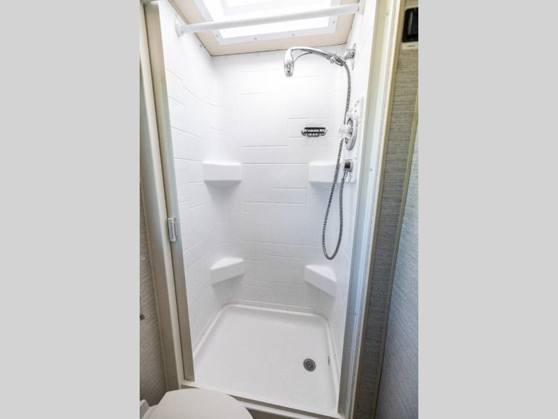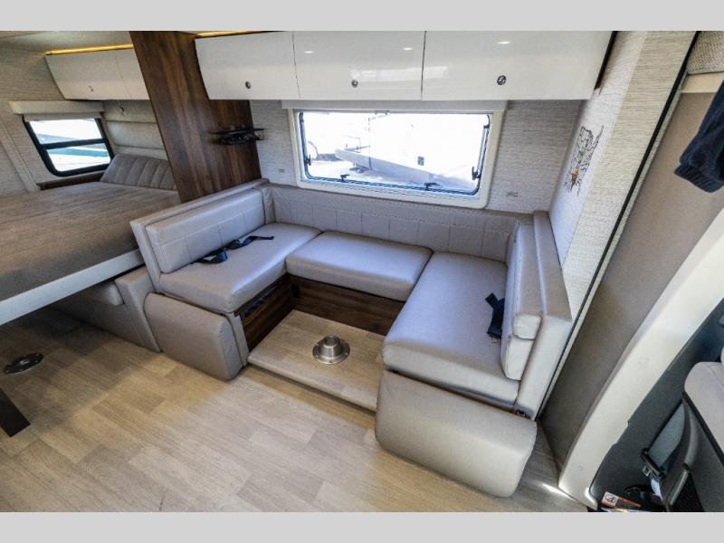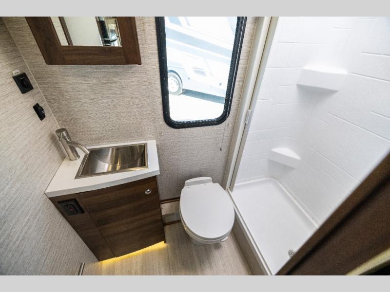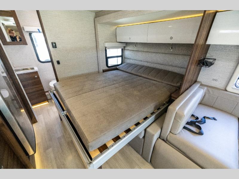 A couple or family will enjoy the look of the interior each time they take this View Class C diesel motorhome on the road. With the curved cabinets, the lighted soft-close galley drawers, and the sprung-cushion dinette and sofa seats, there will surely be a favorite feature for everyone. You will be able to easily set up the queen Murphy+ bed when it's time for bedtime while the kids sleep on the bunk above the cab or the U-shaped dinette. You might like to add the theater seating option with swivel tables if you don't need that extra sleeping space. Everyone can get cleaned up in the full rear bathroom that has a space-saving sliding door before making meals with full kitchen amenities including a convection microwave/oven.