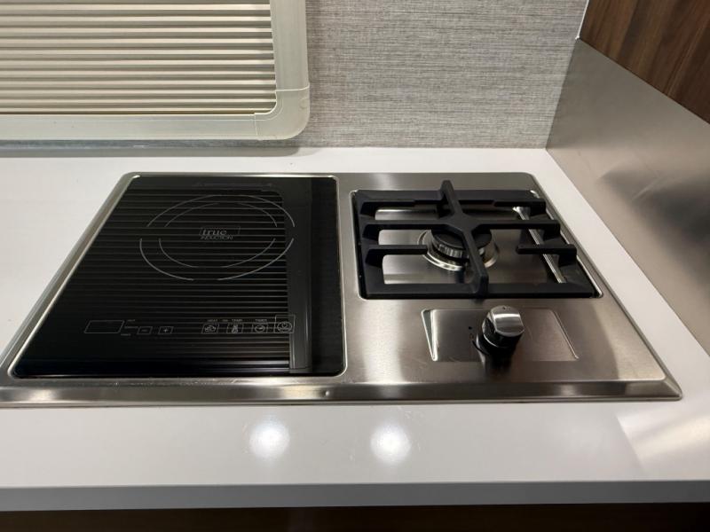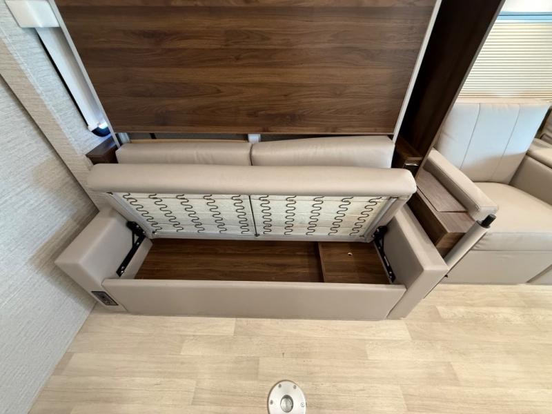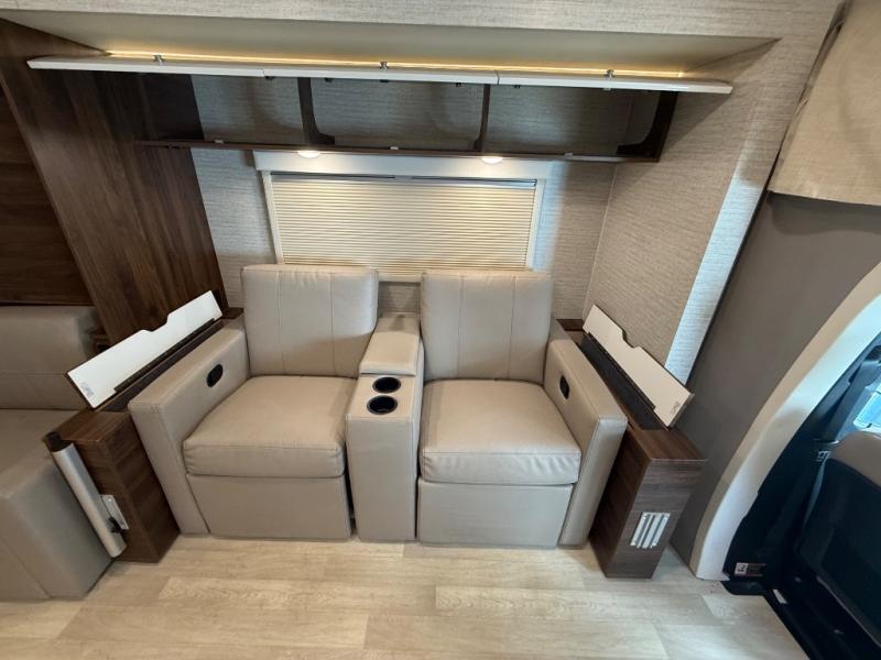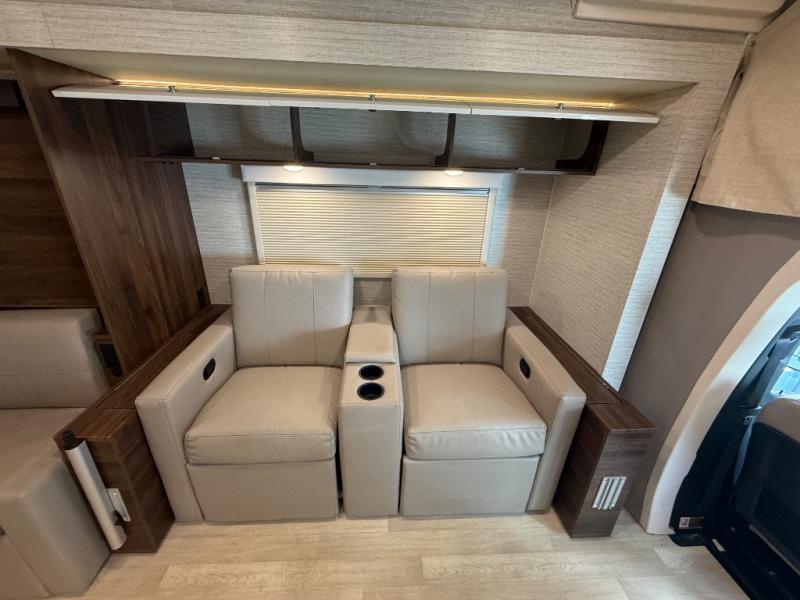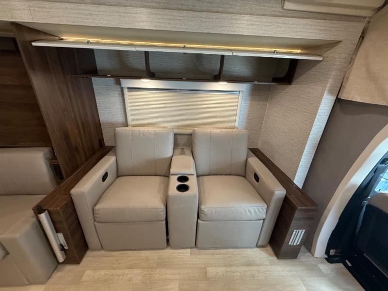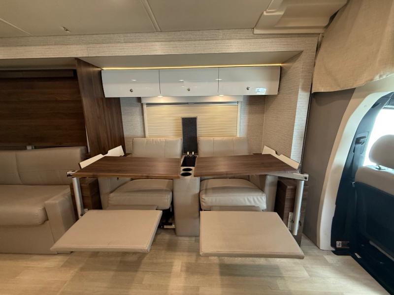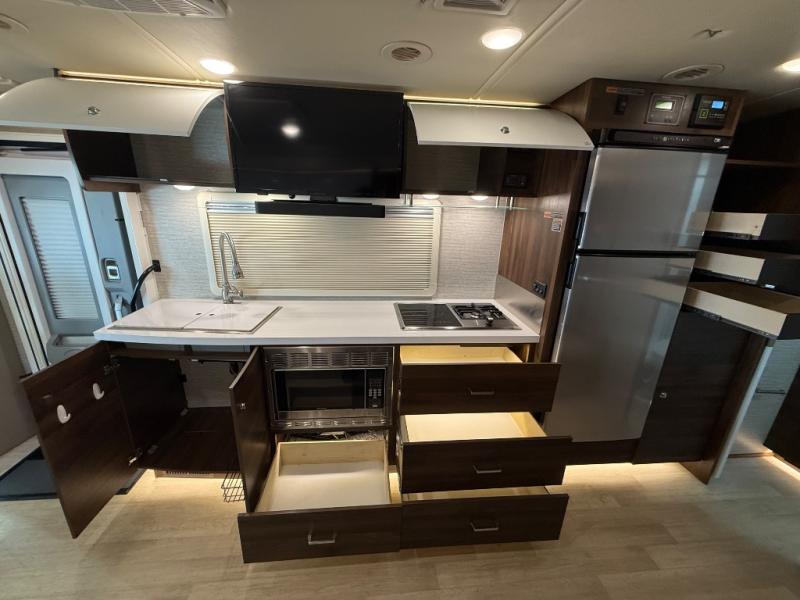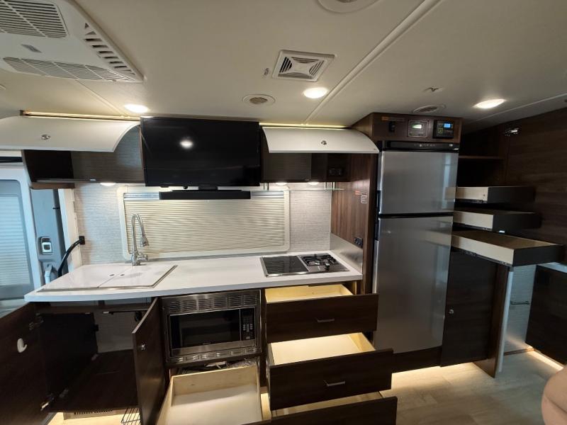 A couple or family will enjoy the look of the interior each time they take this View Class C diesel motorhome on the road. With the curved cabinets, the lighted soft-close galley drawers, and the sprung-cushion dinette and sofa seats, there will surely be a favorite feature for everyone. You will be able to easily set up the queen Murphy+ bed when it's time for bedtime while the kids sleep on the bunk above the cab or the U-shaped dinette. You might like to add the theater seating option with swivel tables if you don't need that extra sleeping space. Everyone can get cleaned up in the full rear bathroom that has a space-saving sliding door before making meals with full kitchen amenities including a convection microwave/oven.