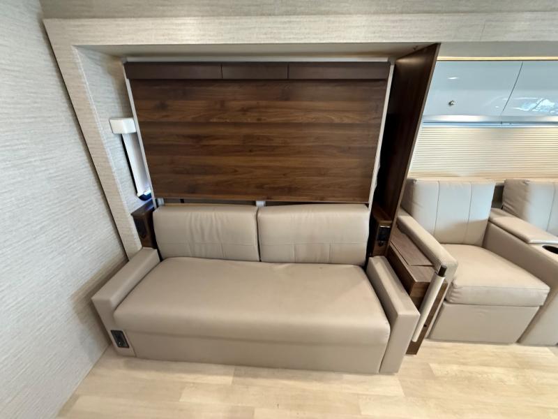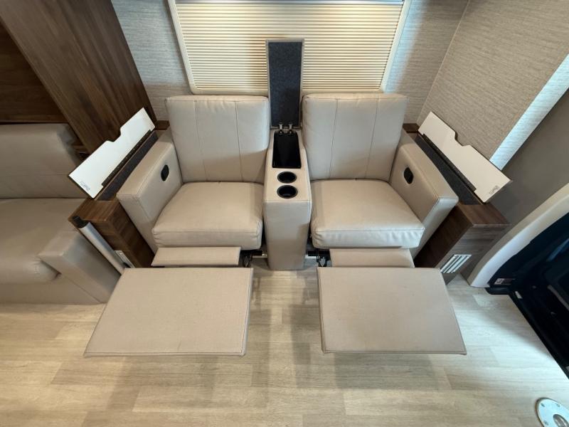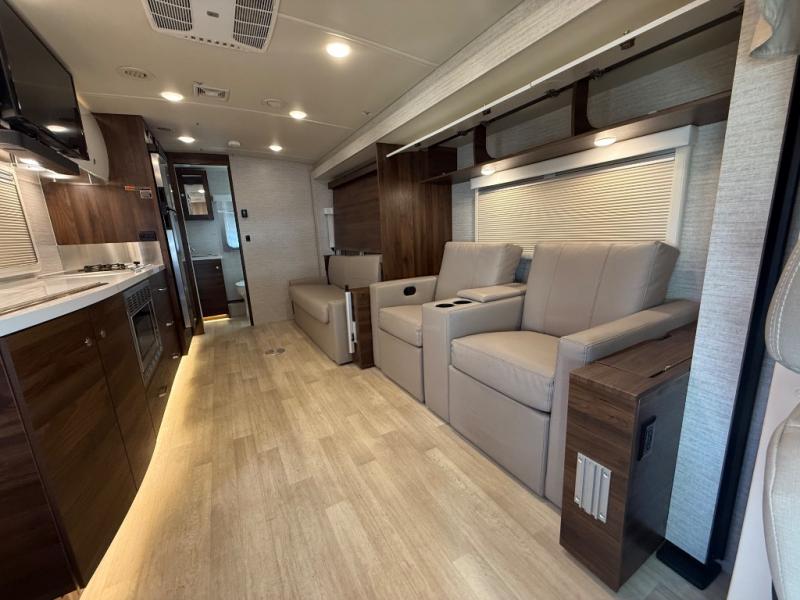 The rear living area offers comfortable seating — typically a sofa or a combination of theater seats and lounge seating.