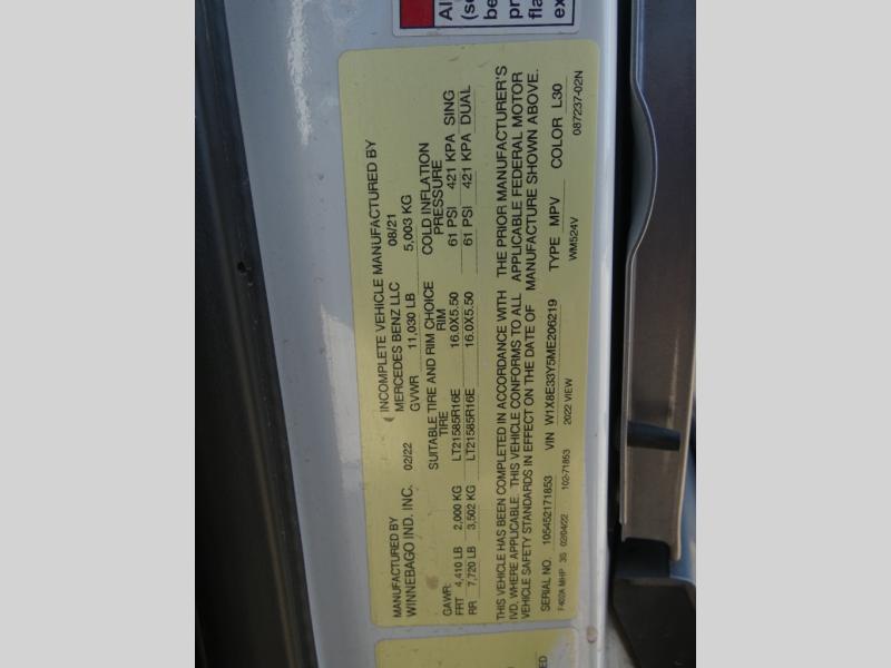 With each View Class C diesel motorhome by Winnebago, you can extend your trips off grid with the industry-leading holding tanks, the two 100W solar panels, the two deep-cycle Group 31 RV batteries, the 2,000W inverter, plus the 3,600W Cummins Onan MicroQuiet LP generator. The insulated sleeper deck is built with premium thermal and acoustic insulation allowing the SuperShell sleeper deck to be more comfortable and relaxing during any season. The View is built on a Mercedes-Benz Sprinter chassis with advanced safety features giving you peace of mind, and the MBUX touchscreen infotainment system has intelligent voice control, navigation, a Wi-Fi hotspot, and more! The interior offers luxury space and simple solutions for storage, plus it also has vinyl flooring and laminate countertops for easy clean-up.