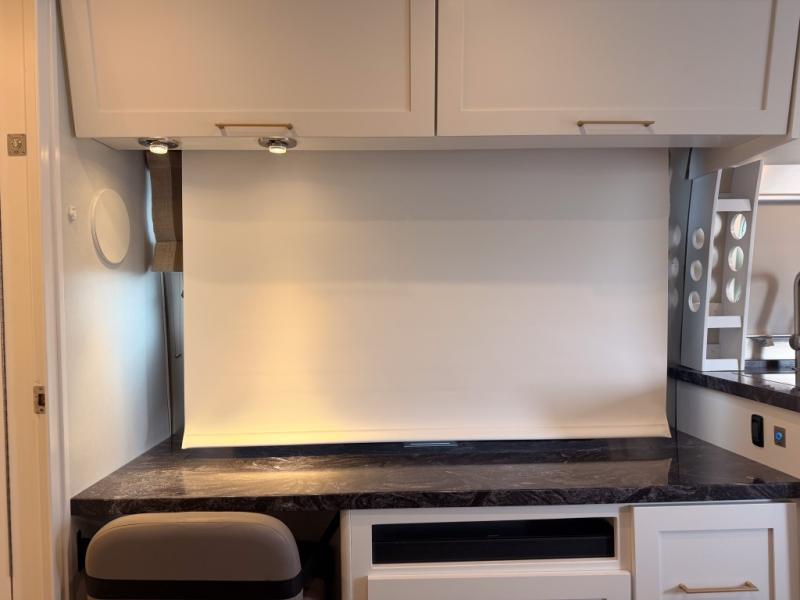 You're going to love this travel trailer that will feel more like home. The spacious full rear bath includes a large closet to hang all your clothes, a residential-style shower, and a heated towel bar you are sure to love. There is a workstation with an Ultraleather desk chair if you need to get some work done, and the media cabinet here houses the 60" projection TV. The chef of the family can prepare meals on the stainless steel three burner cooktop and convection microwave, and everyone can dine at the powered dinette.