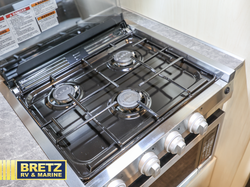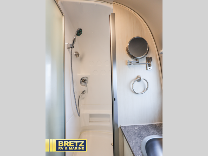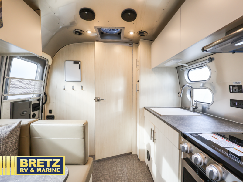 With each Flying Cloud travel trailer by Airstream, there are two axles, and each is built for ease of towing, plus there is a rear-view camera to make reversing and parking easier, and stainless steel front stone guards to protect the lower segments from road debris. The iconic Airstream design is created outside and inside by the semi-monocoque aluminum superstructure, the temperature reducing one-piece white aluminum roof, the panoramic front windows, and the stylish aluminum wheels. The interior will have you feeling right at home with handcrafted cabinetry, plenty of storage and counter space, sleek roller blinds and blackout curtains, plus residential style faucets!