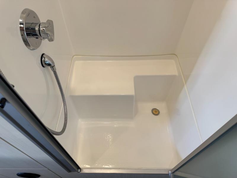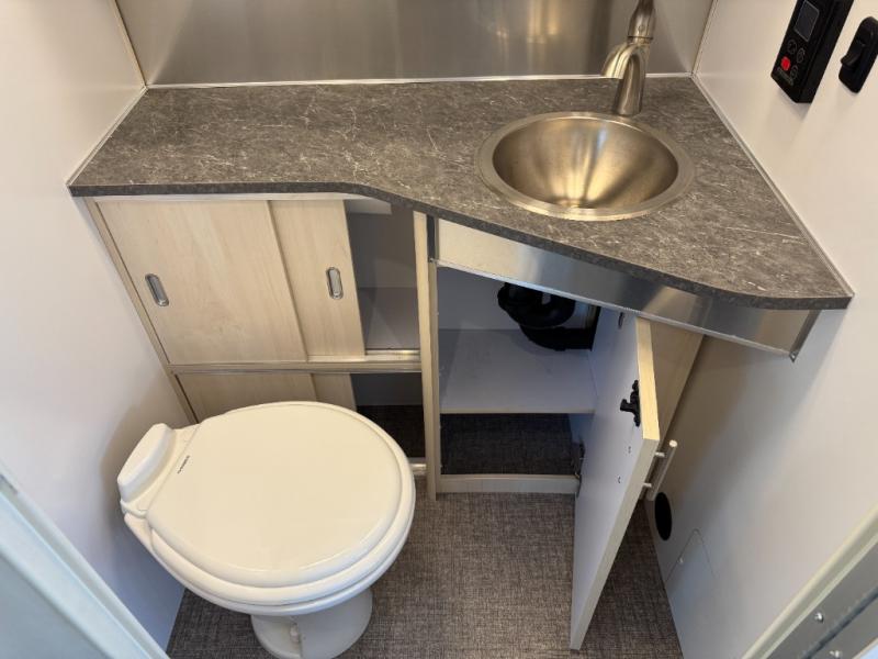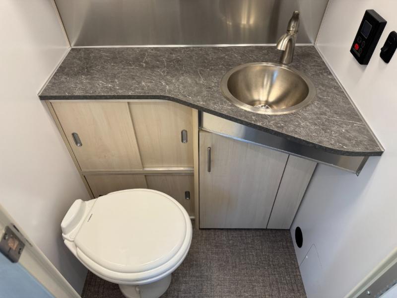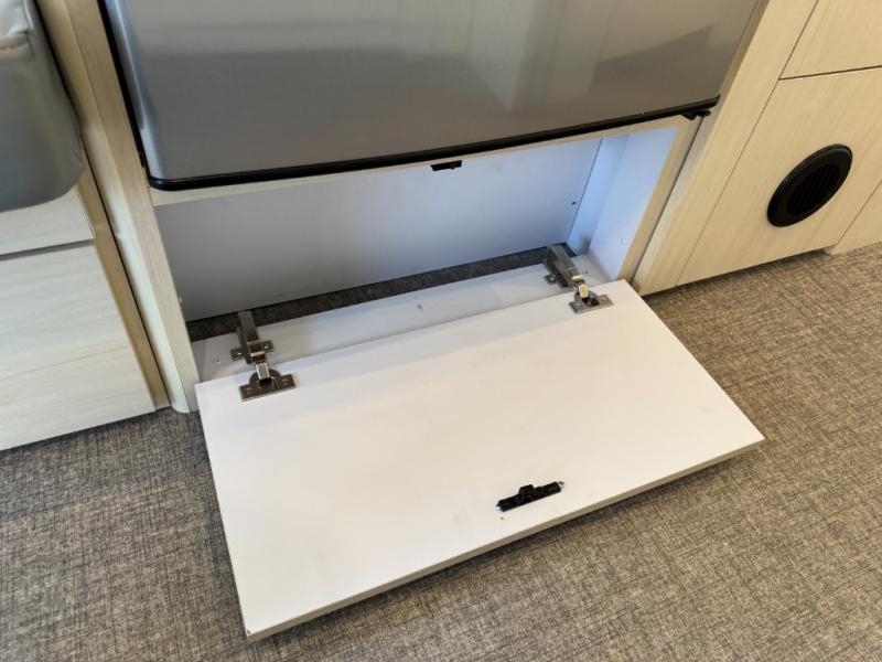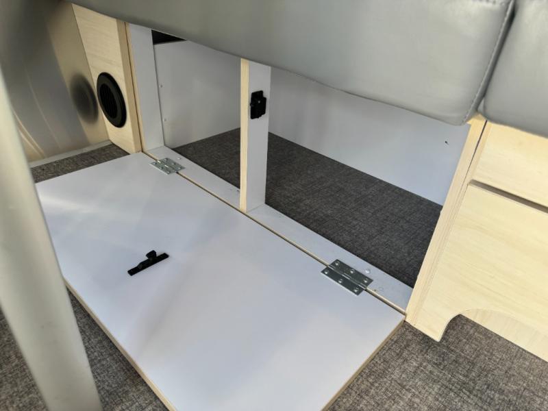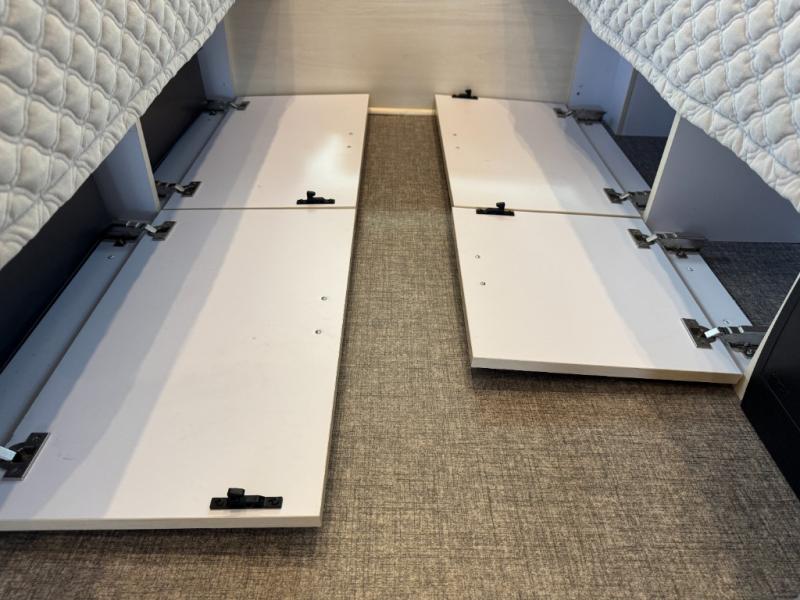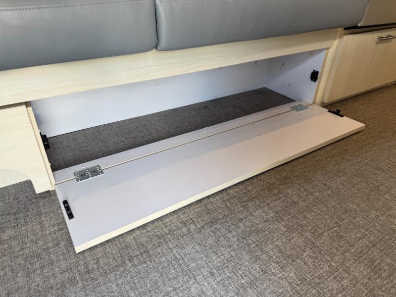 When you enjoy the finer things when traveling, this trailer will provide that for you plus lots of natural lighting and plenty of conveniences. The convertible rear dinette offers a place to dine and socialize for four, and there is a lounging area along the side with a TV on the wall. The table acts as a sturdy base below the cushions when you need some sleeping space. The front bedroom offers more panoramic windows and comfortable twin beds with a view each morning and night. There is floor space in the center and a nightstand for extra storage and charging space. You will find storage for your clothing, and a split bathroom with a half bath on one side and a shower that stands independently across the hall. And the kitchen offers everything you need to make meals including extra counter space and a refrigerator for leftovers. And there is a rear hatch option for this trailer.